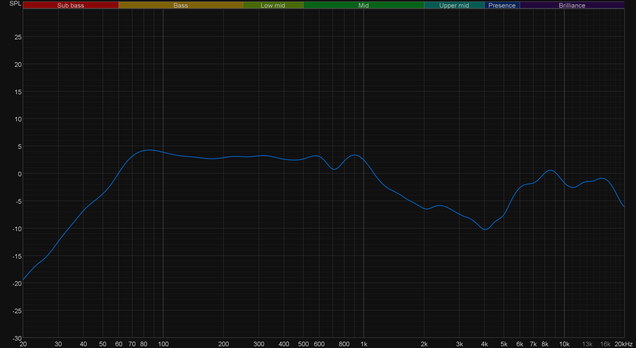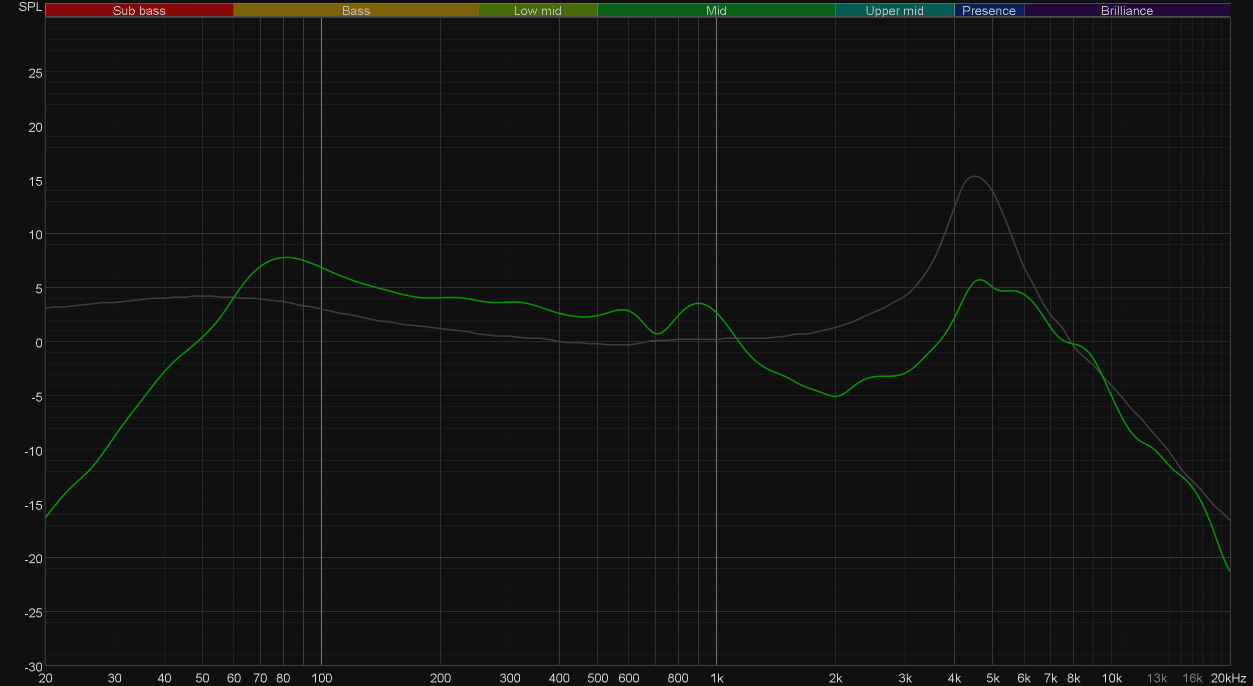 Графики АЧХ показаны на фоне целевой кривой, предоставленной производителем используемого стенда. Она является адаптированным под конкретное устройство аналогом так называемой «кривой Хармана», созданной командой Harman International под руководством доктора Шона Олива. Люди неодинаково воспринимают звук разной частоты, поэтому даже самые точные измерения могут не соответствовать реальному пользовательскому опыту. Для компенсации этих различий и используется целевая АЧХ. Близкое к ней звучание оценивалось сотнями участников экспериментов как нейтральное, сбалансированное, естественное и так далее. Скомпенсируем полученный графики АЧХ в соответствии с целевой кривой.