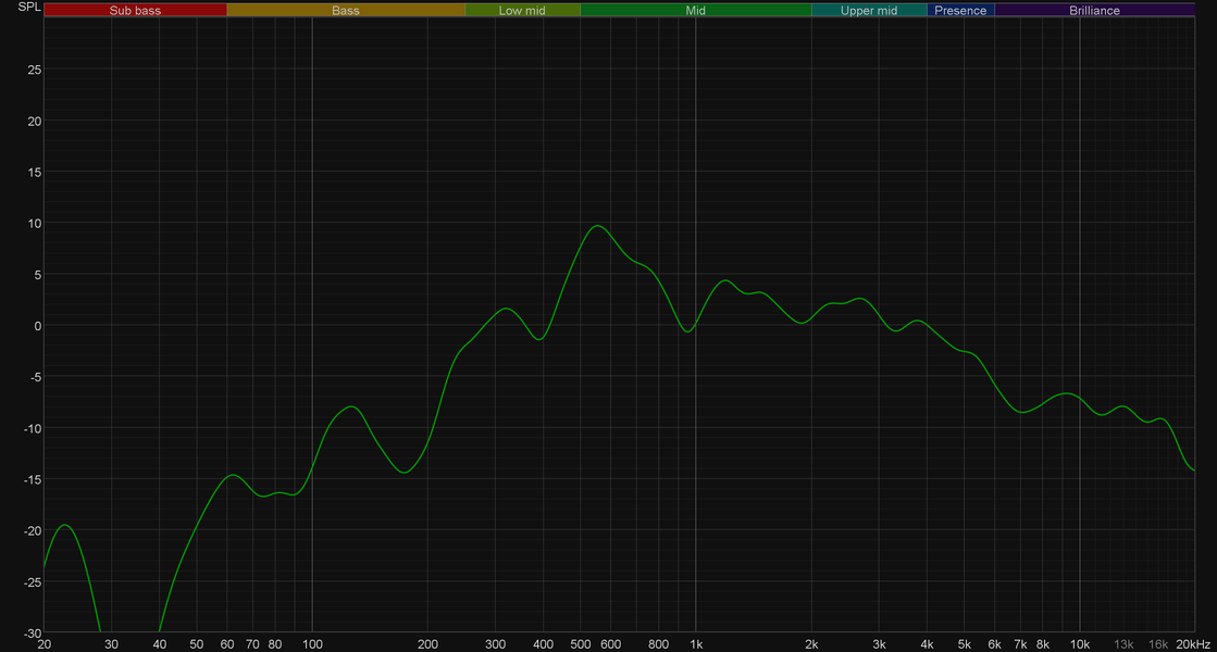 Настроен микрофон вполне логично, учитывая его предназначение: НЧ-диапазон подрезан, чтобы избавиться от разного рода шумов и лишней реверберации помещения, правда чуть сильнее, чем это делается обычно. Далее мы видим пик в области средних частот, ну и спад в ВЧ-регистре.