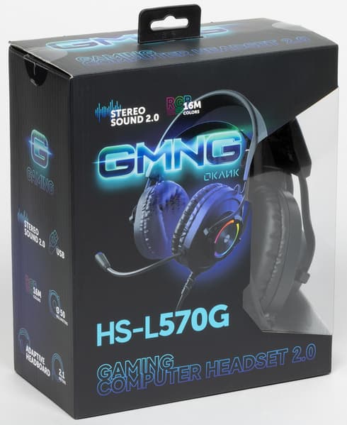 Поставляется GMNG HS-L570G в картонной коробке, на которую нанесено название гарнитуры и ее изображение. Внутри устройство удерживается небольшой картонной вставкой, упаковка при этом не самая плотная — транспортировать наушники стоит поаккуратнее, а при покупке лишний раз проверить сохранность.