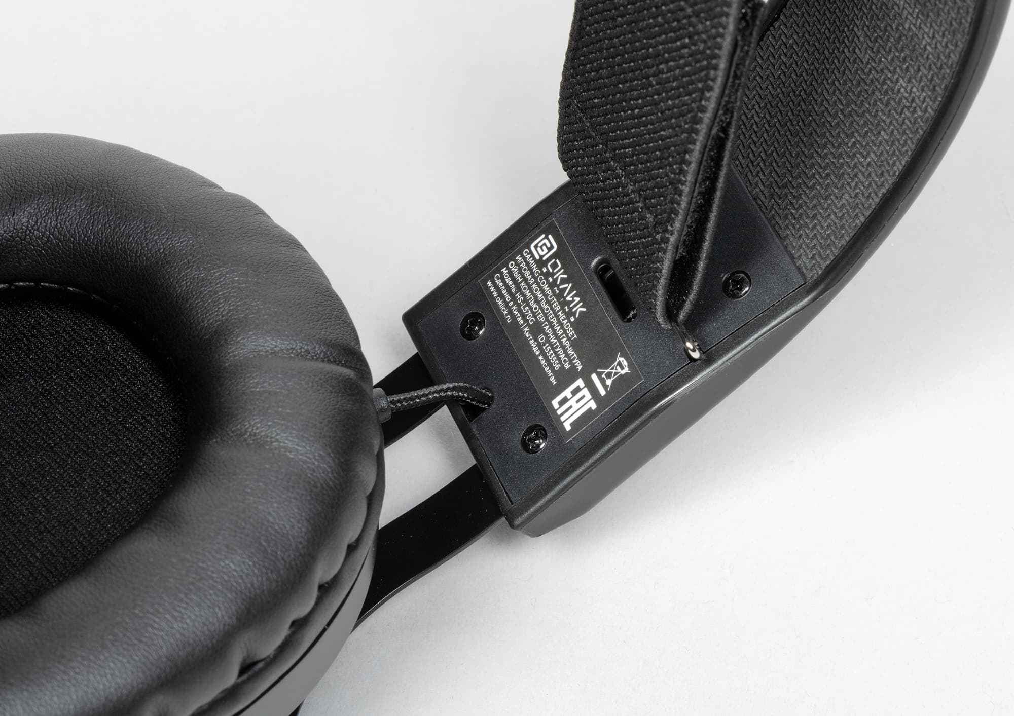На внутренней части дуги возле крепления чашек находятся скобы, за которые крепится эластичный элемент, обеспечивающий опору наушников на голову пользователя.