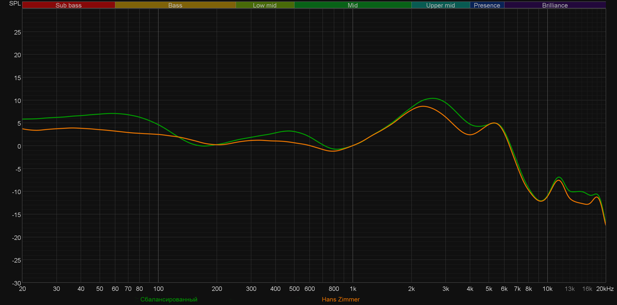 Конечно, было очень интересно, что же сделал со звучанием гарнитуры Ханс Циммер. А поступил он довольно предсказуемо: убрал акцент на басу и «горб» в районе нижней середины. При активации названного его именем профиля звук становится максимально сбалансированным и ровным — любителям «мониторного» звучания точно понравится.