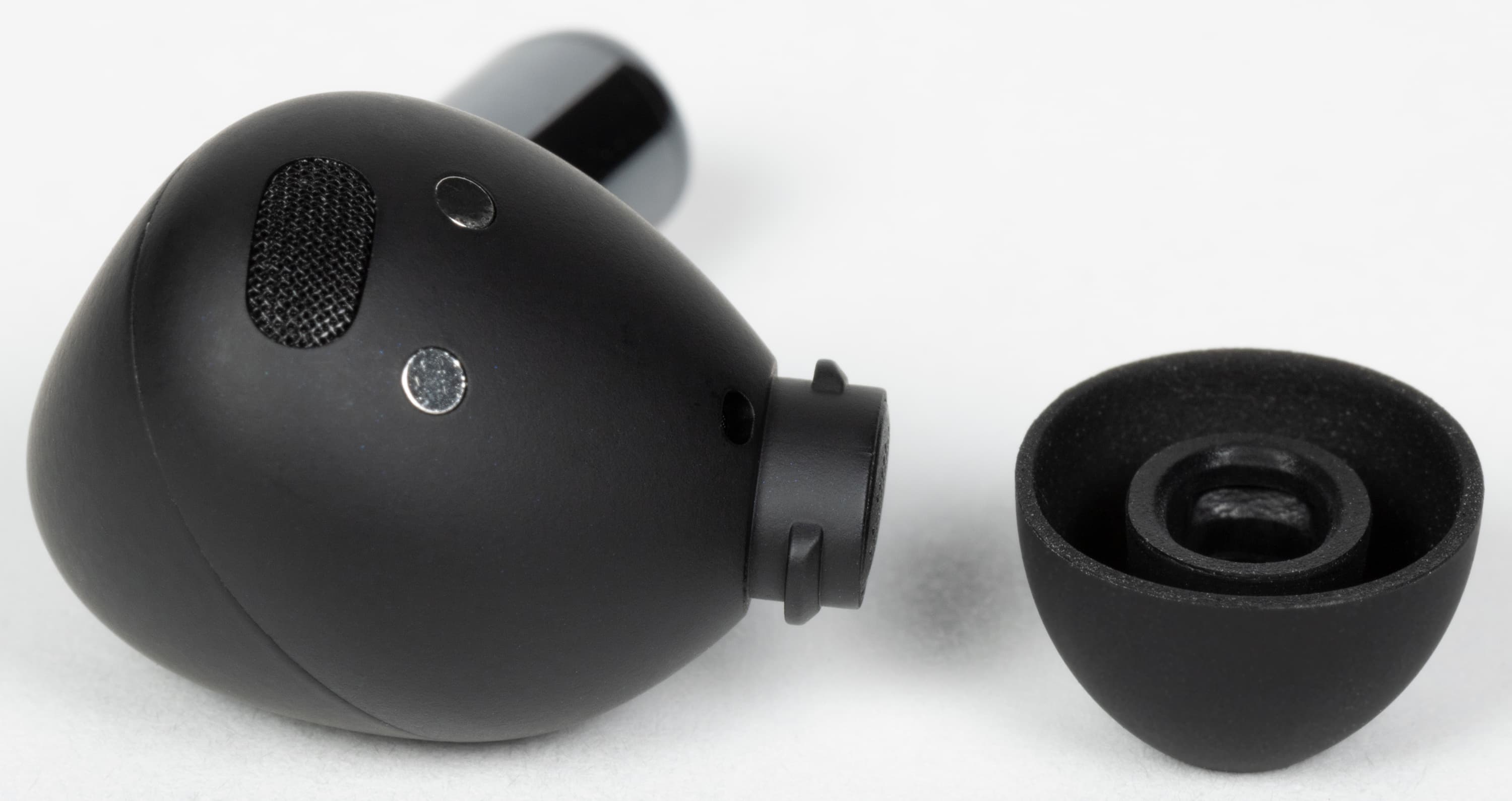 Рядом с носиком звуковода видно компенсационное отверстие, служащее для сброса лишнего давления при работе динамического драйвера. Отверстия звуководов прикрыты пластиковой сеткой. С их очисткой тоже не возникает вопросов, да и делать это часто не придется с учетом наличия защитных элементов внутри силиконовых насадок.