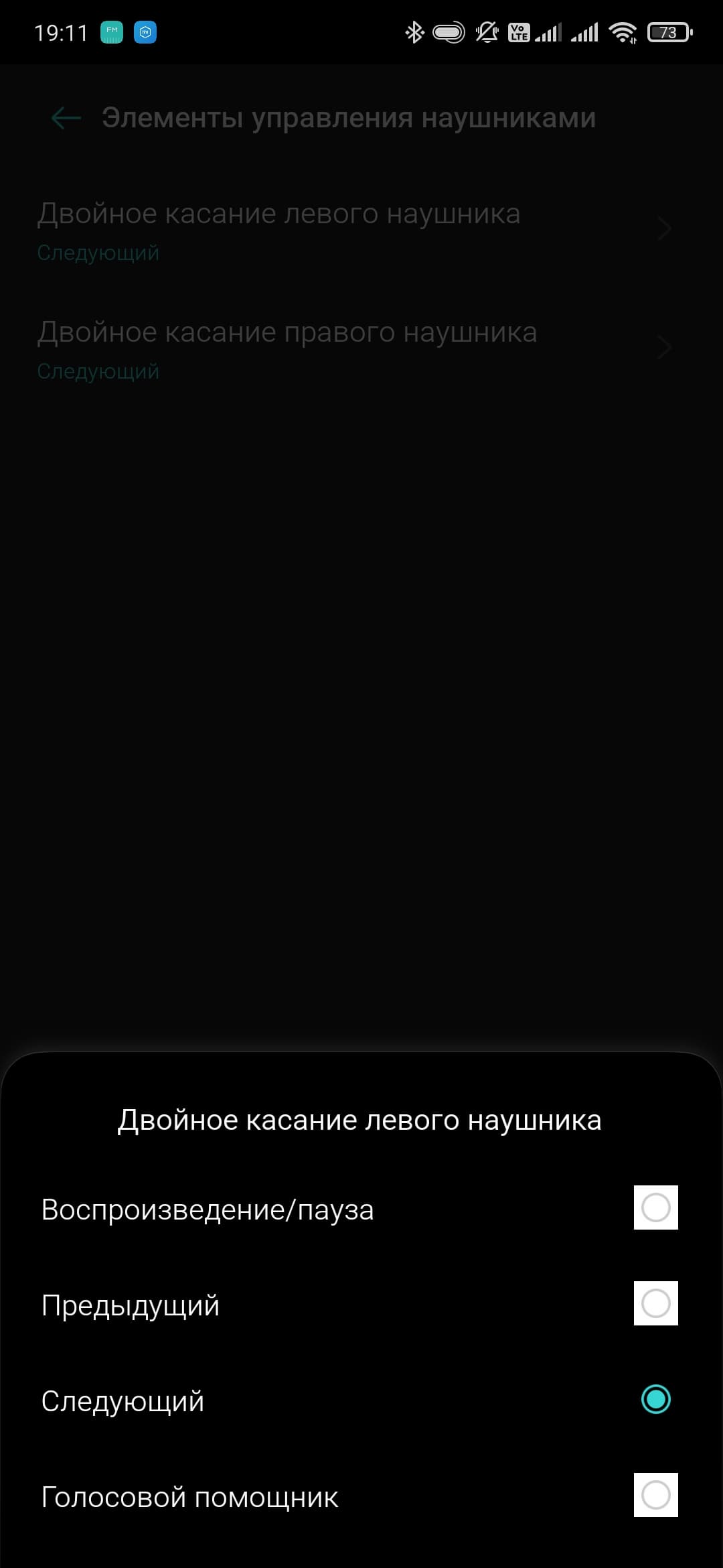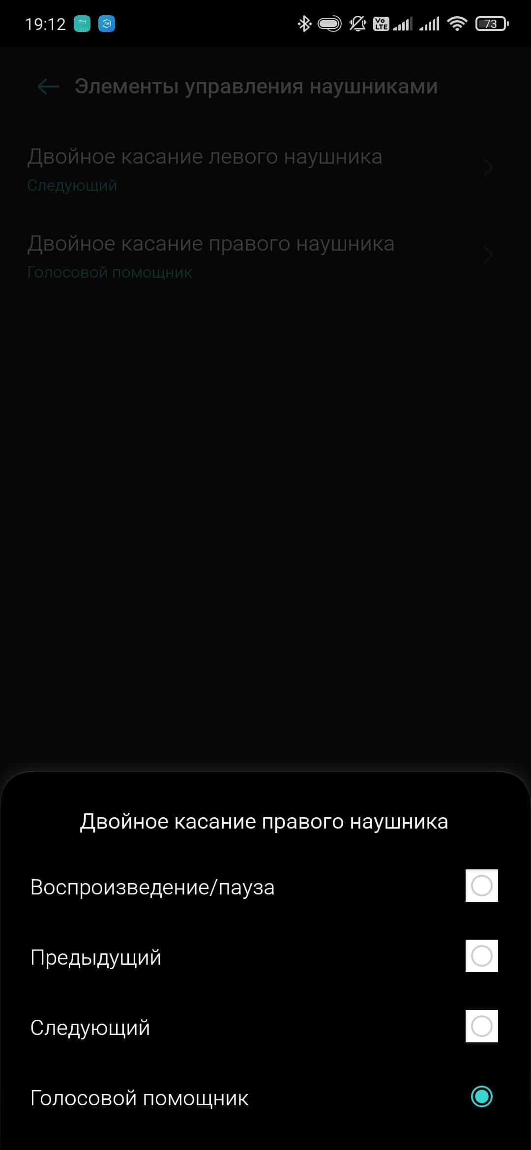 Второй и последний пункт в меню на главной странице приложения — настройка управления. К двойным тапам по каждому из наушников можно привязать воспроизведение и паузу, перелистывание треков или вызов голосового помощника. В ходе тестирования нам показалось наиболее удобным «повесить» на правый наушник возможность запустить следующий трек, а на левый — вызов ассистента, с помощью которого можно и громкость изменить, и еще кучу всего интересного сделать. Прием телефонного вызова и его завершение, как несложно догадаться, тоже выполняются двойным касанием.