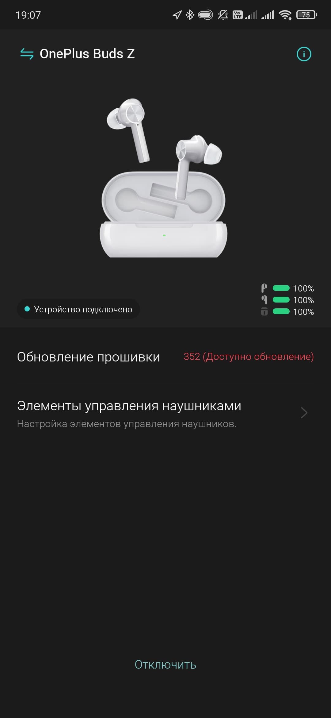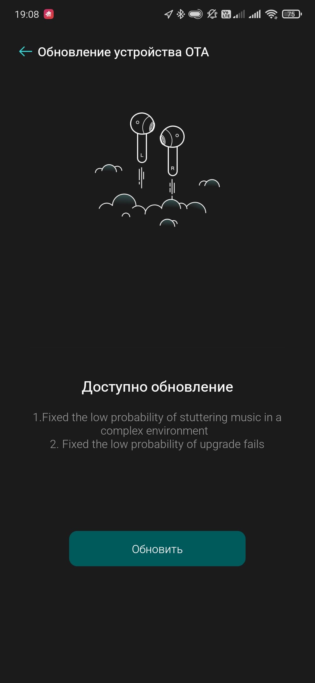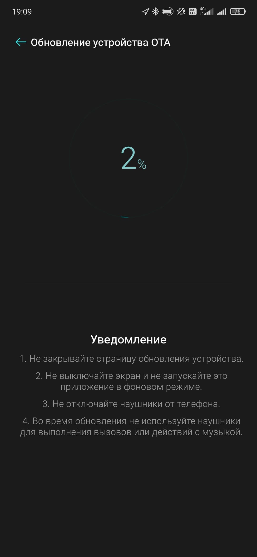 После установки она предлагает подключить устройство, сама находит его и демонстрирует уровни зарядки кейса и каждого из наушников. Далее происходит автоматическая проверка наличия обновлений прошивки — если они есть, появляется уведомление. В ходе теста установка заняла около 4 минут, но тут все зависит от размеров пакета и скорости интернет-соединения.