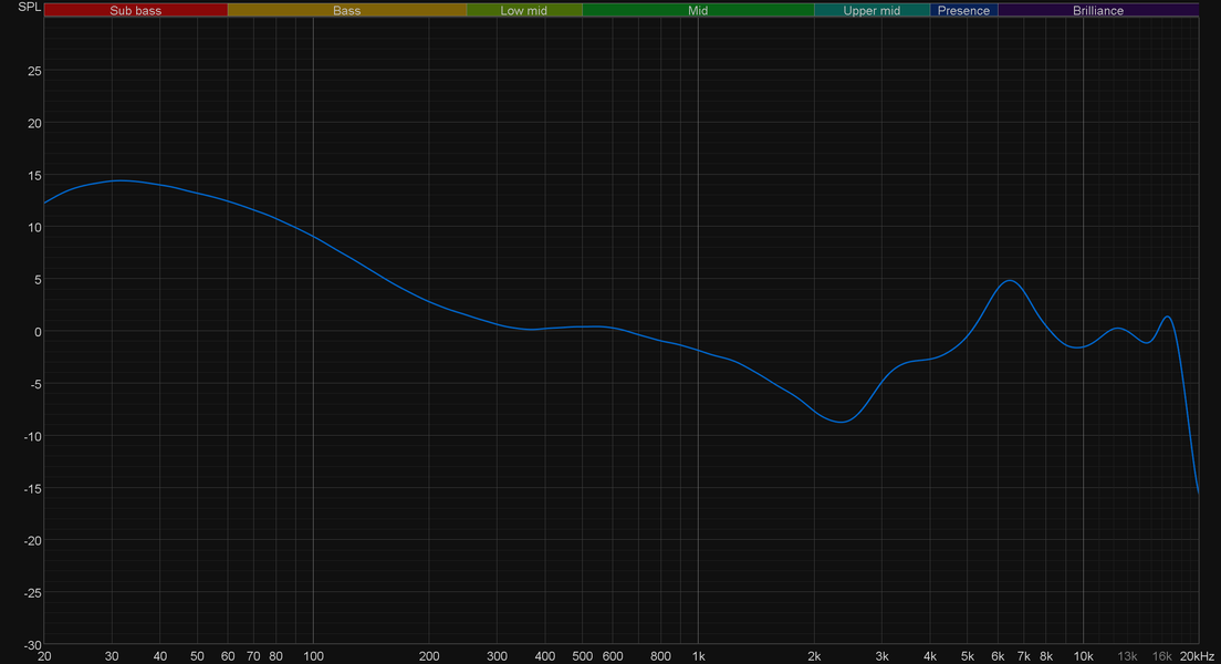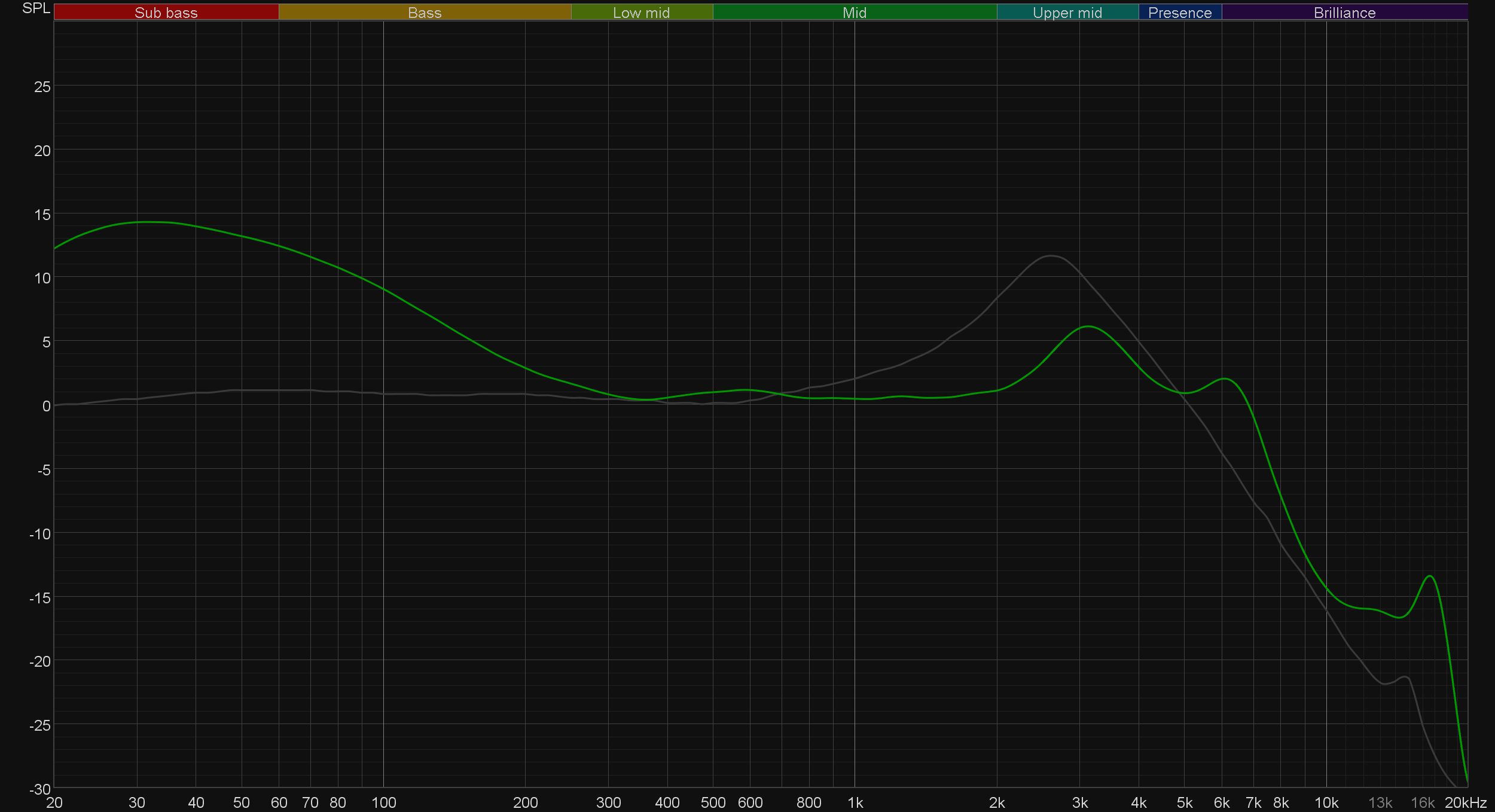График АЧХ показан на фоне целевой кривой, предоставленной производителем используемого стенда. Она является адаптированным под конкретное устройство аналогом так называемой «кривой Хармана», созданной командой Harman International под руководством доктора Шона Олива. Люди неодинаково воспринимают звук разной частоты, поэтому даже самые точные измерения могут не соответствовать реальному пользовательскому опыту. Для компенсации этих различий и используется целевая АЧХ. Близкое к ней звучание оценивалось сотнями участников экспериментов как нейтральное, сбалансированное, естественное и так далее.