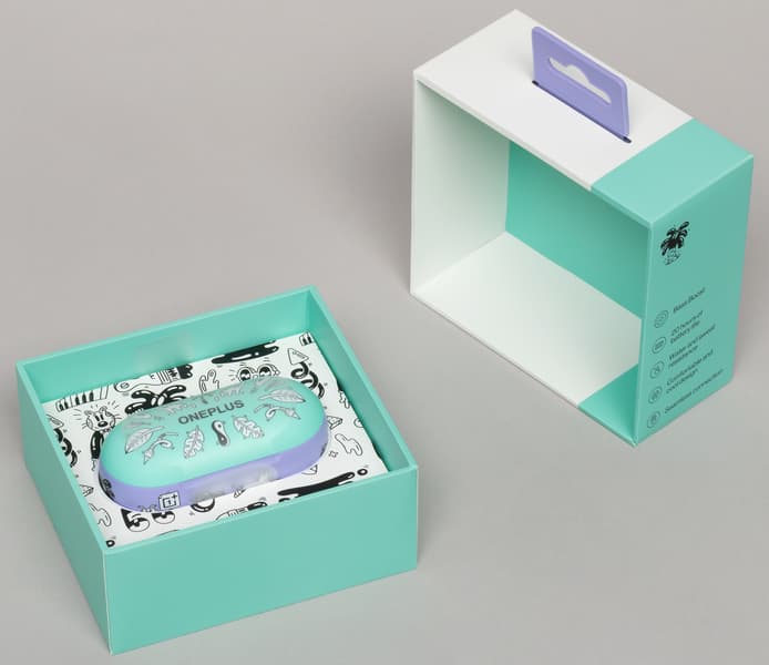 Поставляется OnePlus Buds Z в белой коробке с нанесенным на нее изображением устройства. Дизайн упаковки выполнен в сочетании бирюзового и василькового цветов — как и все прочие части гарнитуры, включая амбушюры.