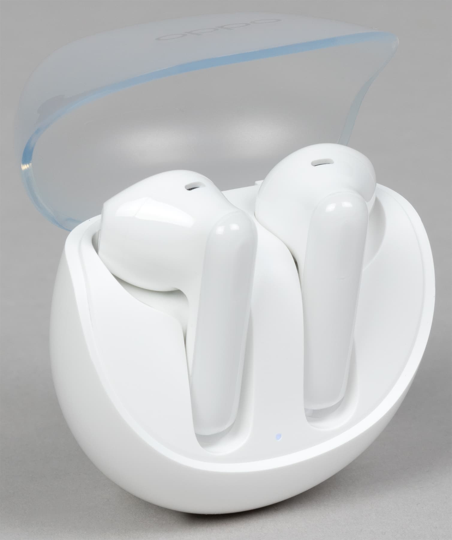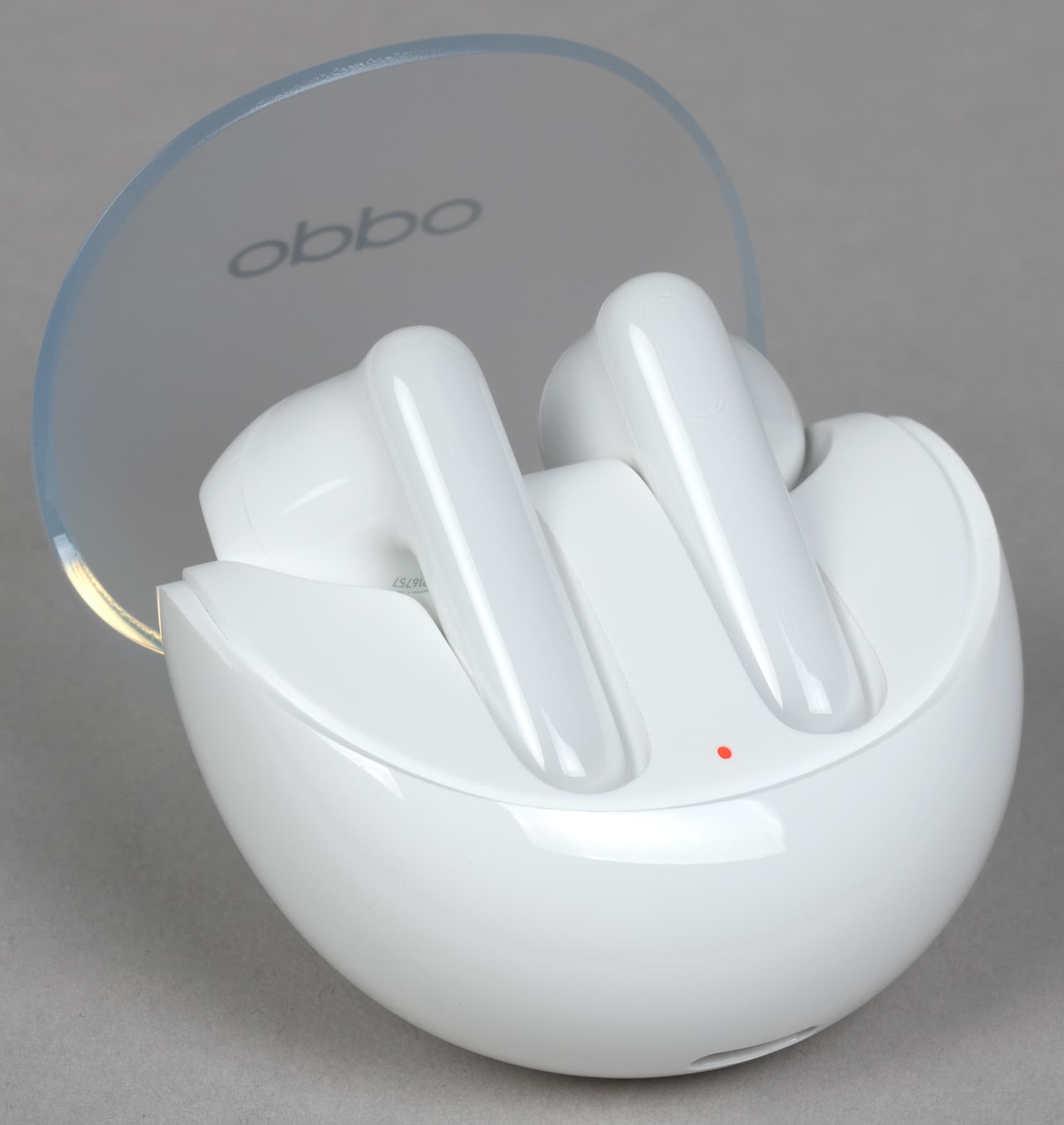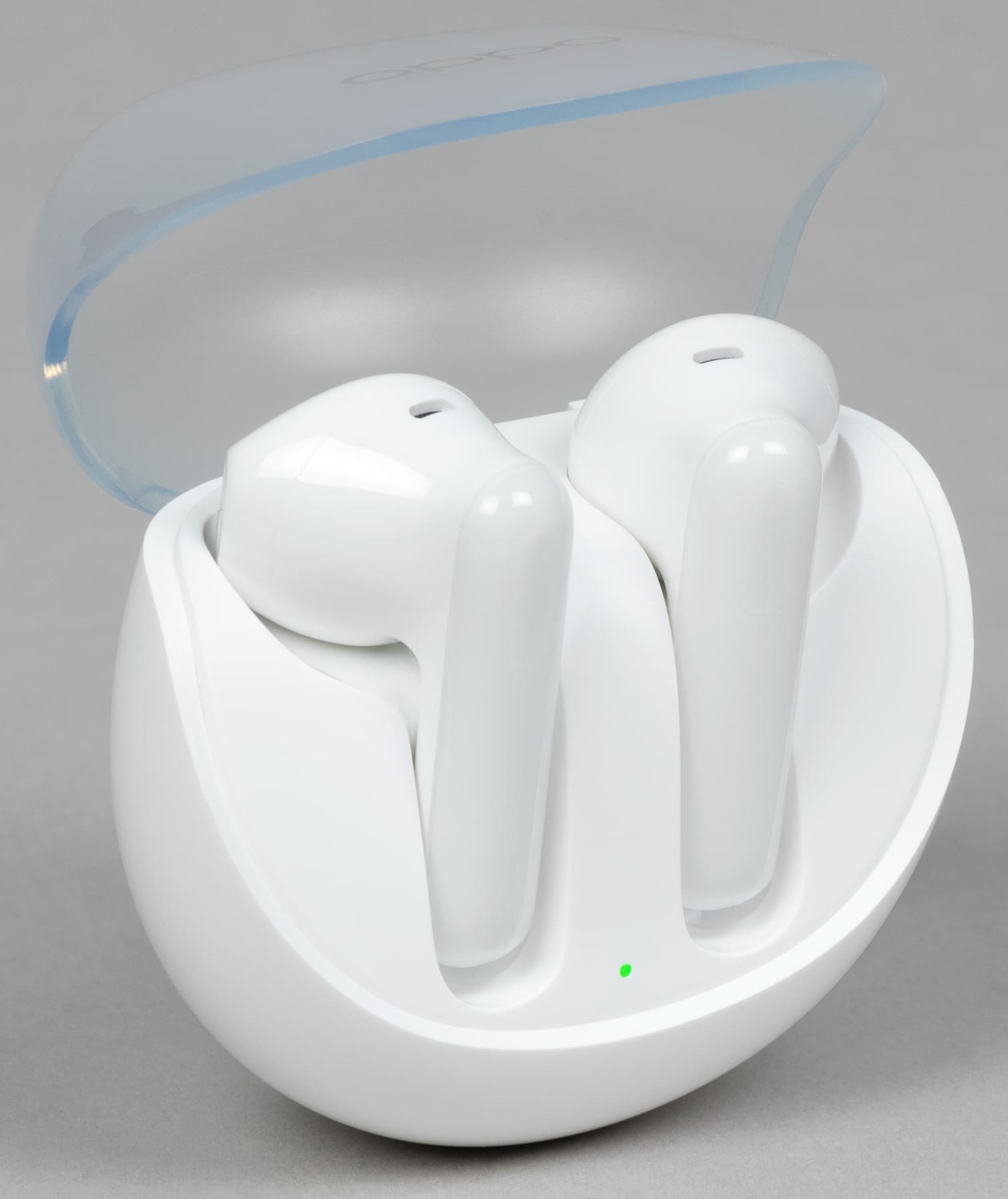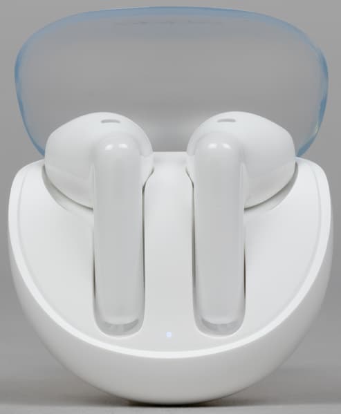Крышка матовая, верхняя ее часть чуть менее прозрачна, чем боковая. Oppo Enco Air3 производится только в белом цвете, пластик используется глянцевый — пятна от прикосновений появляются легко, но на светлом фоне не очень заметны.