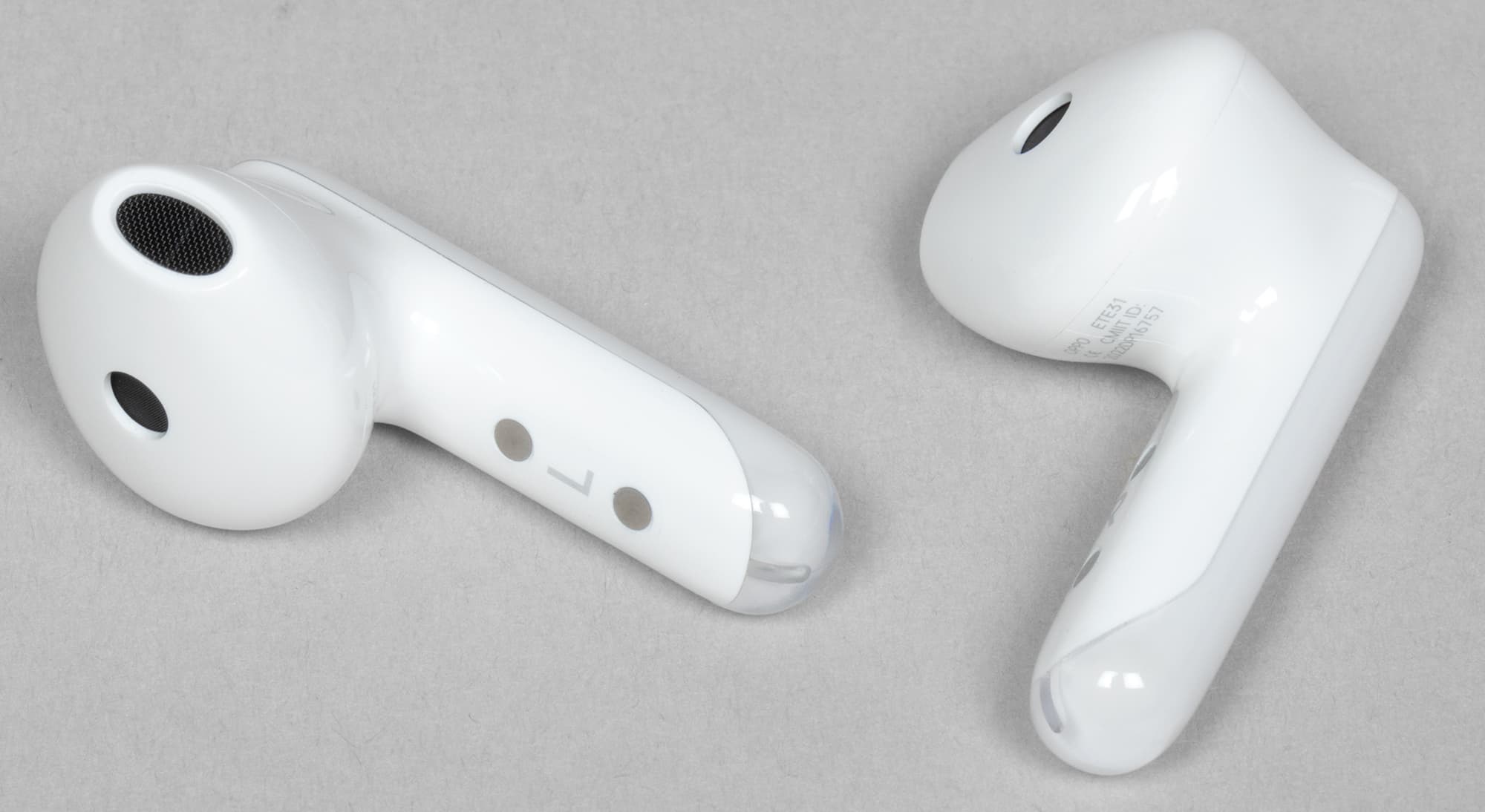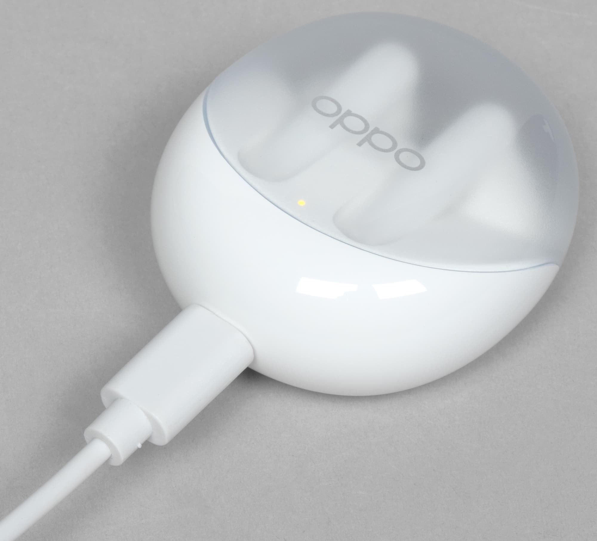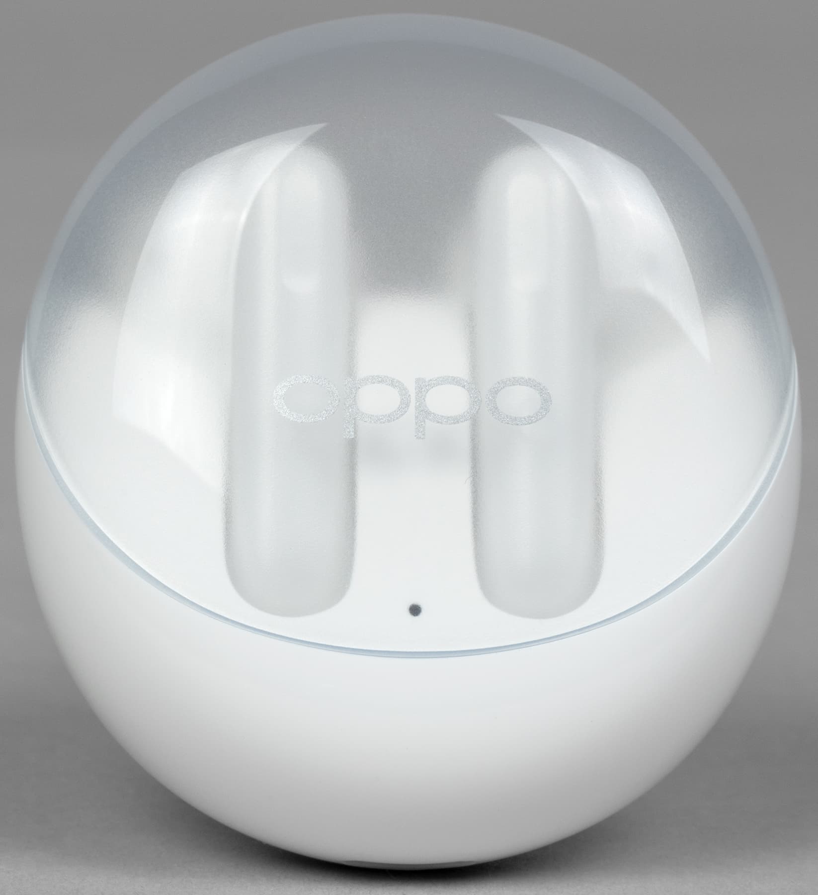 Крышка матовая, верхняя ее часть чуть менее прозрачна, чем боковая. Oppo Enco Air3 производится только в белом цвете, пластик используется глянцевый — пятна от прикосновений появляются легко, но на светлом фоне не очень заметны.