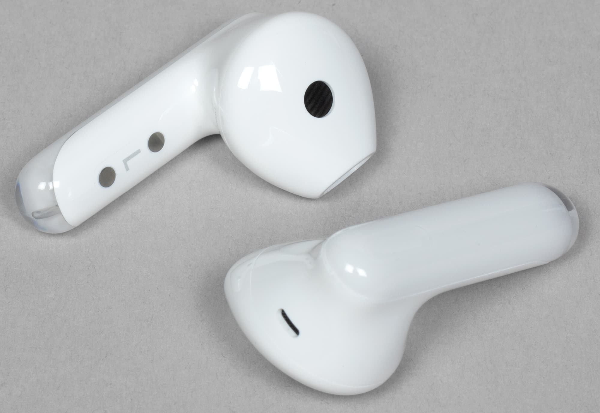 На верхней поверхности округлой части наушников видно щелевидное отверстие, за которым, вероятнее всего, скрываются микрофоны системы шумоподавления при звонке.