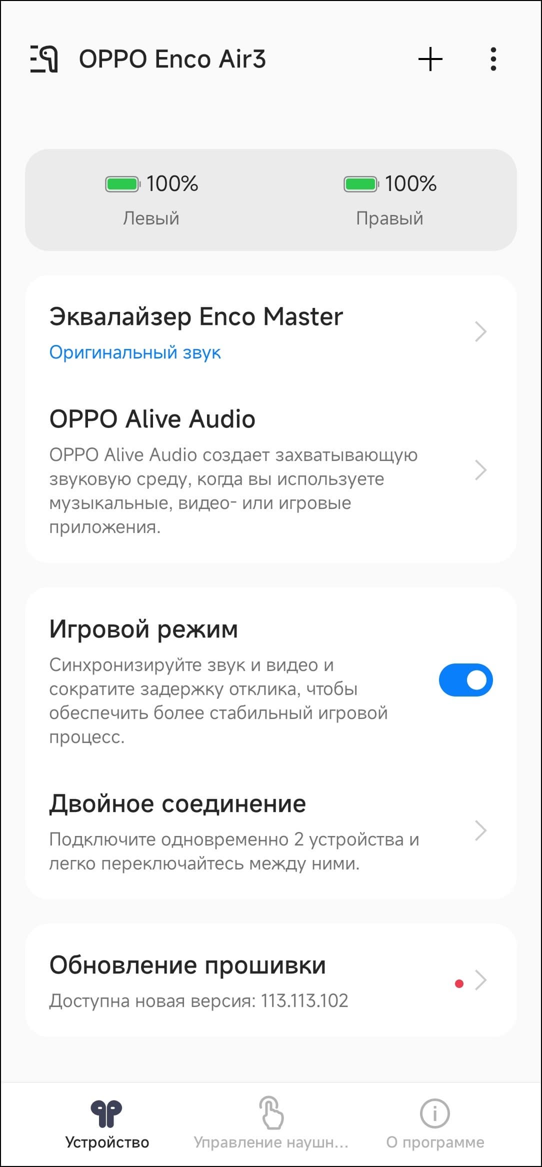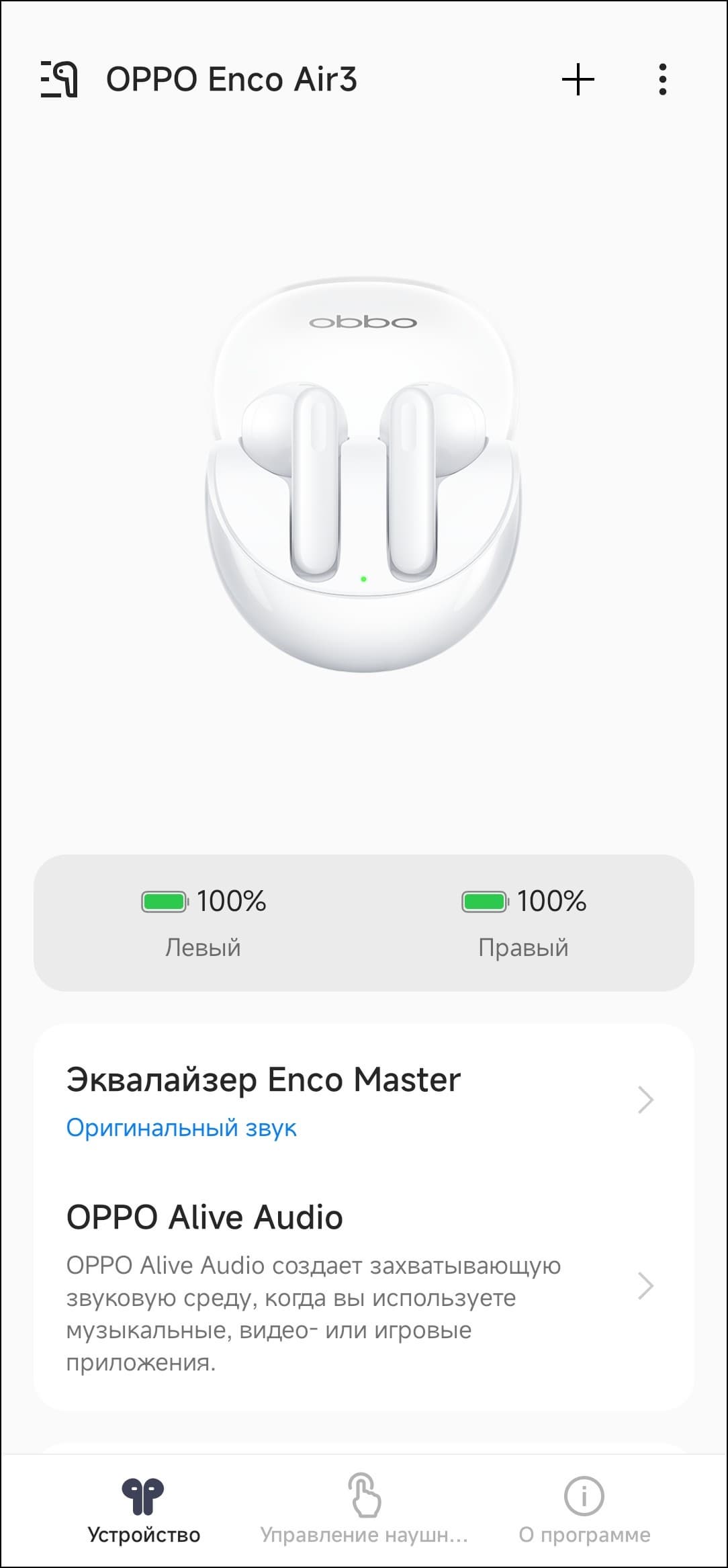 С главного экрана доступны выбор из трех пресетов эквалайзера и активация функции Alive Audio, предлагающей «объемный» звук в поддерживающих ее приложениях. Судя по тестовому контенту, она добавляет немного реверберации в звук, что действительно может создать иллюзию объема — в фильмах и играх можно попробовать, в музыке такое обычно звучит странно. Хотя некоторым слушателям может и понравиться — тут дело вкуса. Поэкспериментировать с этой функцией точно стоит — как-никак одна из главных «фишек» Enco Air3.