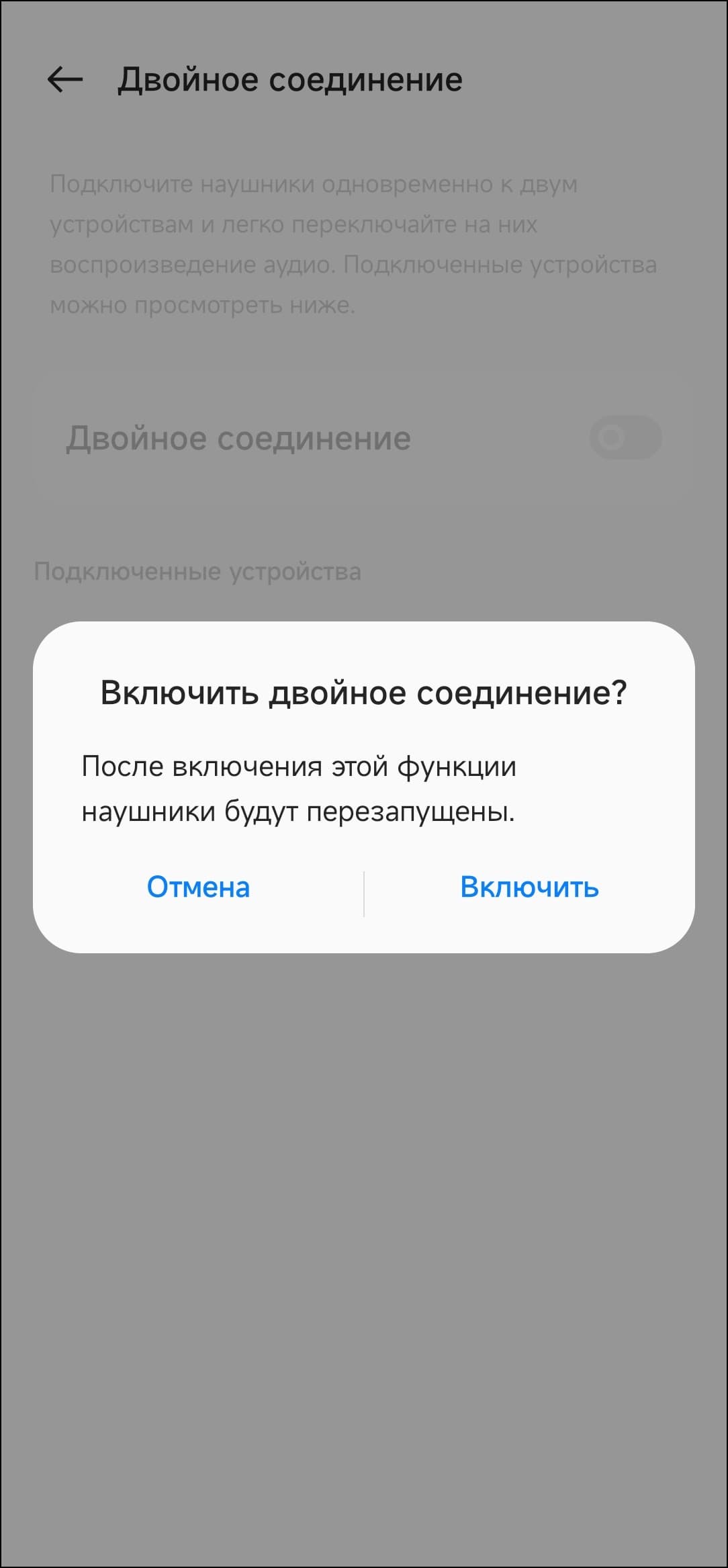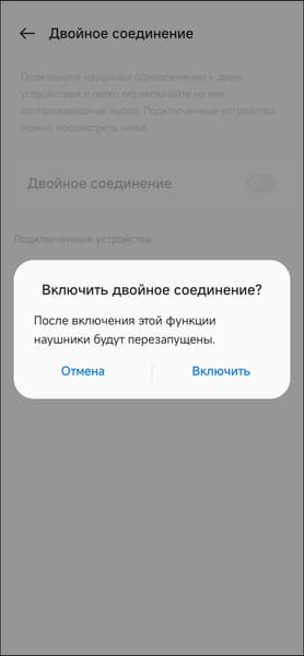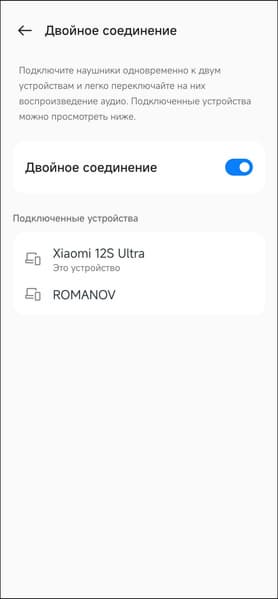 В правом верхнем углу есть «выпадающее» меню, позволяющее отключить устройство и удалить его из приложения. Нас же больше интересует раздел «двойное соединение», где можно задействовать мультипойнт. Для подключения второго источника надо прикоснуться к сенсорным зонам обоих наушников на 4 секунды, после чего произвести сопряжение стандартным способом.