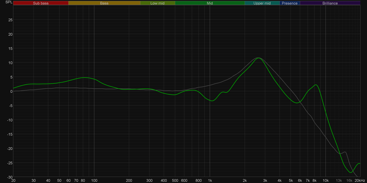 График выше показан на фоне кривой IDF (IEM diffuse field compensation), предоставленной производителем используемого стенда. Ее задача — помочь скомпенсировать резонансные явления в имитированном слуховом канале и особенности оборудования, создав «звуковой профиль», максимально корректно иллюстрирующий то, как звучание наушников воспринимается слушателем. Ее можно рассматривать как адаптированный под конкретное устройство аналог так называемой «кривой Хармана», созданной командой Harman International под руководством доктора Шона Олива. Скомпенсируем полученный график АЧХ в соответствии с кривой IDF.