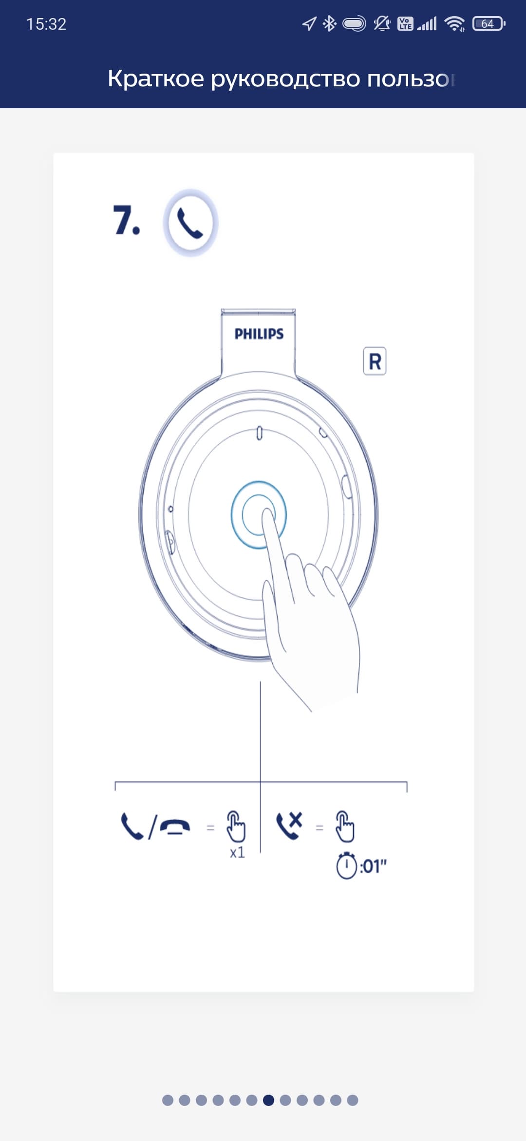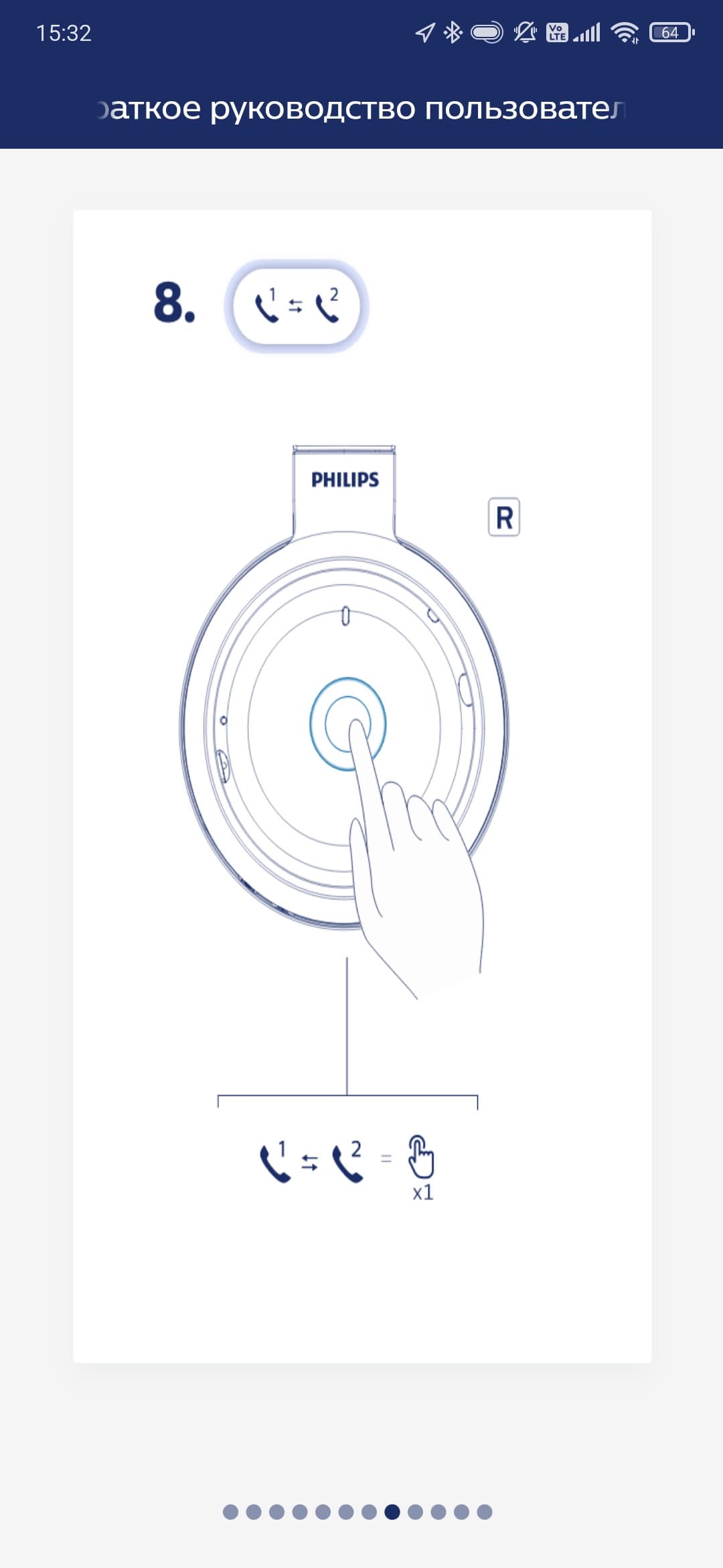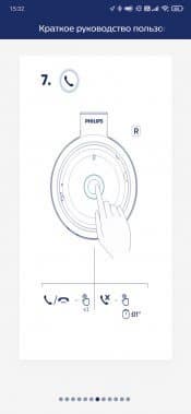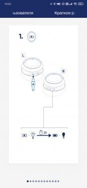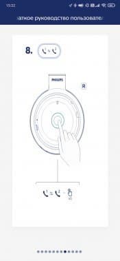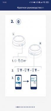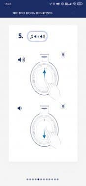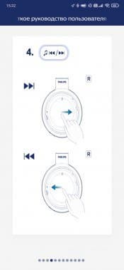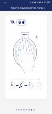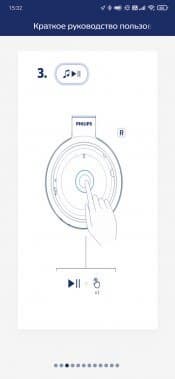 Далее пользователю предлагается подробная инструкция по подключению гарнитуры и основным возможностям управления. Как можно заметить ниже, одиночный тап управляет воспроизведением, свайпы влево и вправо листают треки.