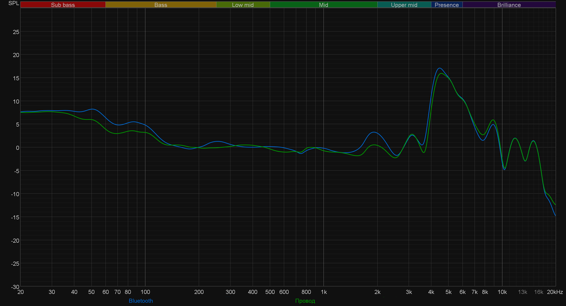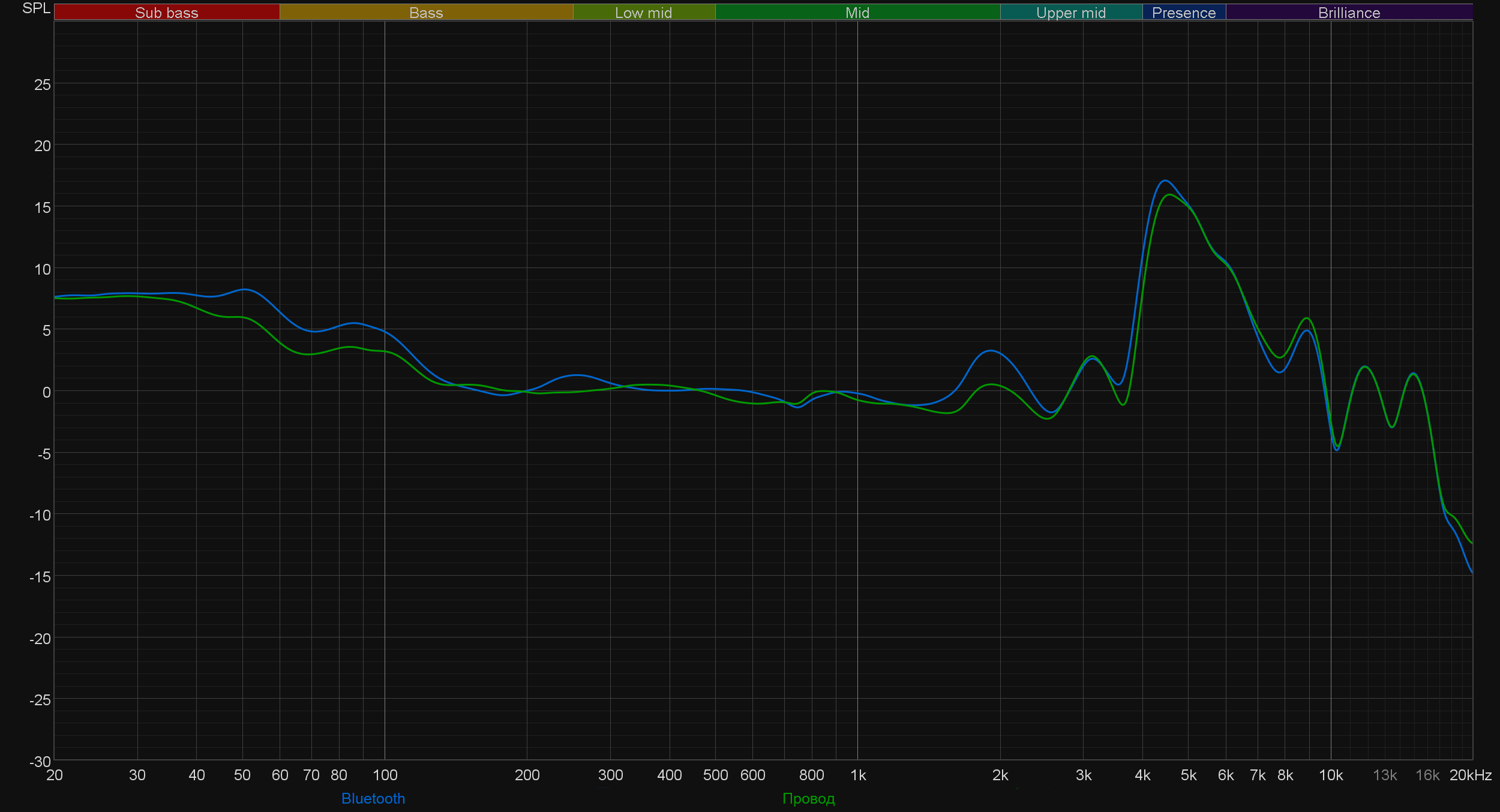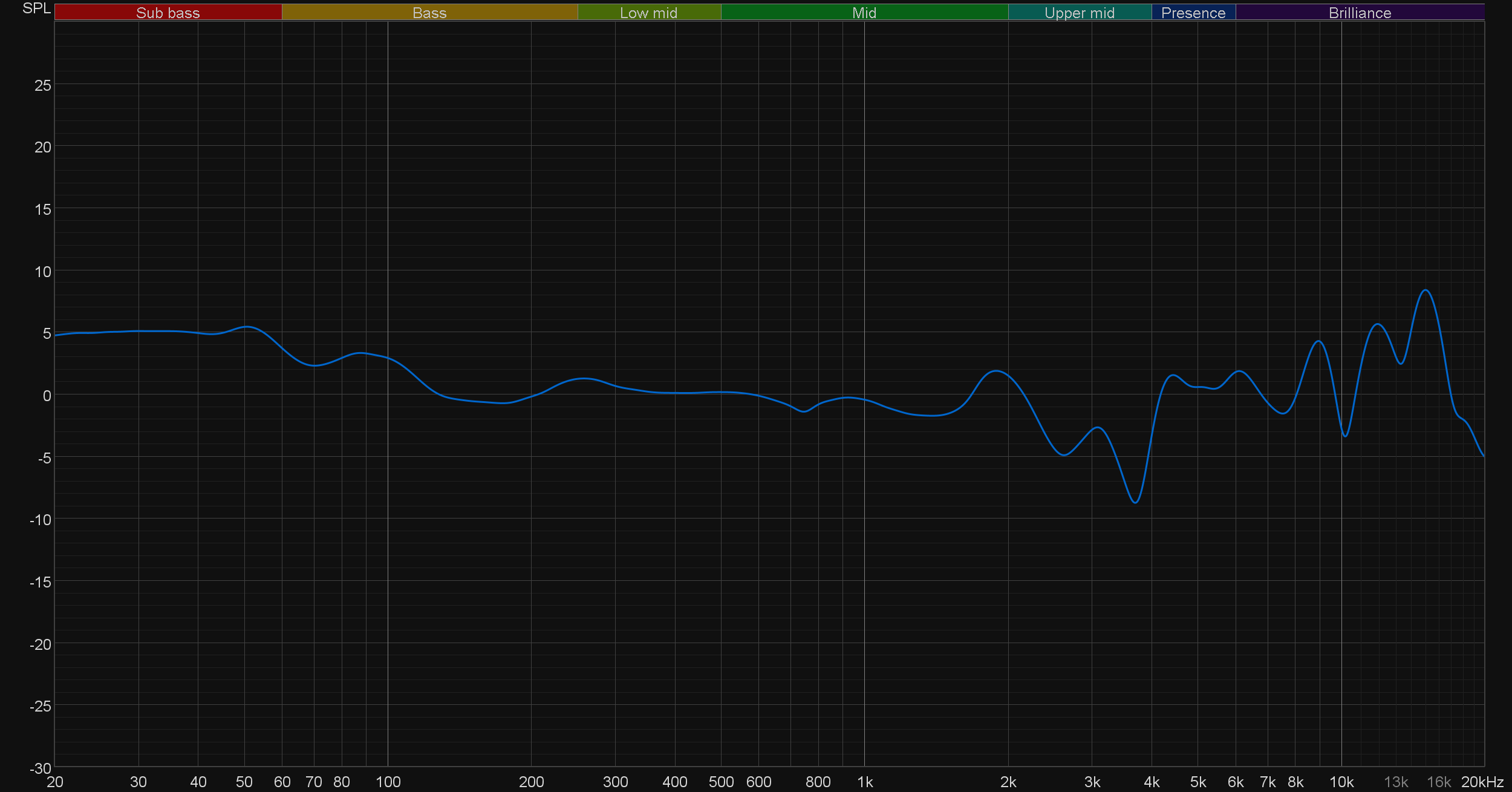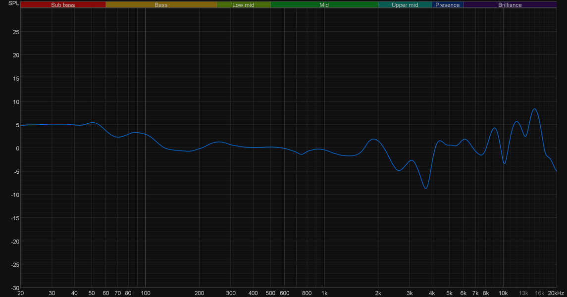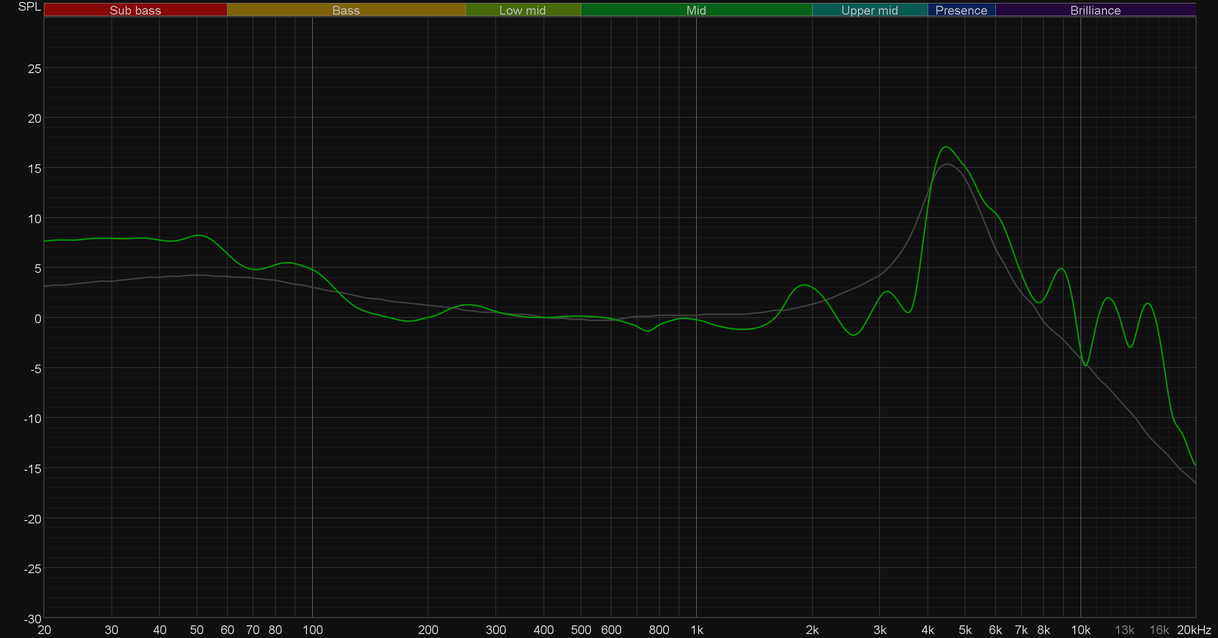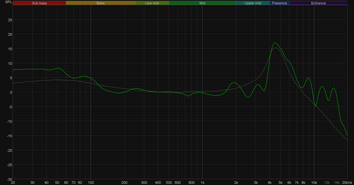 График АЧХ показан на фоне целевой кривой, предоставленной производителем используемого стенда. Она является адаптированным под конкретное устройство аналогом так называемой «кривой Хармана», созданной командой Harman International под руководством доктора Шона Олива. Люди неодинаково воспринимают звук разной частоты, поэтому даже самые точные измерения могут не соответствовать реальному пользовательскому опыту. Для компенсации этих различий и используется целевая АЧХ. Близкое к ней звучание оценивалось сотнями участников экспериментов как нейтральное, сбалансированное, естественное и так далее.