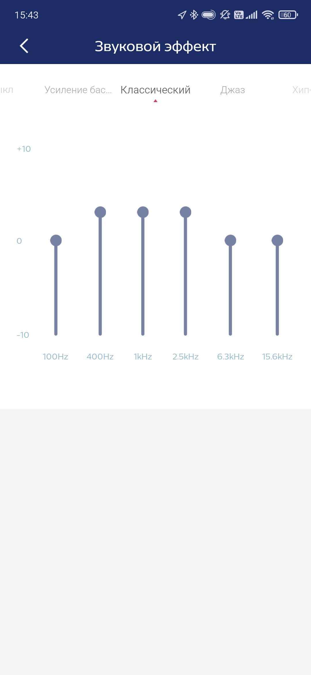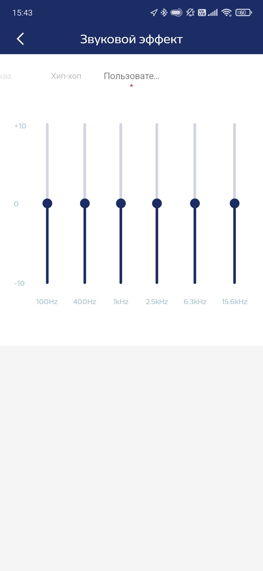 Ну и, наконец, эквалайзер. Ряд пресетов, плюс шесть полос, позволяющих подстроить звук под собственные запросы в ручном режиме. Выбор частот для регулировки, мягко говоря, оригинален — частоты ниже 100 Гц не регулируются, например. «Поддать баса» можно, но только за счет увода назад остального диапазона — на это мы еще посмотрим чуть ниже. В целом же, при выборе именно этих частот для регулировки разработчики, вероятнее всего, учитывали особенности звучания наушников. Потому эквалайзер работает не самым привычным образом, но при этом вполне дает возможность подстроить звук под себя.