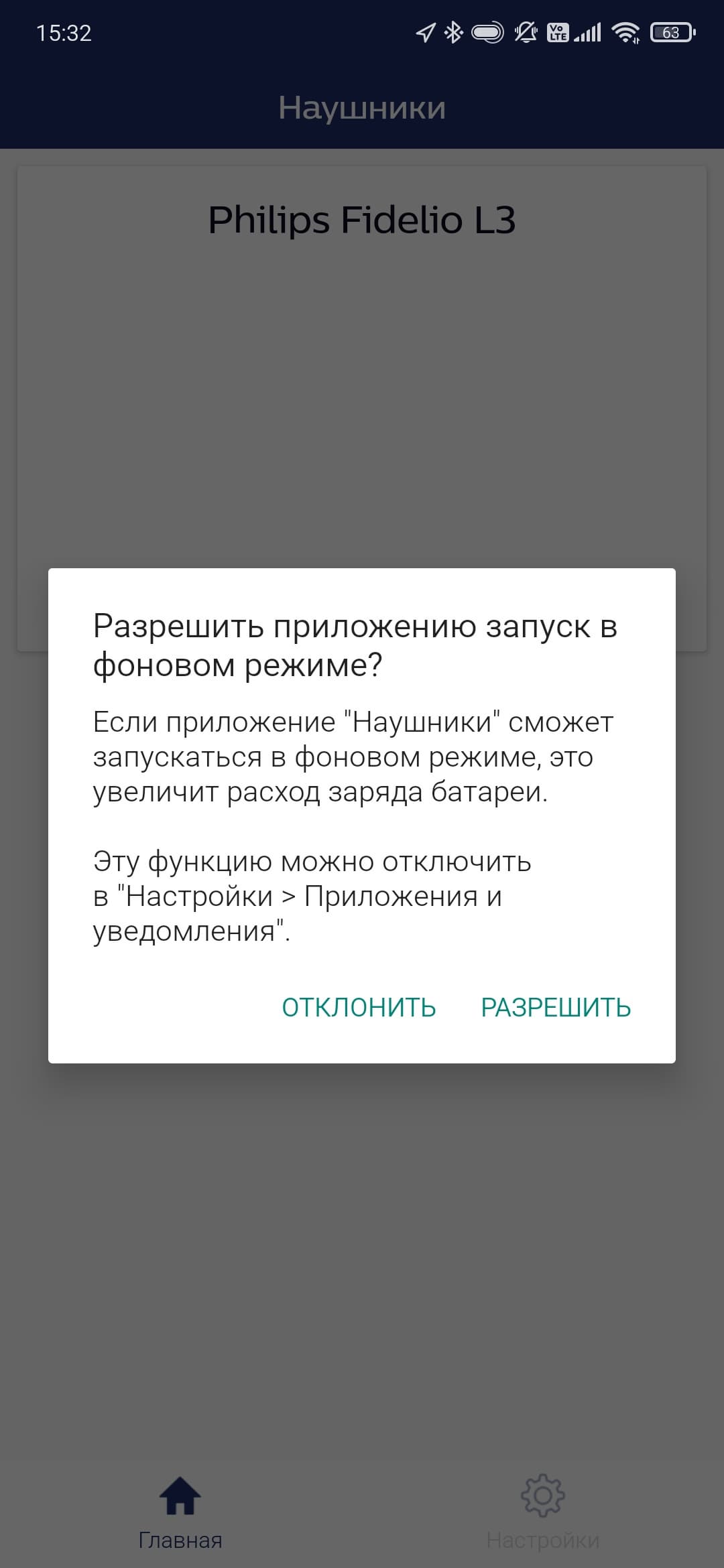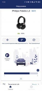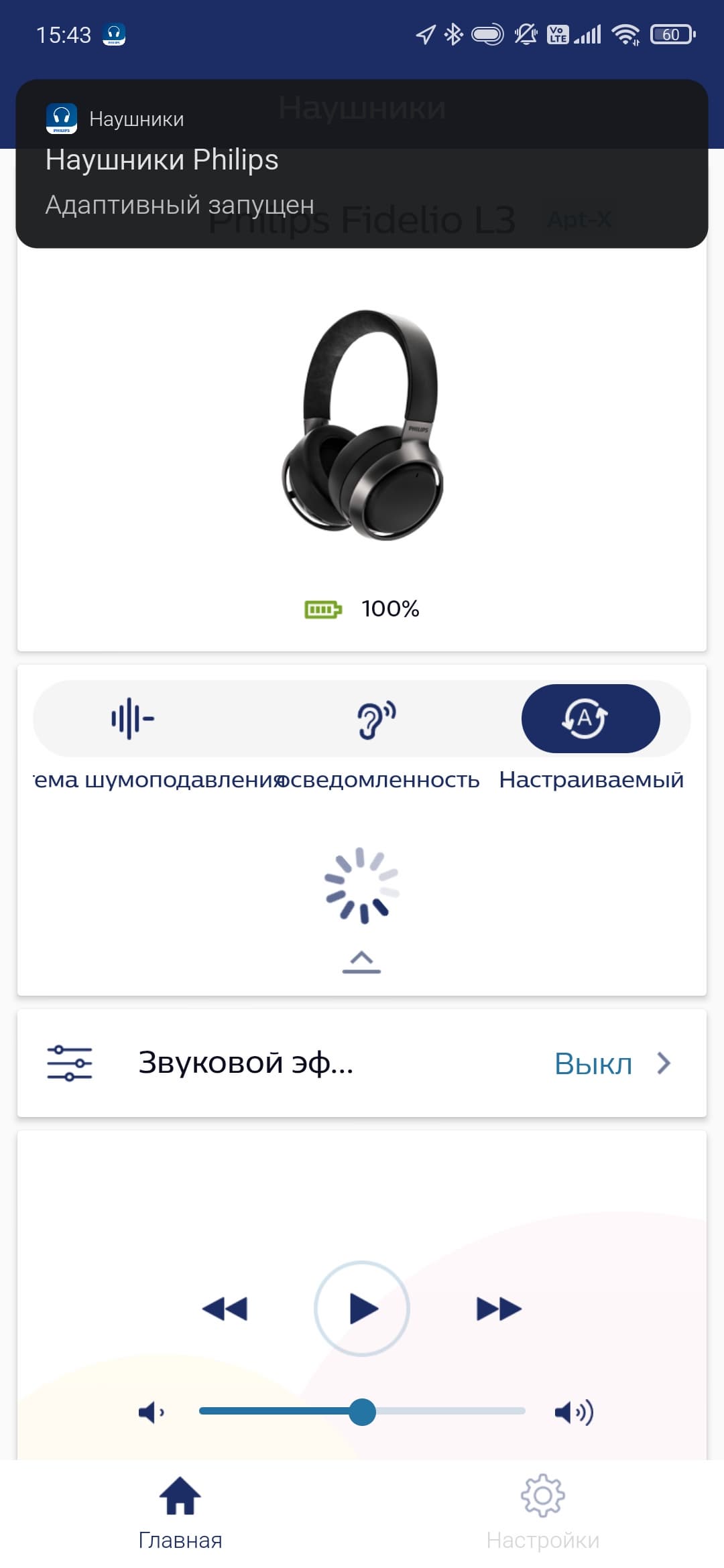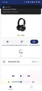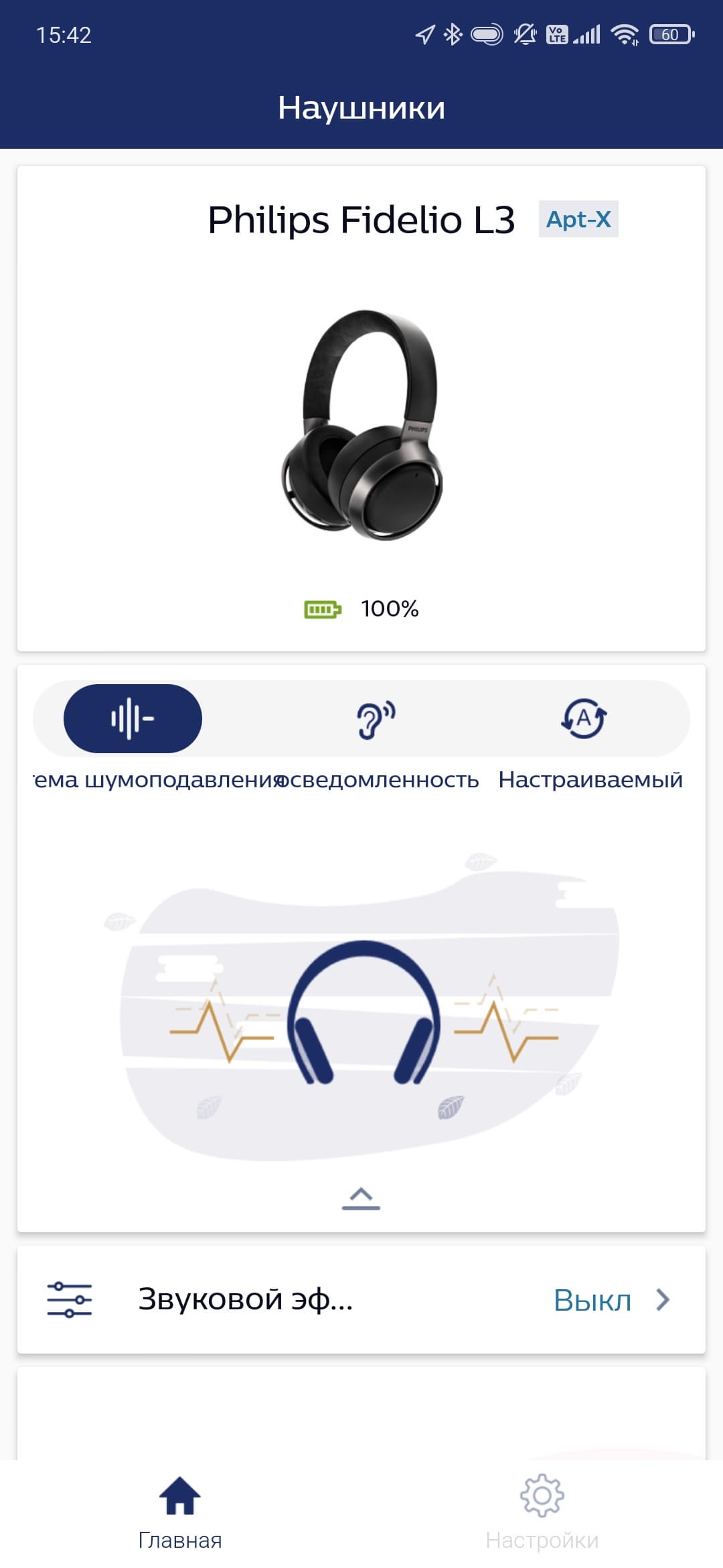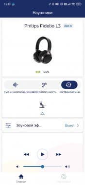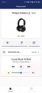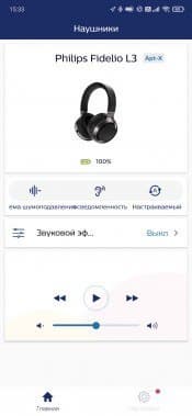 Ну а мы разрешаем приложению запуск в фоновом режиме и переходим на главный экран. И вот тут открывается интересная особенность: в качестве используемого кодека указан aptX. Что немного странно, ведь выше мы видели, что при подключении наушники задействовали aptX HD. А дело все в том, что при запуске приложения Fidelio L3 отключаются от смартфона, после чего подключаются заново — уже используя aptX. Вероятно, разработчики опасались, что пропускной способности беспроводного соединения не хватит одновременно на передачу звука и обмен данными… В общем, придется выбирать между использованием ПО и aptX HD — тут уж кому и когда что важнее. Плюс при переподключении приложение Philips Headphones может намертво «зависнуть» — приходится закрывать его и открывать заново.