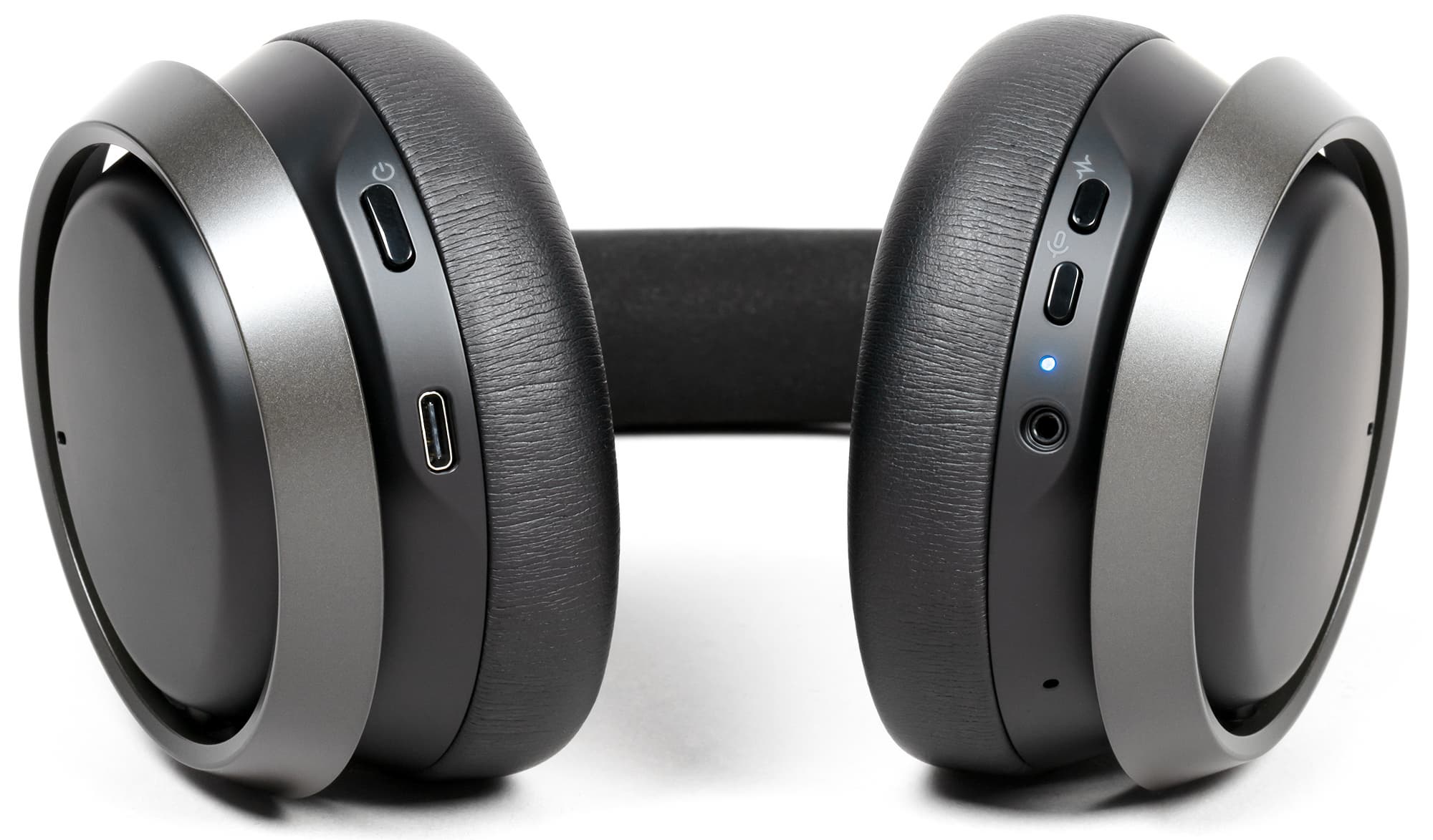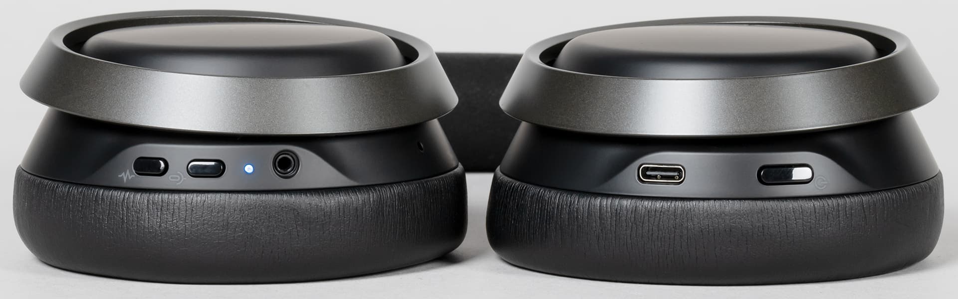 На левой чашке внизу расположились разъем питания и кнопка включения, которая также активирует сопряжение. Справа находятся кнопка переключения режимов активного шумоподавления и «звуковой прозрачности», клавиша вызова голосового ассистента, светодиодный индикатор и разъем для проводного подключения.