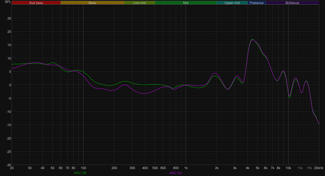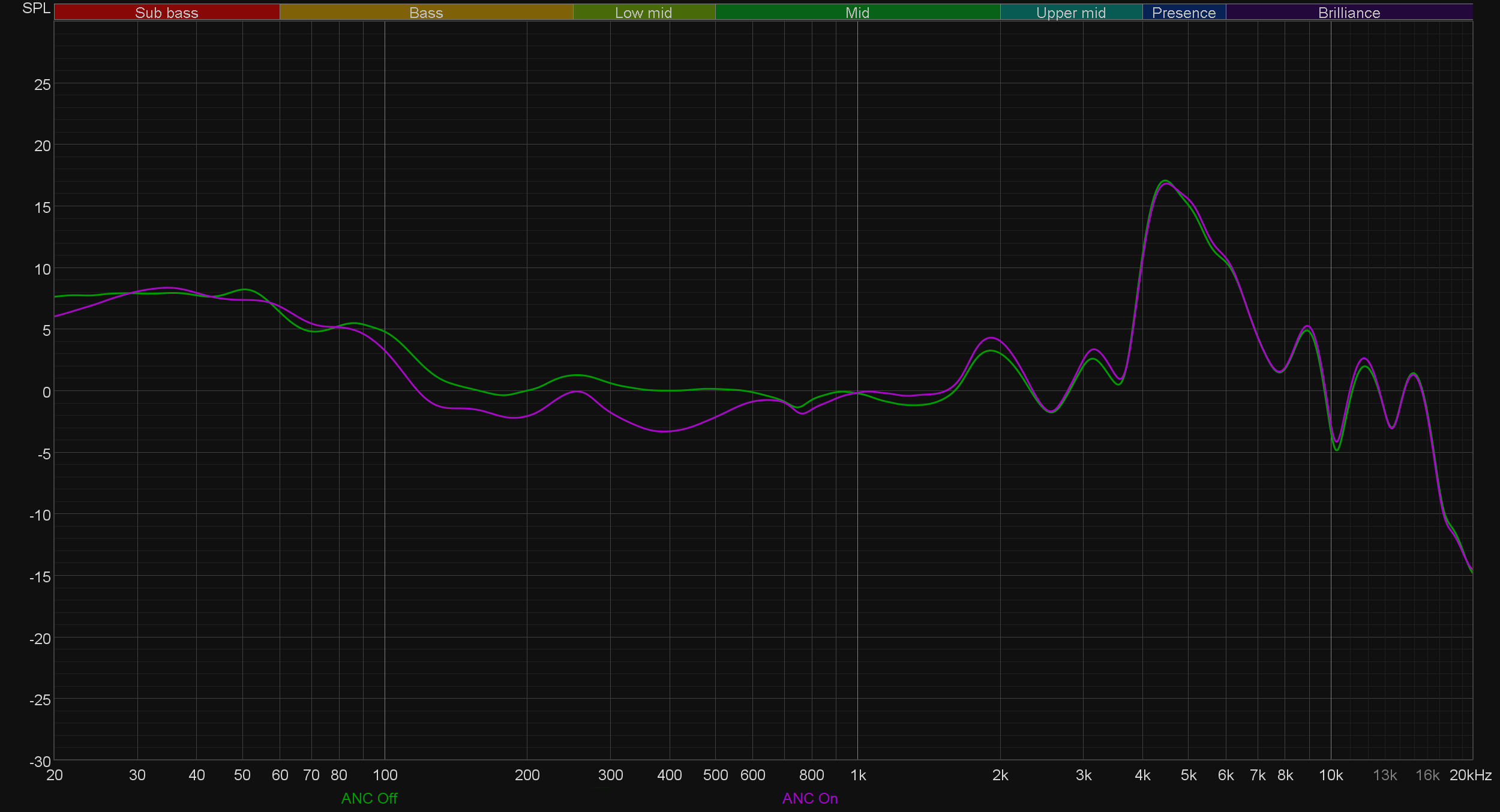 В таком виде особенности наушников становятся еще более очевидными. К «провалу» в районе 4 кГц не стоит относиться слишком серьезно, целевая кривая призвана скомпенсировать резонансы внутри создаваемой чашкой наушников полости, в данном случае они повели себя чуть иначе, чем задумывали разработчики кривой — ничего страшного в этом нет, на слух данная особенность практически не воспринимается. Посмотрим, как влияет на АЧХ включение активного шумоподавления.