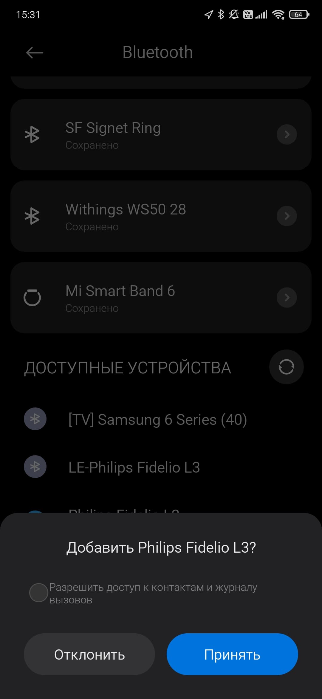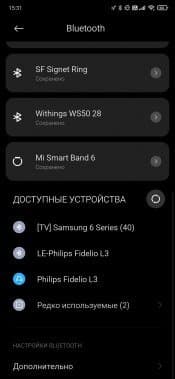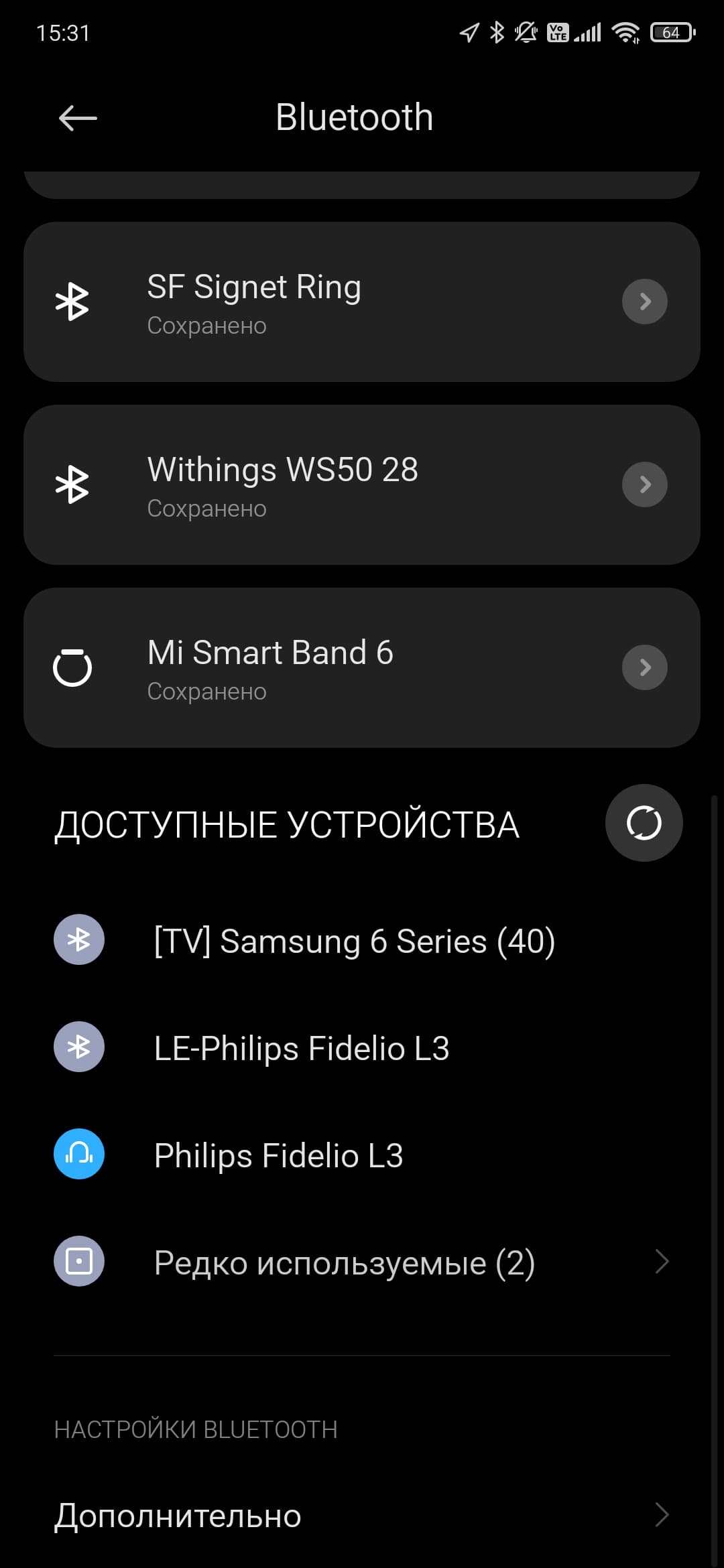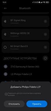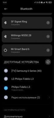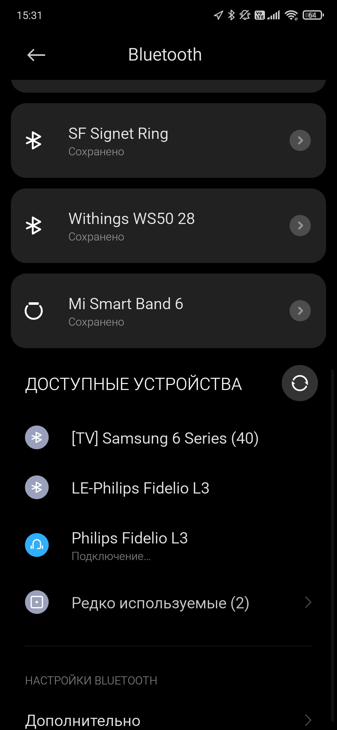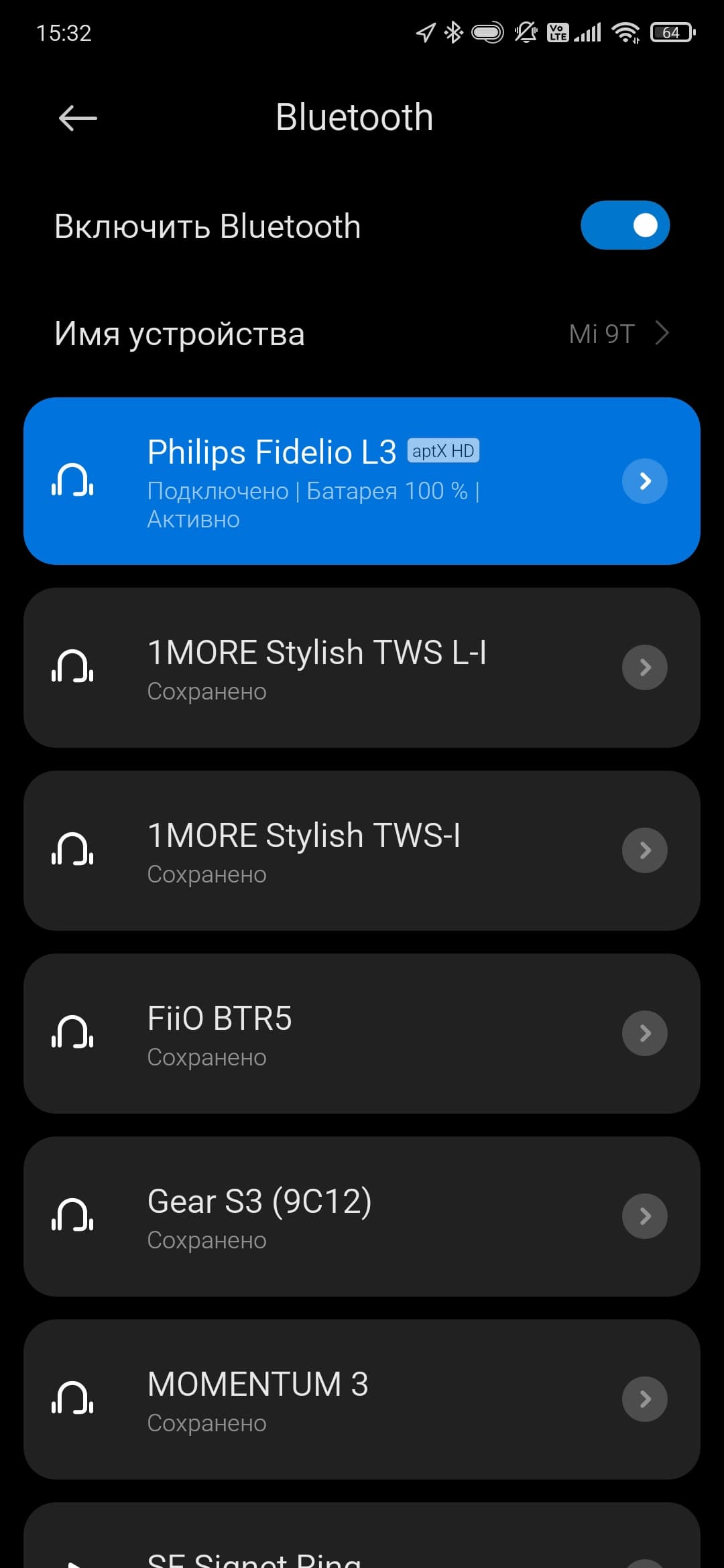 В режим сопряжения наушники после включения входят автоматически, если некоторое время не могут подключиться к уже «знакомым» устройствам. Принудительно активировать его можно удержанием клавиши включения более 5 секунд. Индикатор на нижней панели в это время начинает попеременно мигать синим и белым. Ну а дальше все как всегда — находим наушники в соответствующем меню гаджета, да подключаем. Правда, есть один нюанс: первым в списке устройств появляется некий LE-Philips Fidelio L3, так вот к нему подключаться не надо. А надо дождаться просто Philips Fidelio L3 и вот уже с ним осуществлять подключение. Здесь стоит обратить внимание на то, что по умолчанию сразу используется кодек aptX HD, к нему мы еще чуть позже вернемся.