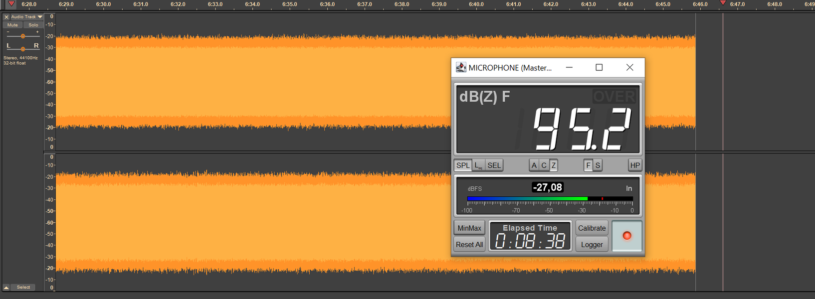 Для начала вкратце напомним методику проверки автономности беспроводных наушников. Безопасным уровнем звукового давления при прослушивании музыки в наушниках считается 75 дБ, но на практике большинство слушателей предпочитает уровень 90-100 дБ. Мы транслируем в наушники белый шум, фиксируя уровень SPL в районе 95 дБ, сразу после старта воспроизведения запускаем запись сигнала с измерительного стенда — по длине получившегося трека легко понять, сколько проработало устройство.