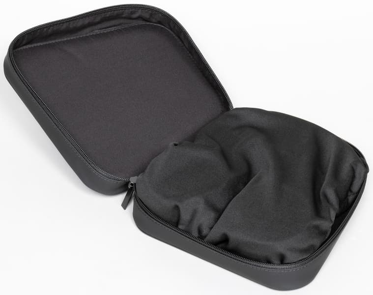 Чехол для переноски крайне солидно выглядит и очень приятен на ощупь. Все швы ровные, молния работает практически идеально — с небольшим приятным усилием и очень плавно. Сбоку есть небольшая петелька для переноски с названием наушников.