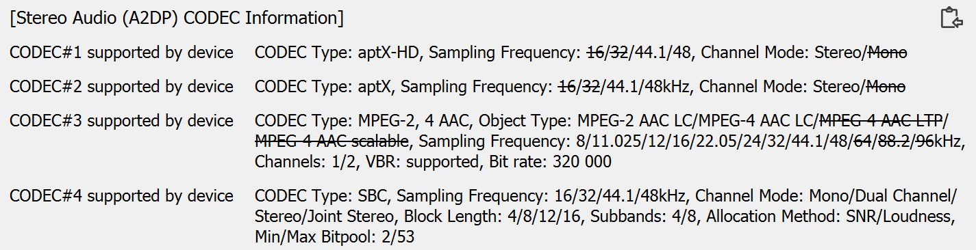 Полный список поддерживаемых кодеков и их режимов мы традиционно получили с помощью утилиты Bluetooth Tweaker. Тут все без сюрпризов: SBC, AAC, aptX и aptX HD.