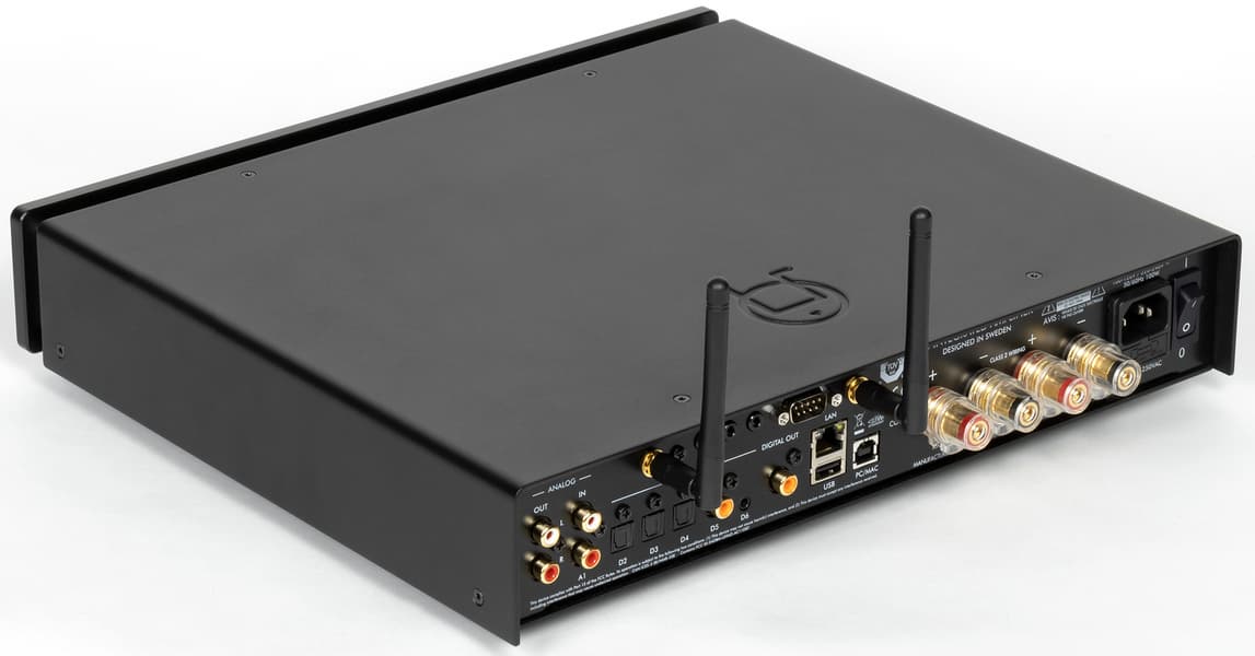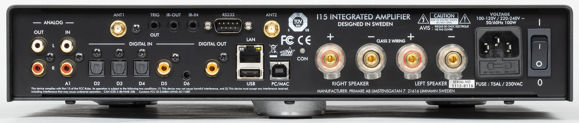 Подключение Primare I15 Prisma — процесс весьма простой. Прикручиваем съемные антенны, если планируем использовать Wi-Fi — без них качество связи будет крайне низким даже в непосредственной близости от роутера. Либо подключаем Ethernet-кабель к разъему на задней панели. При первом включении усилитель «спросит» какой именно тип подключения мы предпочитаем. Остается включить прибор в сеть, да присоединить акустику с помощью зажимных клемм или разъемов типа Banana. Остальное — по желанию, как уже было отмечено выше, присутствует ряд цифровых и даже один аналоговый вход — можно подключить хоть CD-плеер, хоть винил или даже какую-нибудь винтажную кассетную деку.