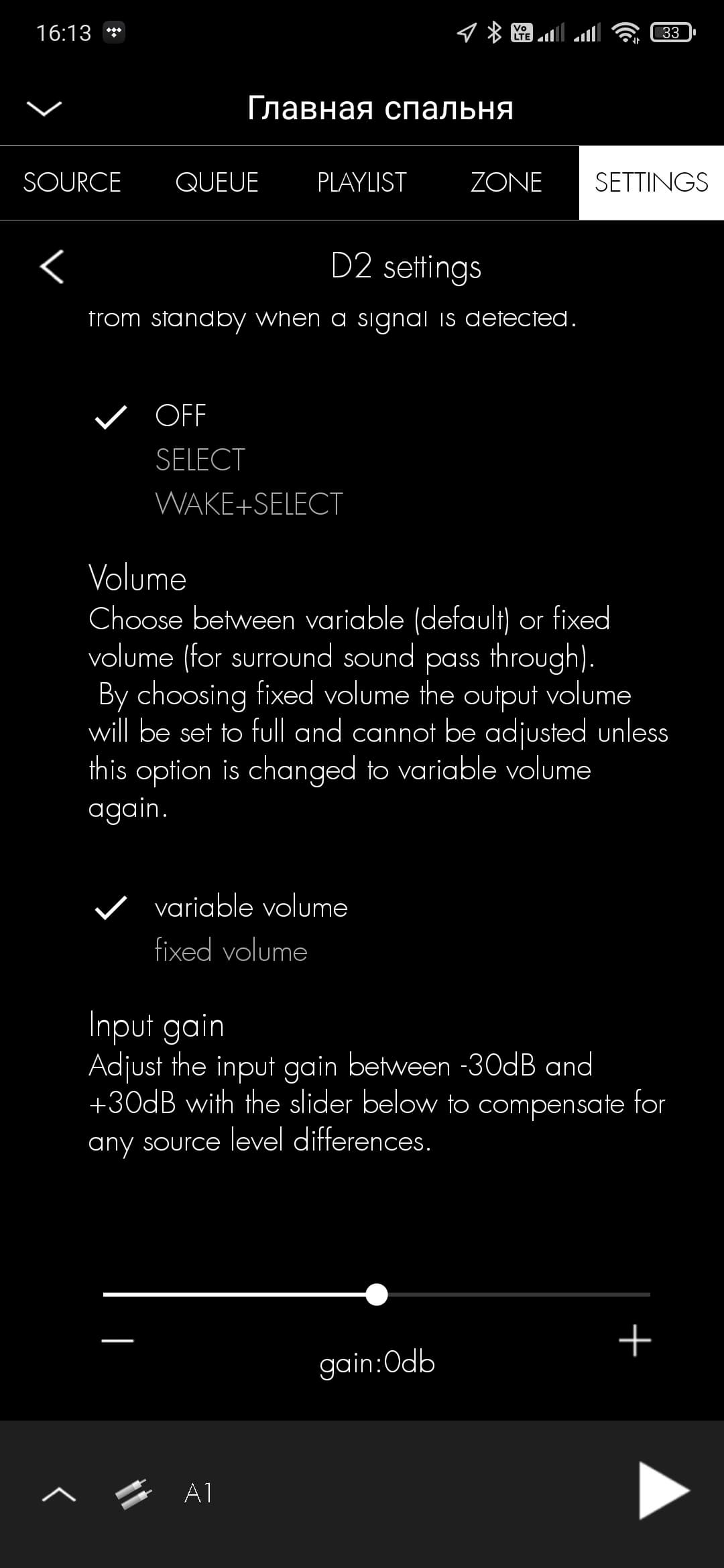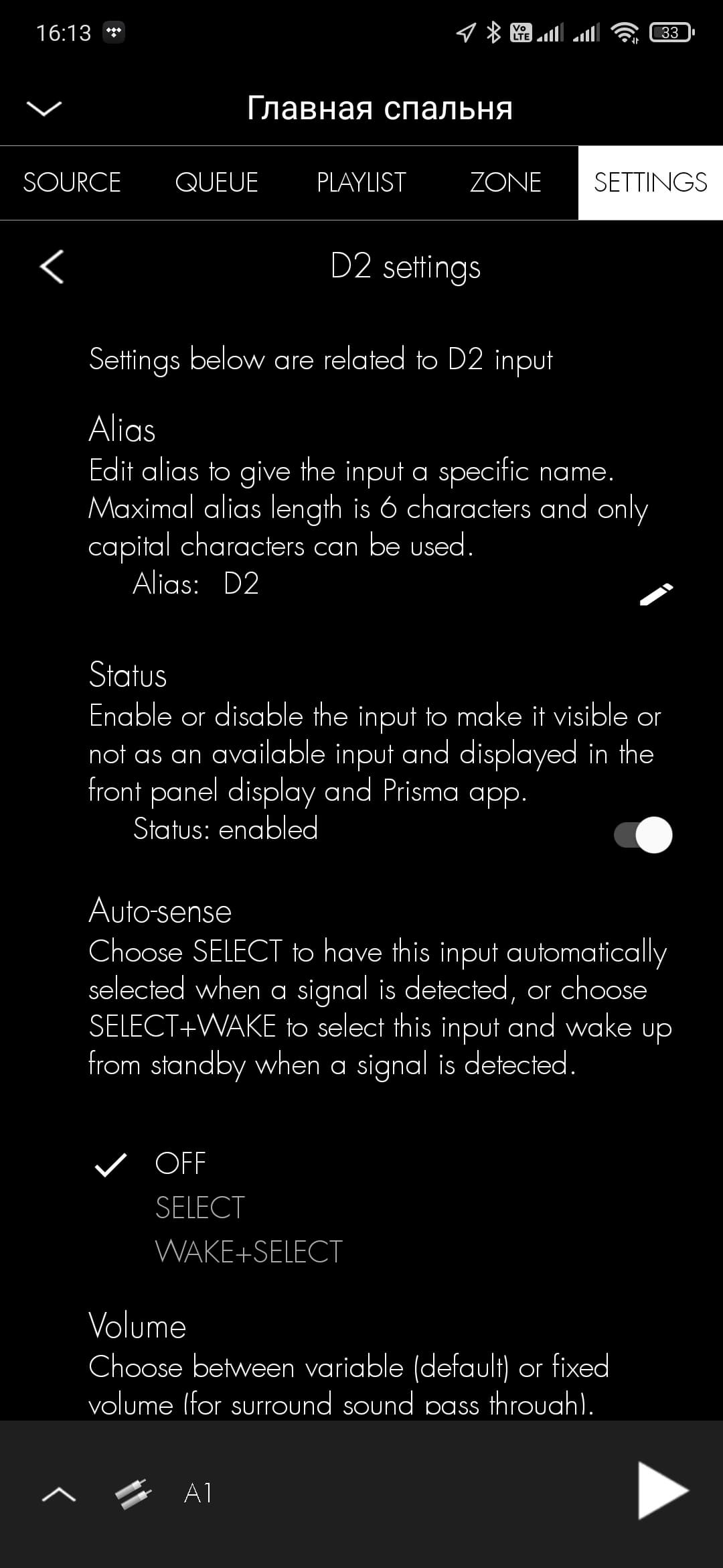 Наполнение главного экрана практически то же, что и у NP5 Prisma. Добавился лишь выбор активного входа, для каждого из которых можно назначить свое имя. Также присутствует возможность исключить тот или иной источник из списка активируемых — очень удобно. Усилитель может включаться и активировать вход при поступлении на него сигнала, варианты того, как именно это делать, тоже доступны в меню настроек.