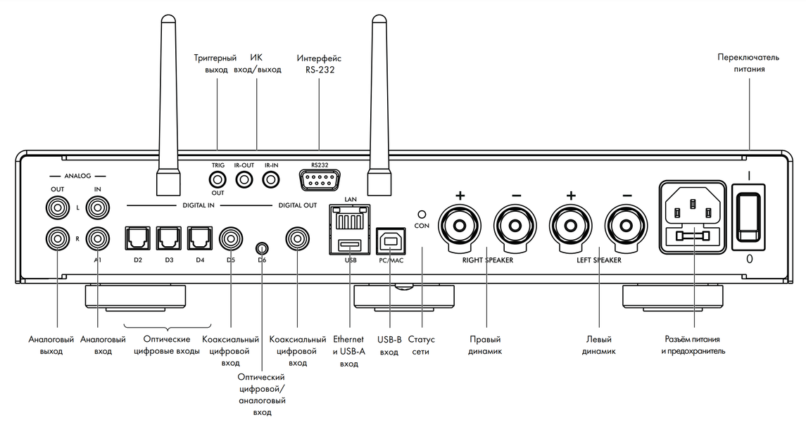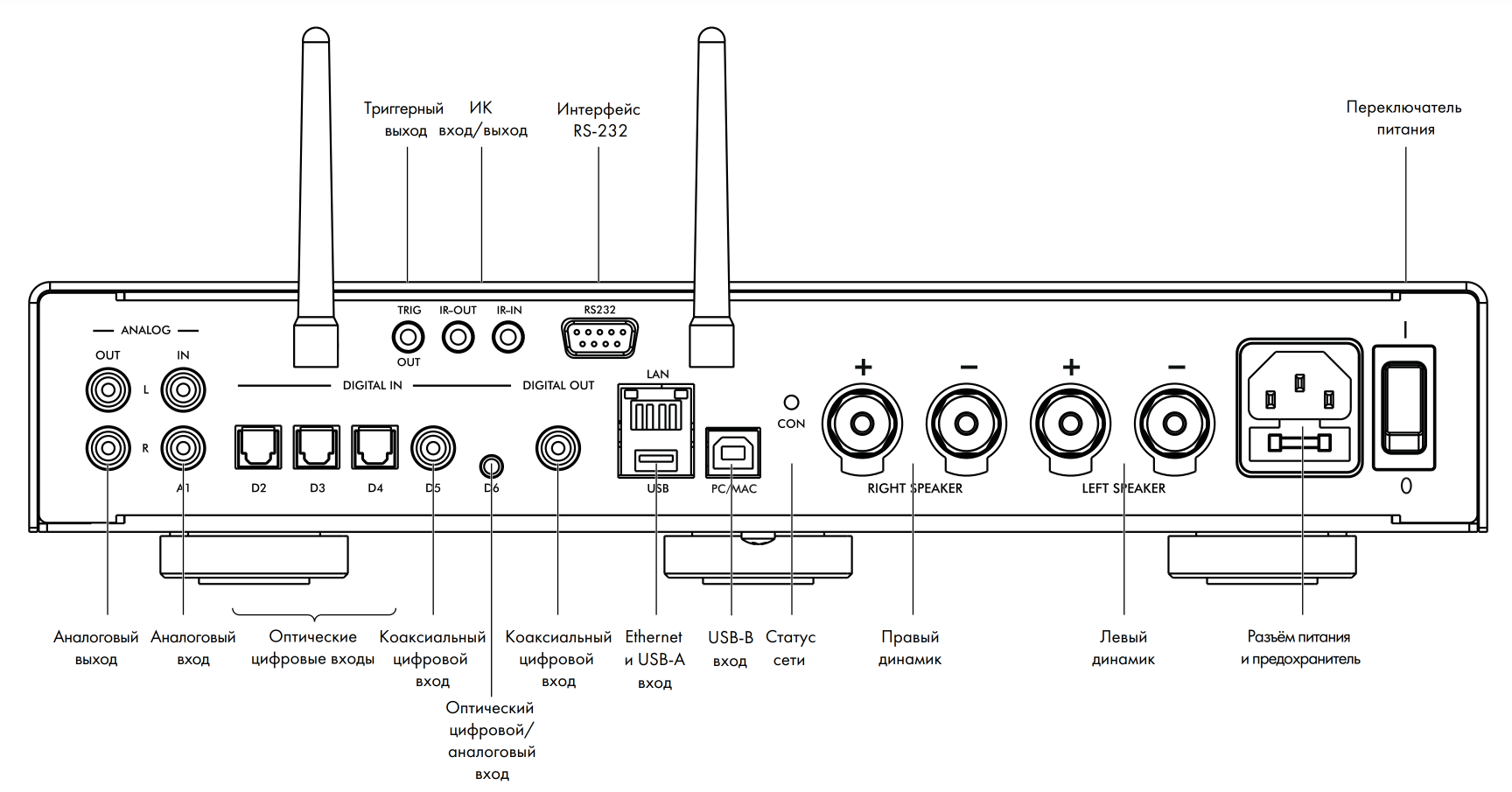 Антенны съемные, а количество разъемов довольно велико — перечислять их друг за другом будет долго и бессмысленно. Сразу стоит отметить, что прибор способен обеспечить своего владельца контентом и сам по себе, тем не менее к нему можно подключить и CD-транспорт, и виниловый проигрыватель через внешний фонокорректор, и телевизор… В общем, устройство вполне универсальное и может выполнять сразу несколько задач.