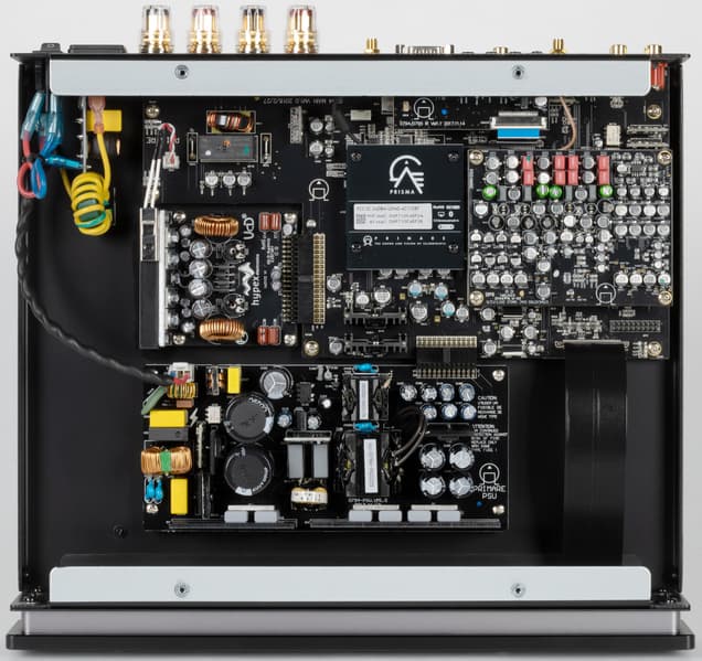 Внутрь усилителя тоже непременно заглянем. Верхняя крышка легко снимается, качество сборки всего увиденного под ней находится на уровне, которого мы ожидаем от устройства такого класса.