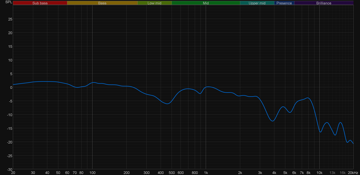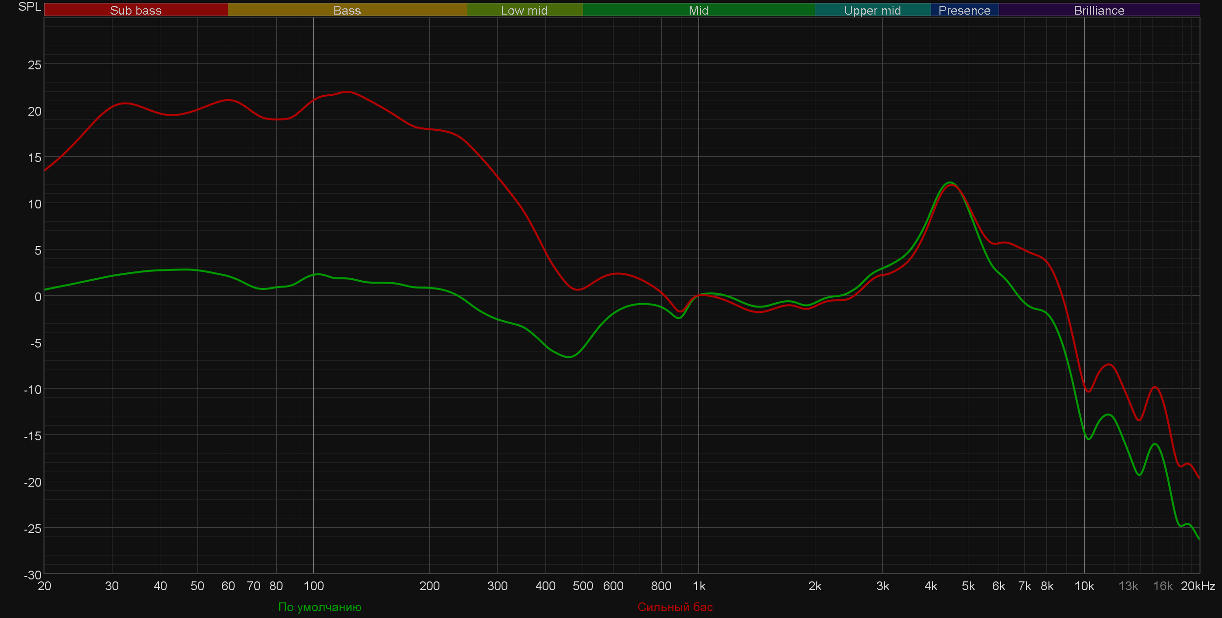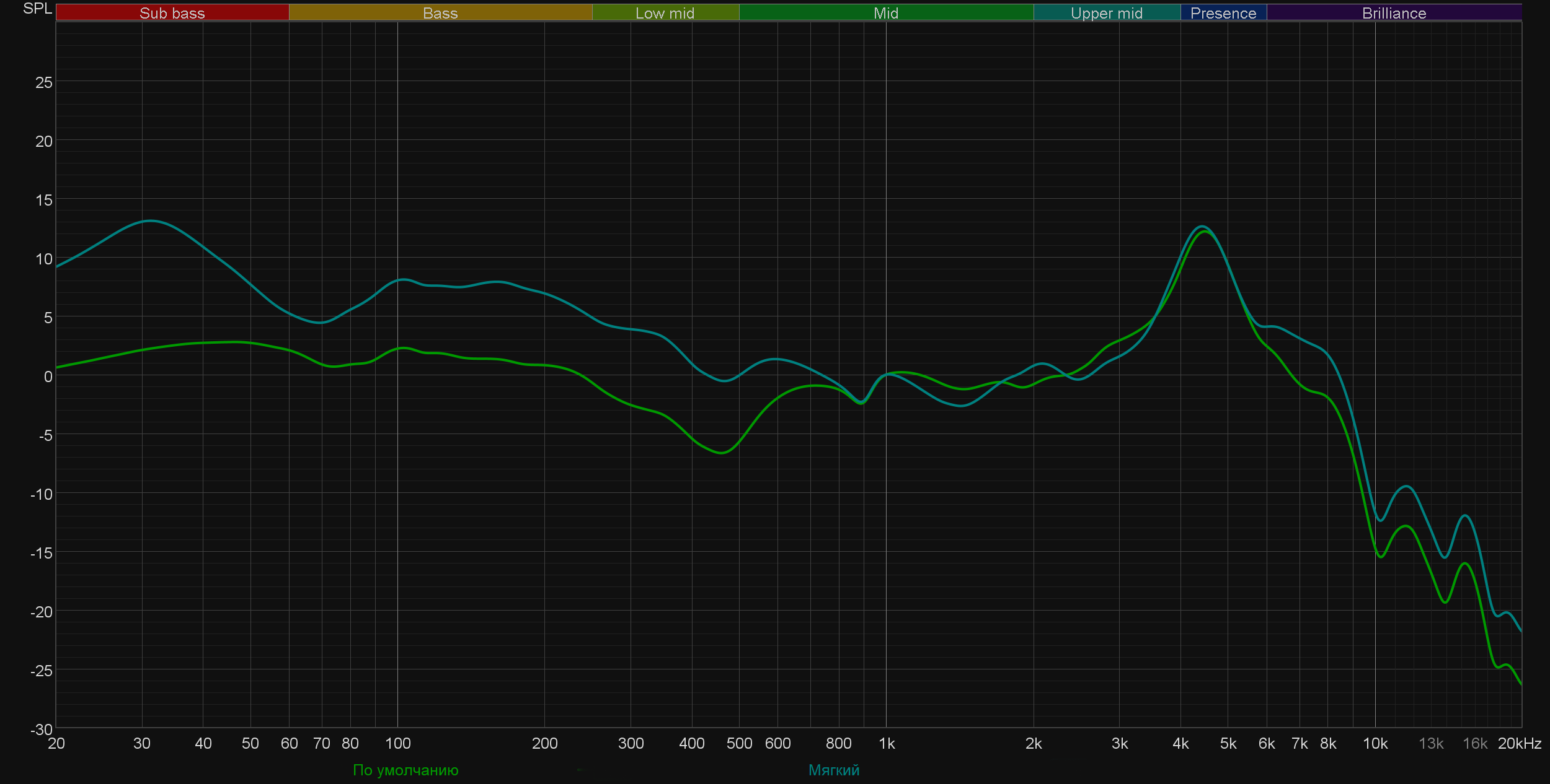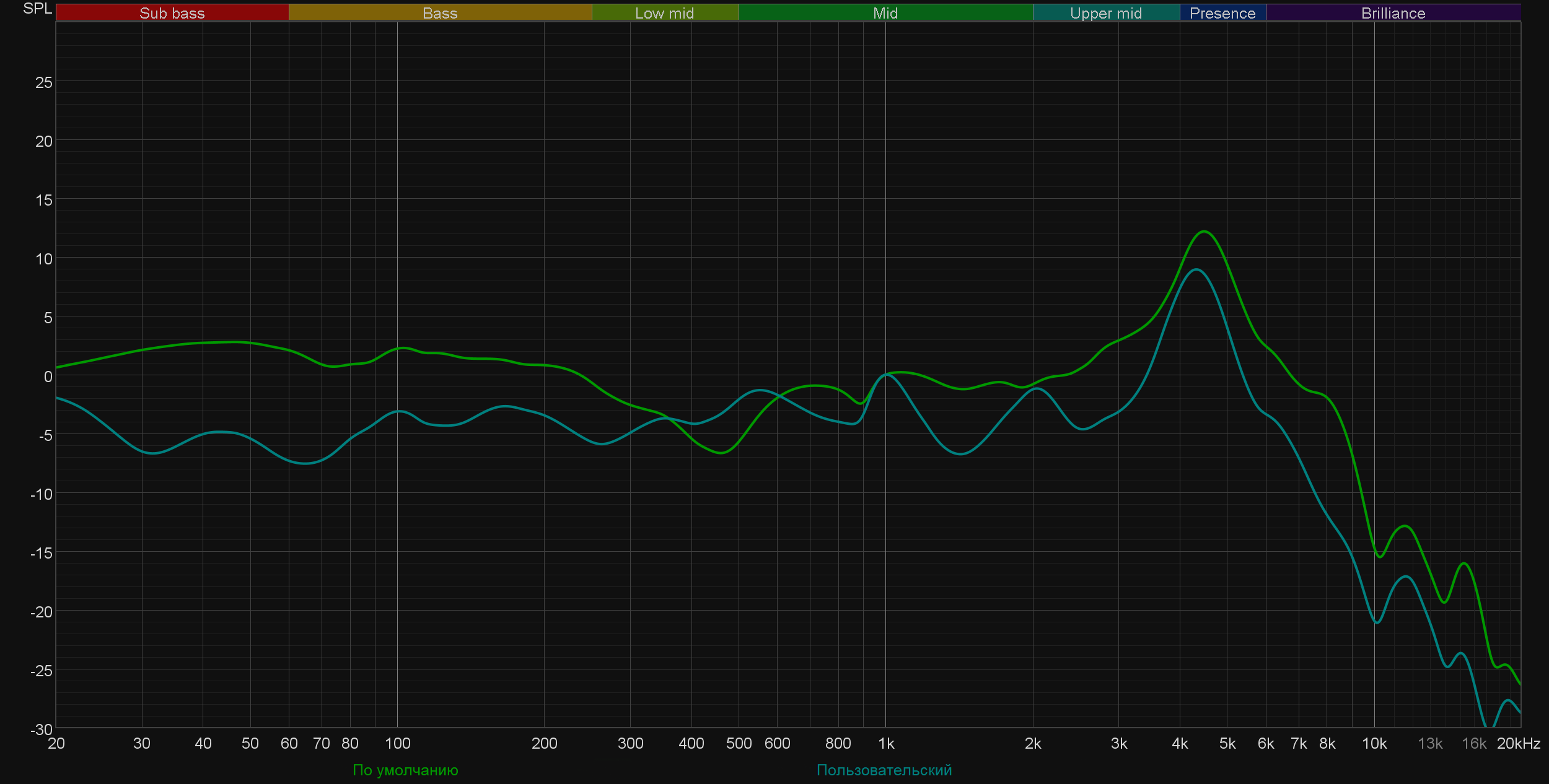 График АЧХ показан на фоне целевой кривой, предоставленной производителем используемого стенда. Она является адаптированным под конкретное устройство аналогом так называемой «кривой Хармана», созданной командой Harman International под руководством доктора Шона Олива. Люди неодинаково воспринимают звук разной частоты, поэтому даже самые точные измерения могут не соответствовать реальному пользовательскому опыту. Для компенсации этих различий и используется целевая АЧХ. Близкое к ней звучание оценивалось сотнями участников экспериментов как нейтральное, сбалансированное, естественное и так далее.