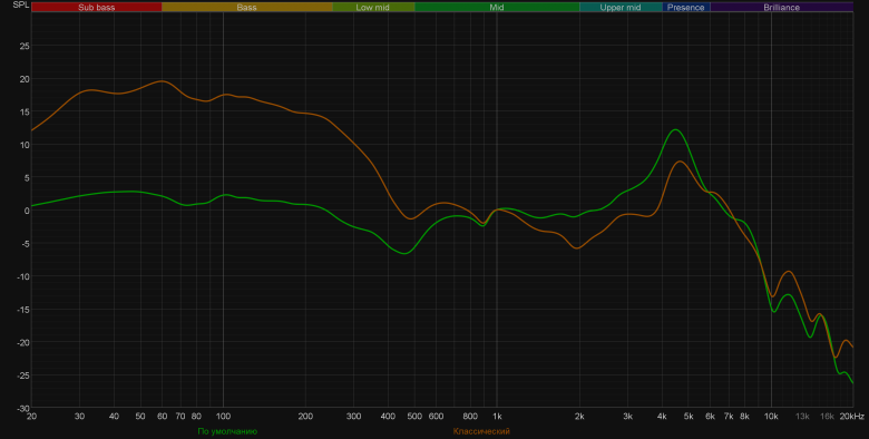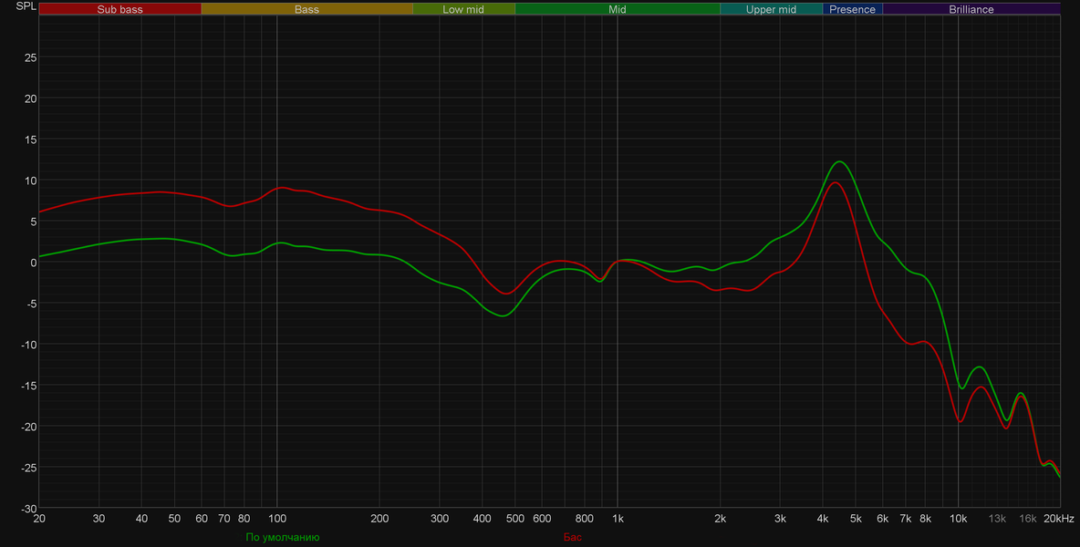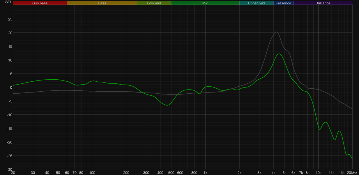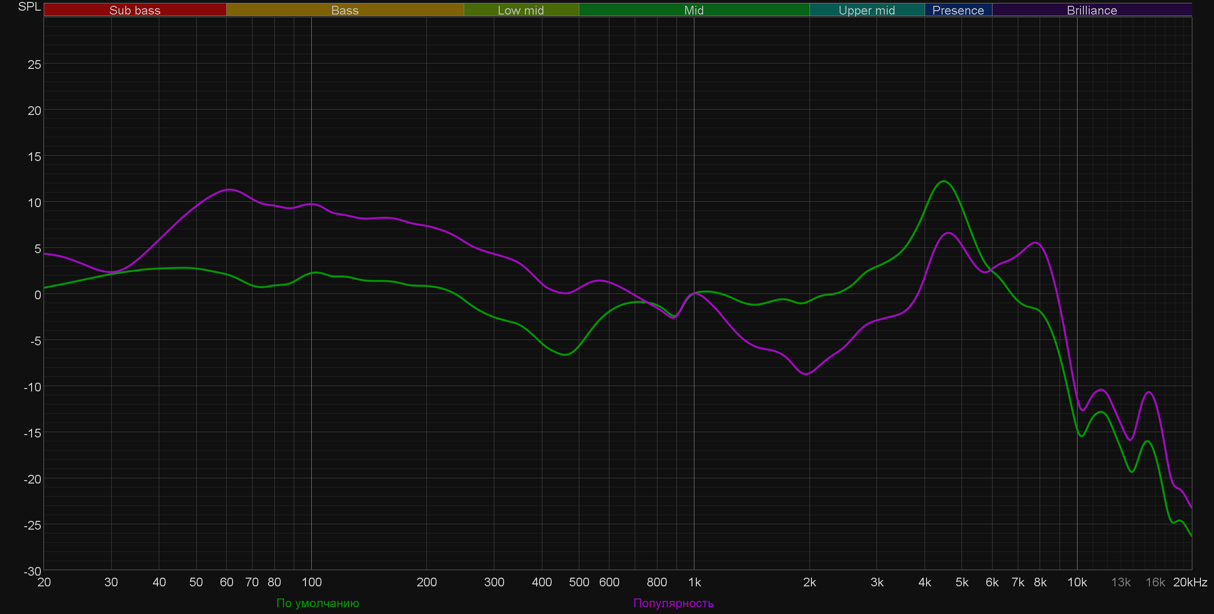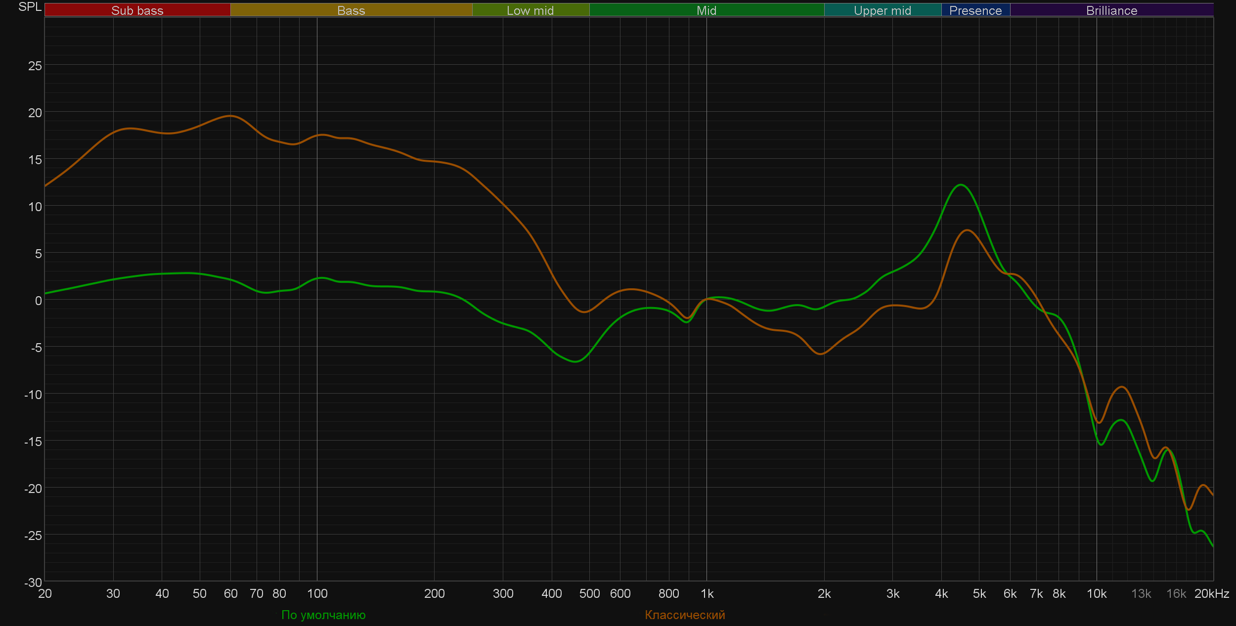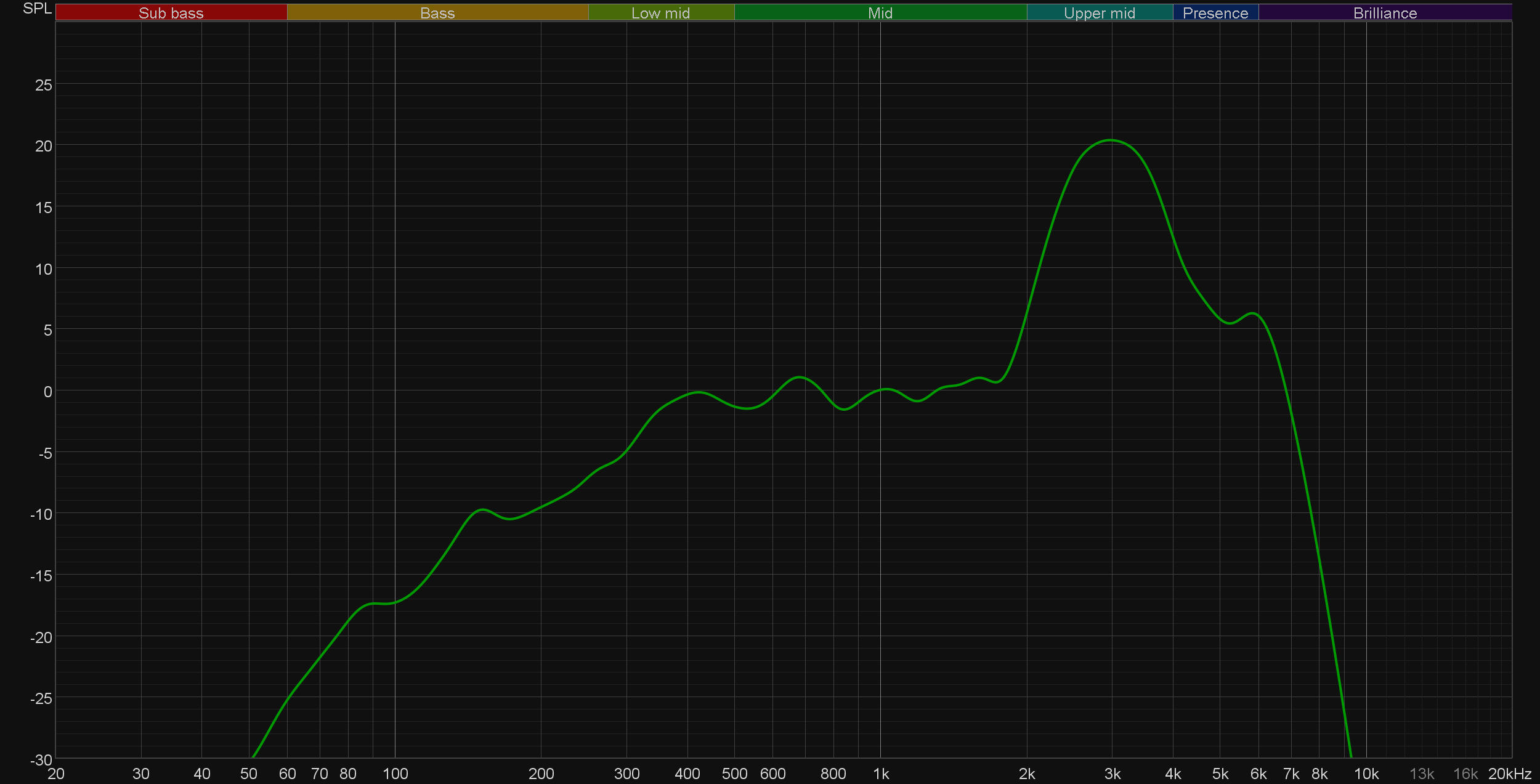 График АЧХ показан на фоне целевой кривой, предоставленной производителем используемого стенда. Она является адаптированным под конкретное устройство аналогом так называемой «кривой Хармана», созданной командой Harman International под руководством доктора Шона Олива. Люди неодинаково воспринимают звук разной частоты, поэтому даже самые точные измерения могут не соответствовать реальному пользовательскому опыту. Для компенсации этих различий и используется целевая АЧХ. Близкое к ней звучание оценивалось сотнями участников экспериментов как нейтральное, сбалансированное, естественное и так далее.