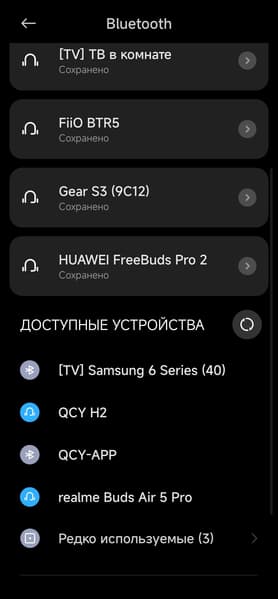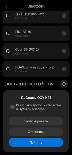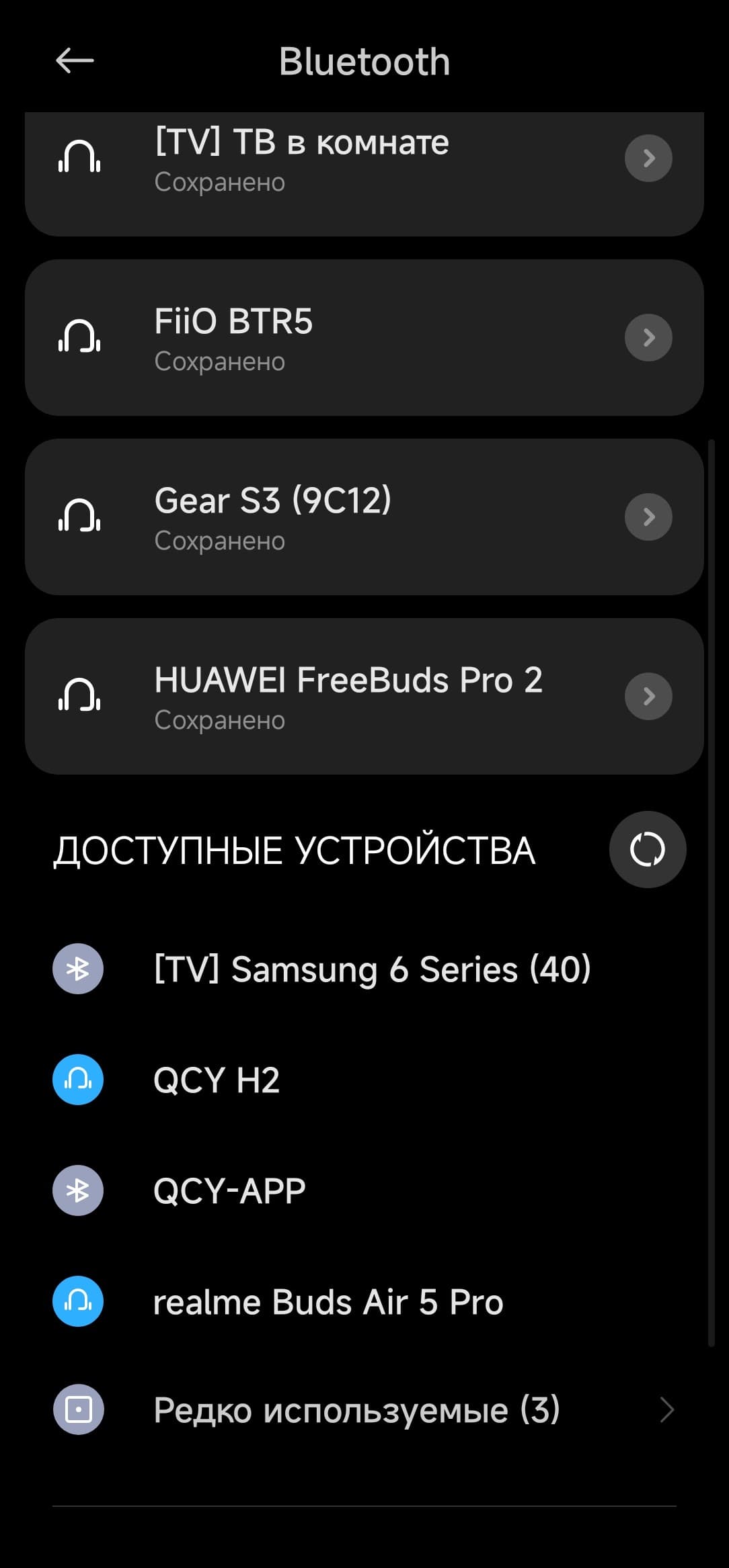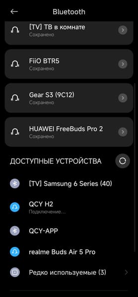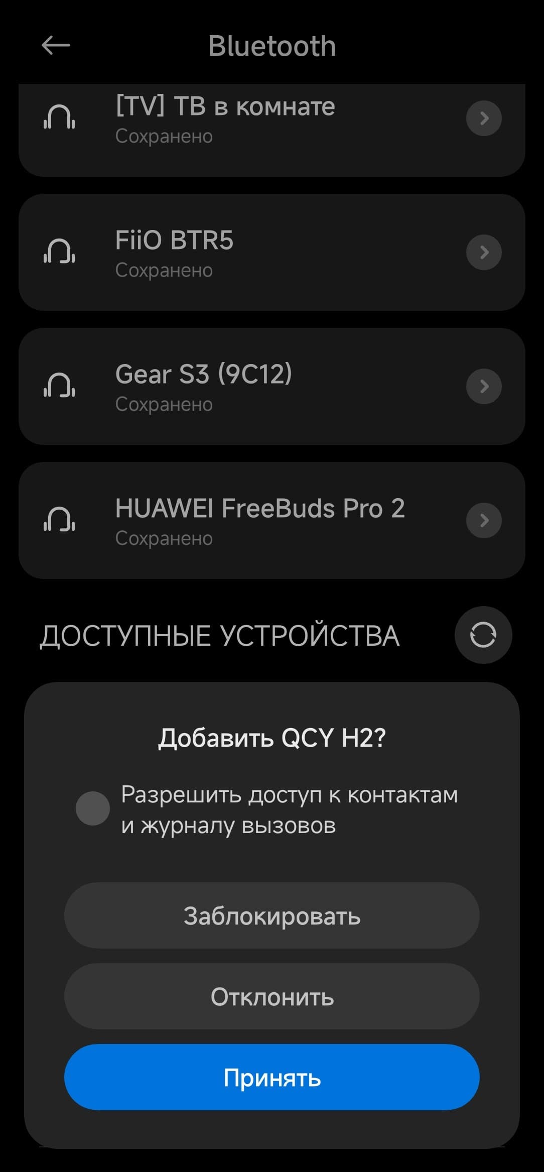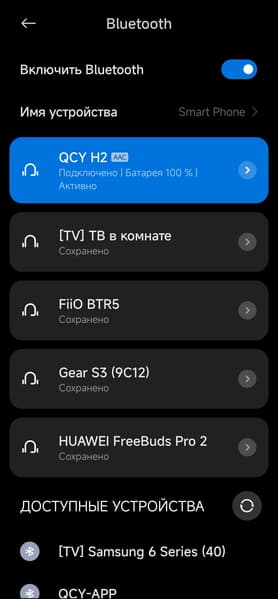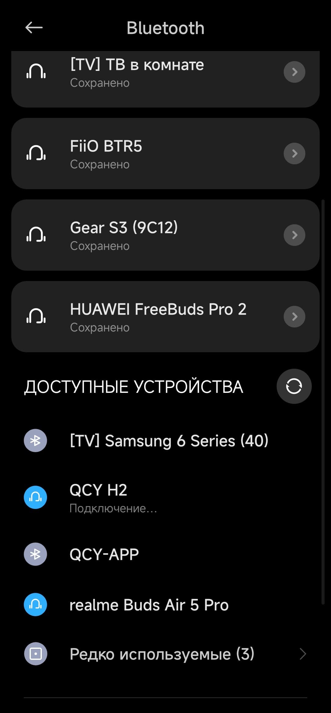 Беспроводное подключение осуществляется стандартным образом: после включения наушники несколько секунд пытаются подключиться к уже «знакомым» устройствам, а если таковых не обнаруживается — активируют режим сопряжения. Остается найти QCY H2 в соответствующем меню источника звука.