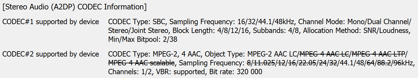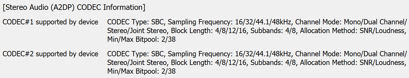 Полный список поддерживаемых кодеков и их режимов мы традиционно получили с помощью утилиты Bluetooth Tweaker. Кодеков всего два — SBC и AAC, их для бюджетной гарнитуры достаточно. Но есть нюансы.