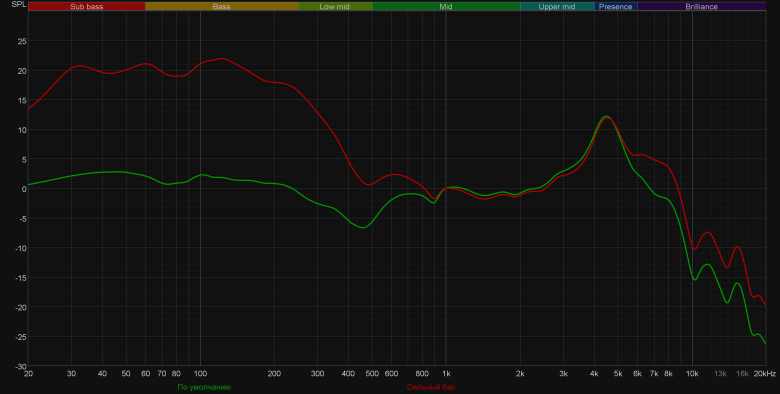 А вот со звуком всё совсем плохо — не будем даже пытаться подобрать какую-то более щадящую формулировку. Гулкий форсированный бас, лишенная даже намека на детальность середина, невнятный ВЧ-диапазон, который при этом умудряется еще и выдавать все характерные для него проблемы, включая так называемый «песок». Проиллюстрируем сказанное с помощью графика АЧХ.