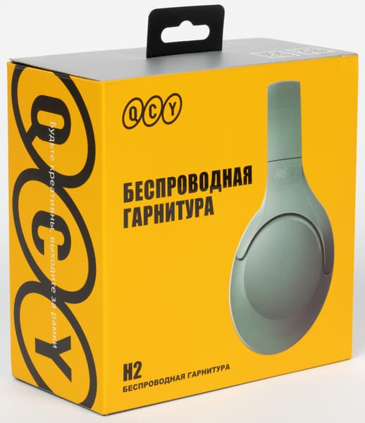 Поставляются QCY H2 в симпатичной желтой коробке, на которую нанесены логотипы, описания и изображение устройства. Наушники внутри дополнительно упакованы в пластиковый пакет и более-менее надежно удерживаются с помощью картонных вставок.
