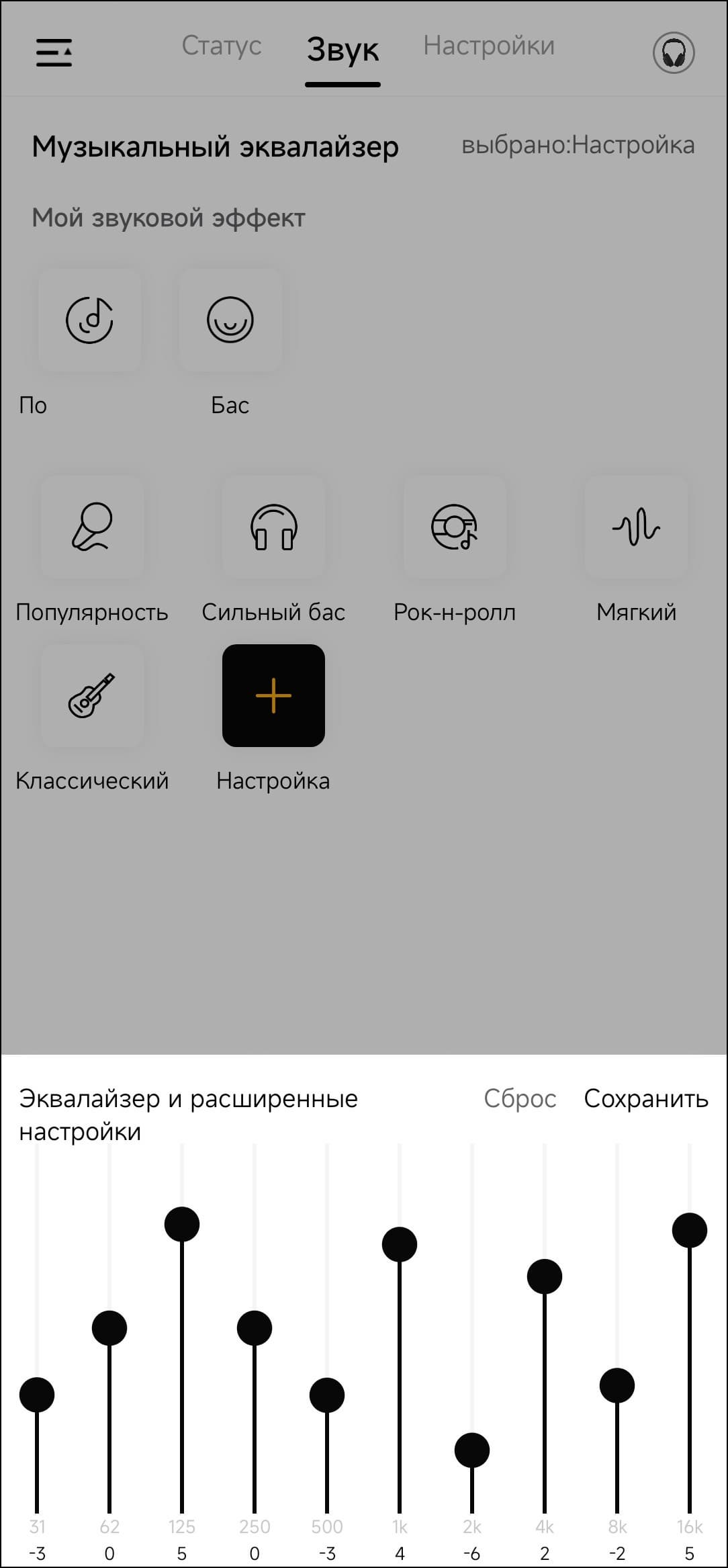 Но каждый новый пресет эквалайзера в приложении раскрывает новые грани этого самого «хуже» — ни один из них не сделал звучание лучше. В попытках проверить эффективность встроенного эквалайзера мы убрали все регуляторы вниз, а «ползунки» на 500 Гц, 1 кГц, 2 кГц, 4 кГц — полностью вверх. И неожиданно «выровняли» АЧХ. Но звучит это, конечно же, всё равно ужасно — никакими программными средствами эти наушники не спасти.