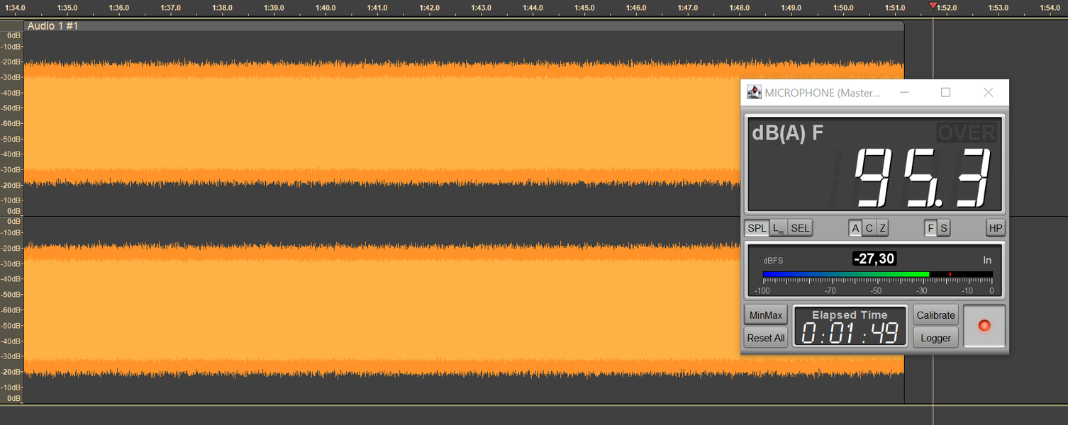 Безопасным уровнем звукового давления при прослушивании музыки считается 75 дБ, но на практике большинство слушателей предпочитает уровень 90-100 дБ. Мы транслируем в наушники белый шум, фиксируя уровень SPL в районе 95 дБ, сразу после старта воспроизведения запускаем запись сигнала с измерительного стенда — по длине получившегося трека легко понять, сколько проработал каждый из наушников.