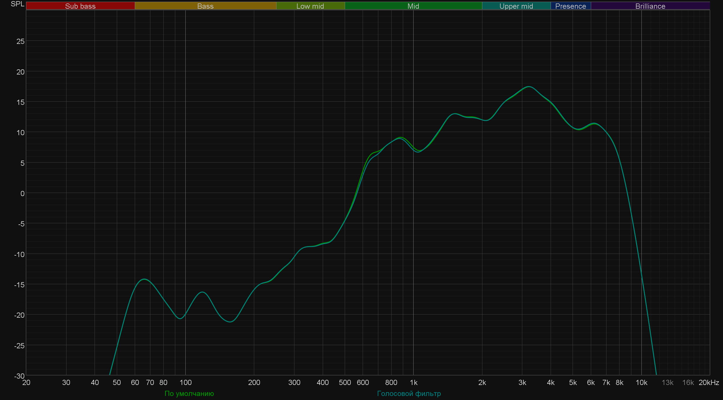 Как можно заметить, микрофон полностью игнорирует низкочастотный диапазон — учитывая, что предназначен он для передачи голоса, это вполне нормально и правильно. Включение «голосового фильтра» на АЧХ влияния не оказывает — по всей видимости, на свип-тоне его действие не заметно, но при реальной эксплуатации гарнитуры уровень шумов немного снижается. От звуков дыхания и «взрывных согласных» спасает ветрозащита — в целом получается очень даже неплохо.