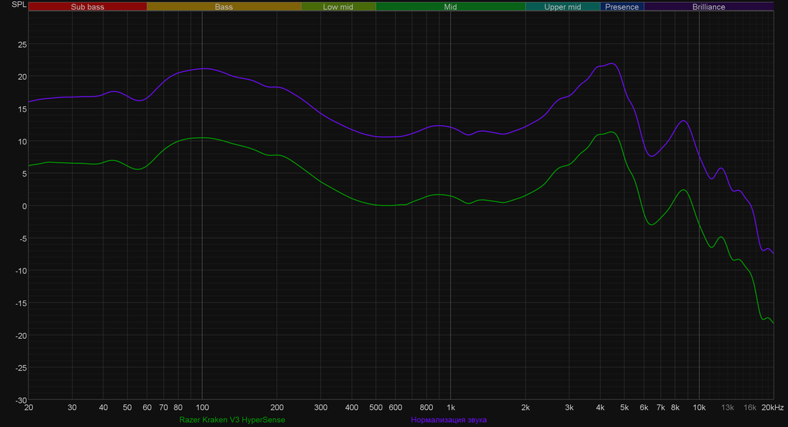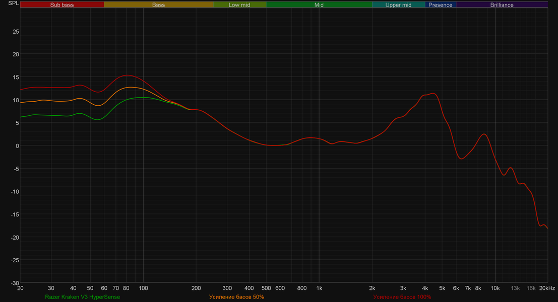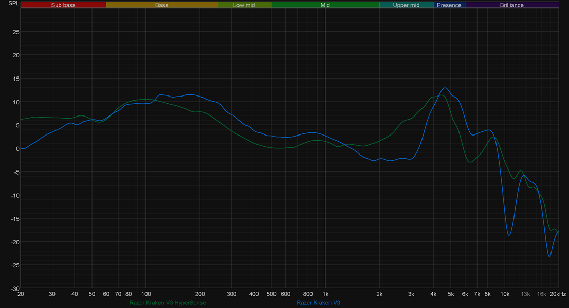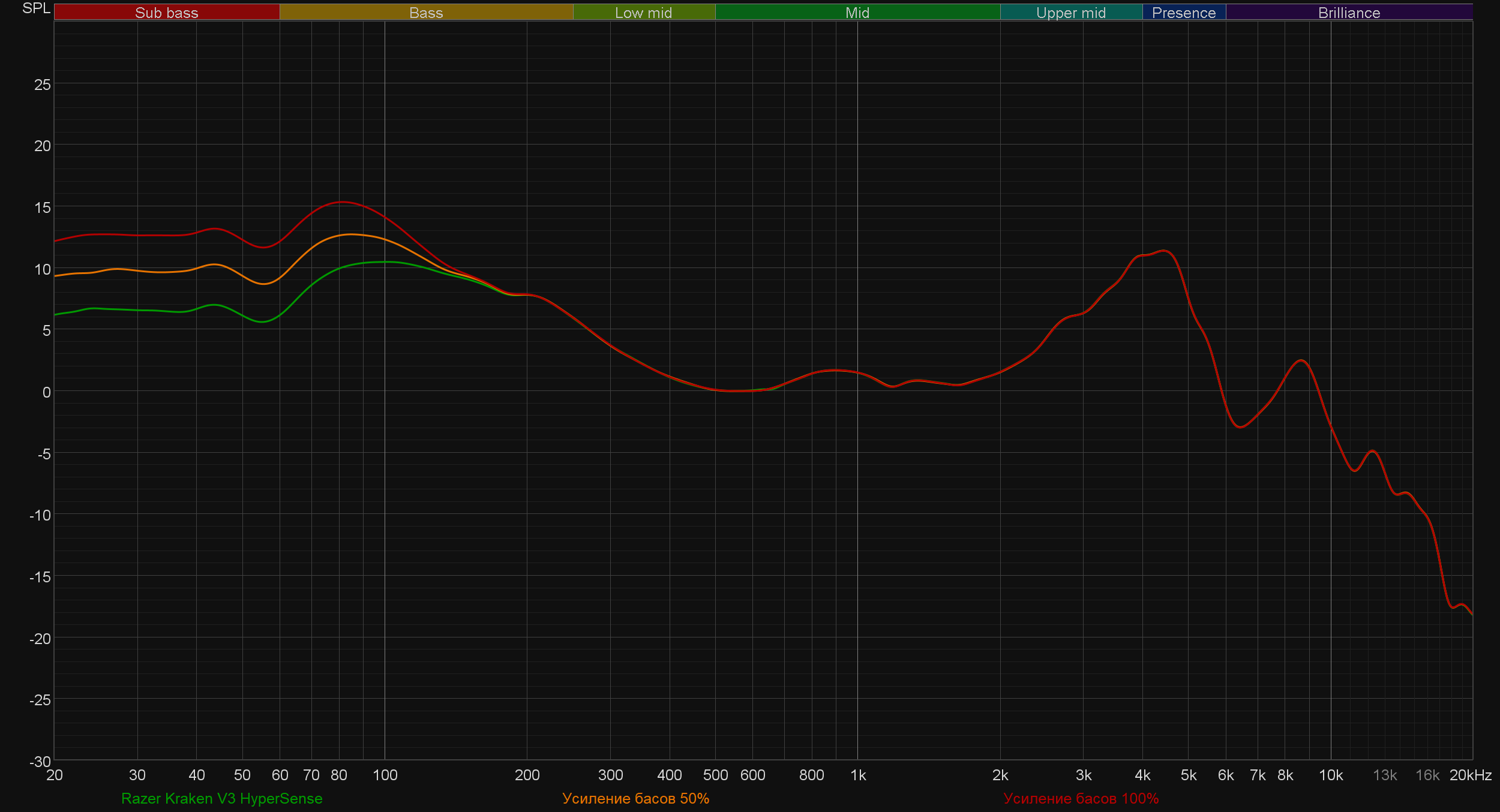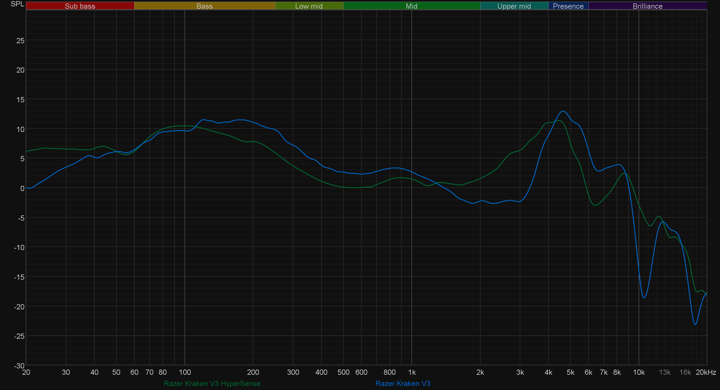 Внутри чашек Kraken V3 HyperSense производителю пришлось разместить еще и вибромотры, тогда как у базовой модели их нет. Соответственно, и звучание довольно заметно изменилось. Для наглядности посмотрим на оба графика отдельно.