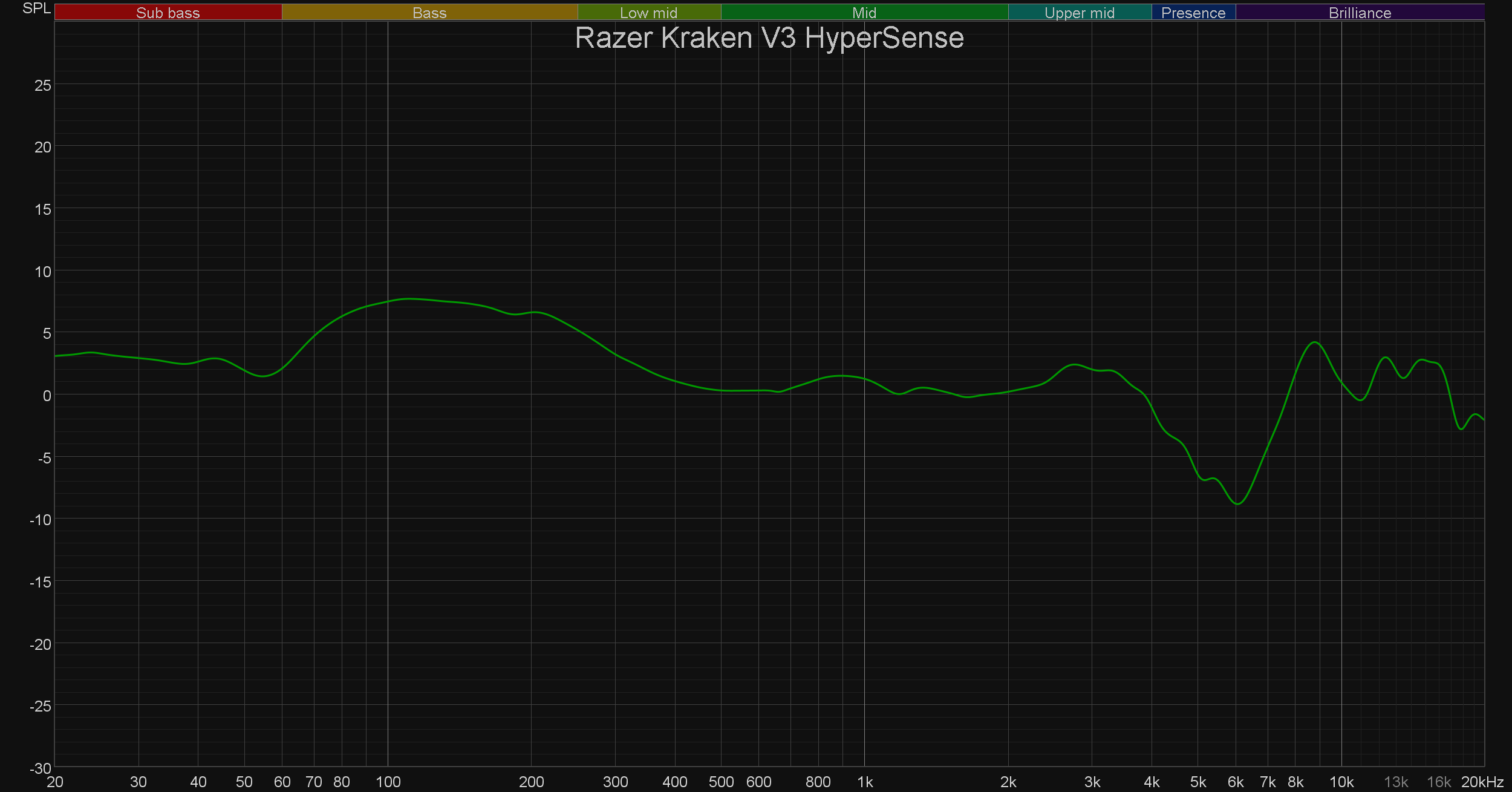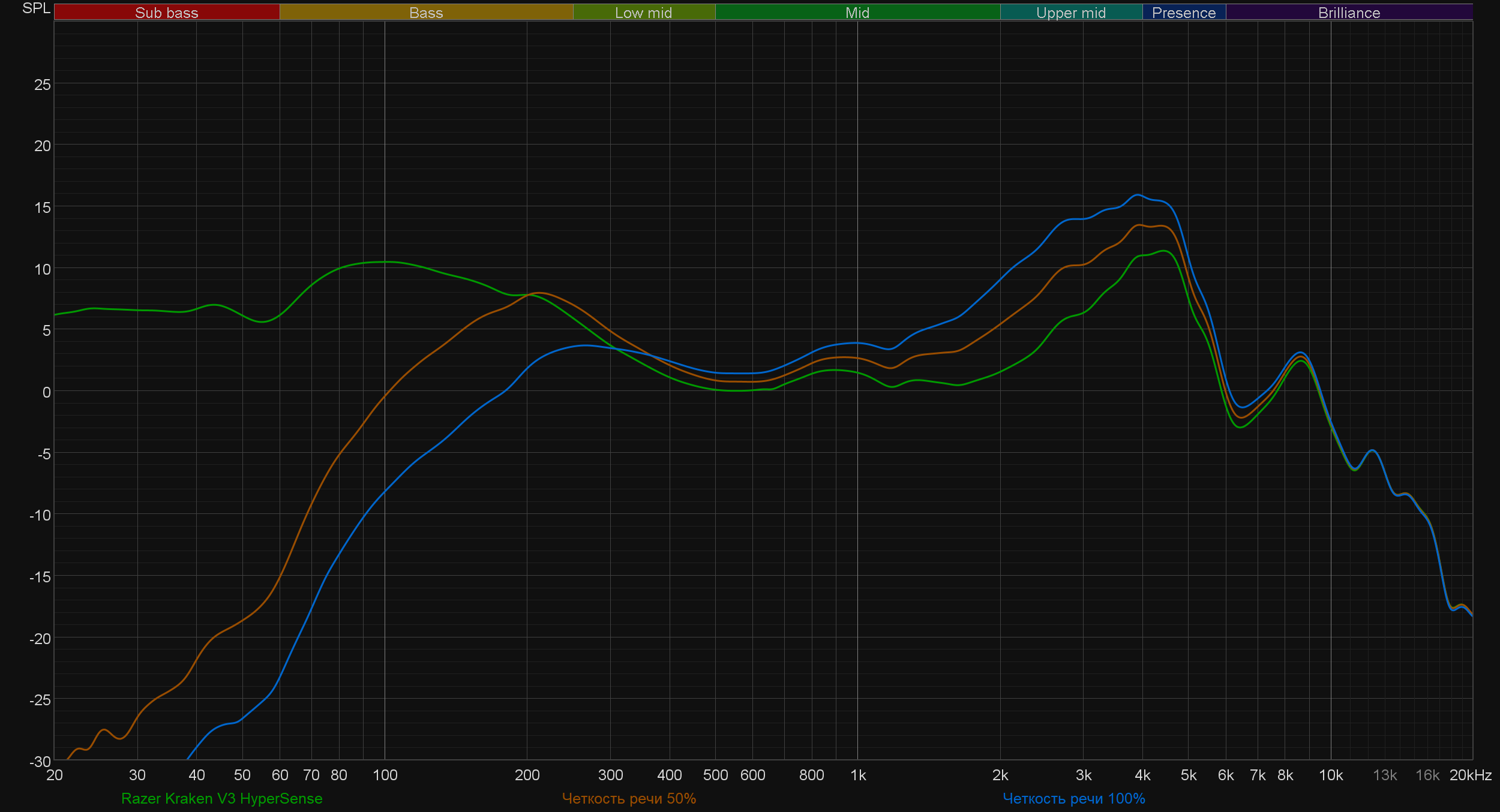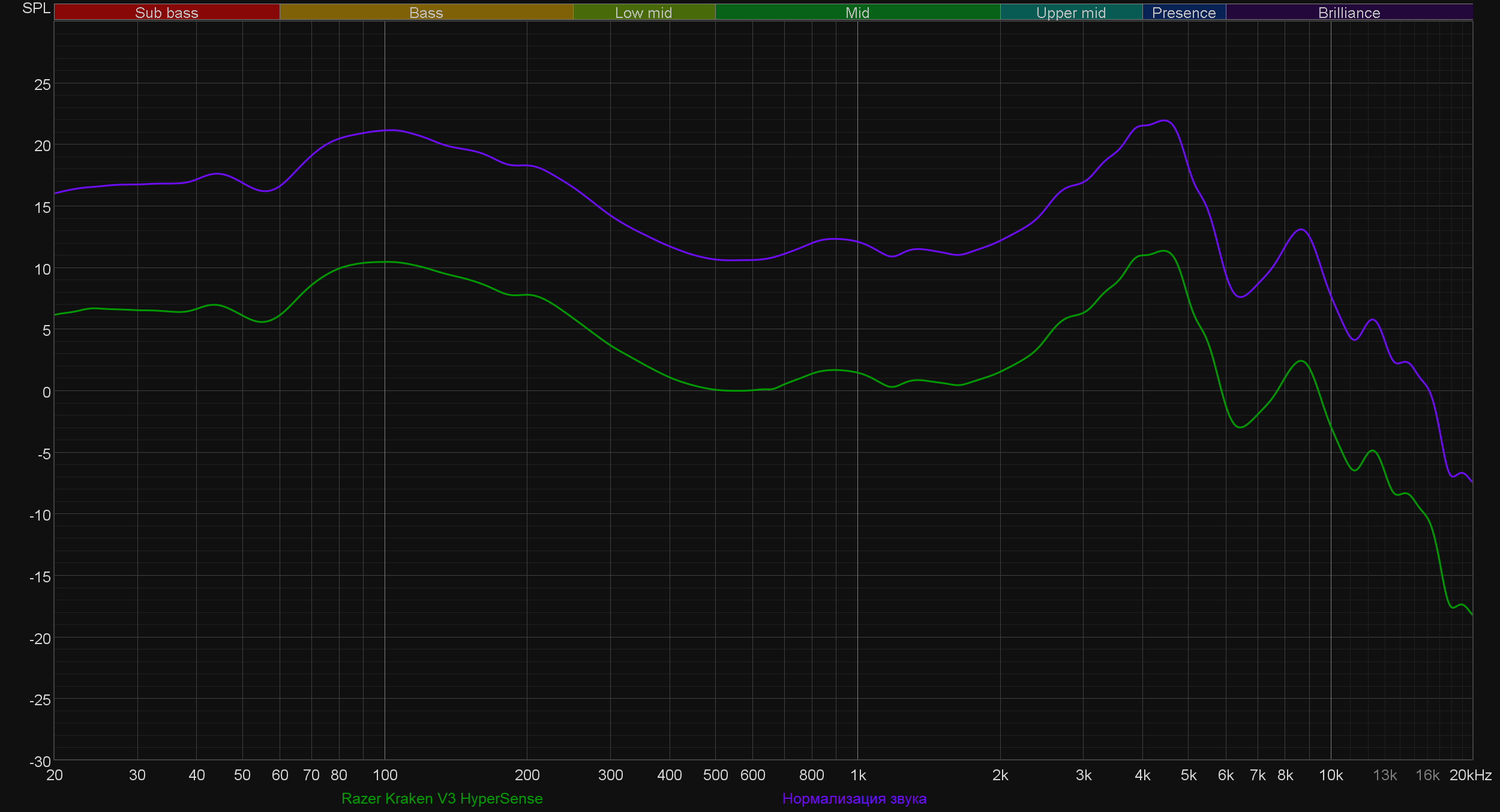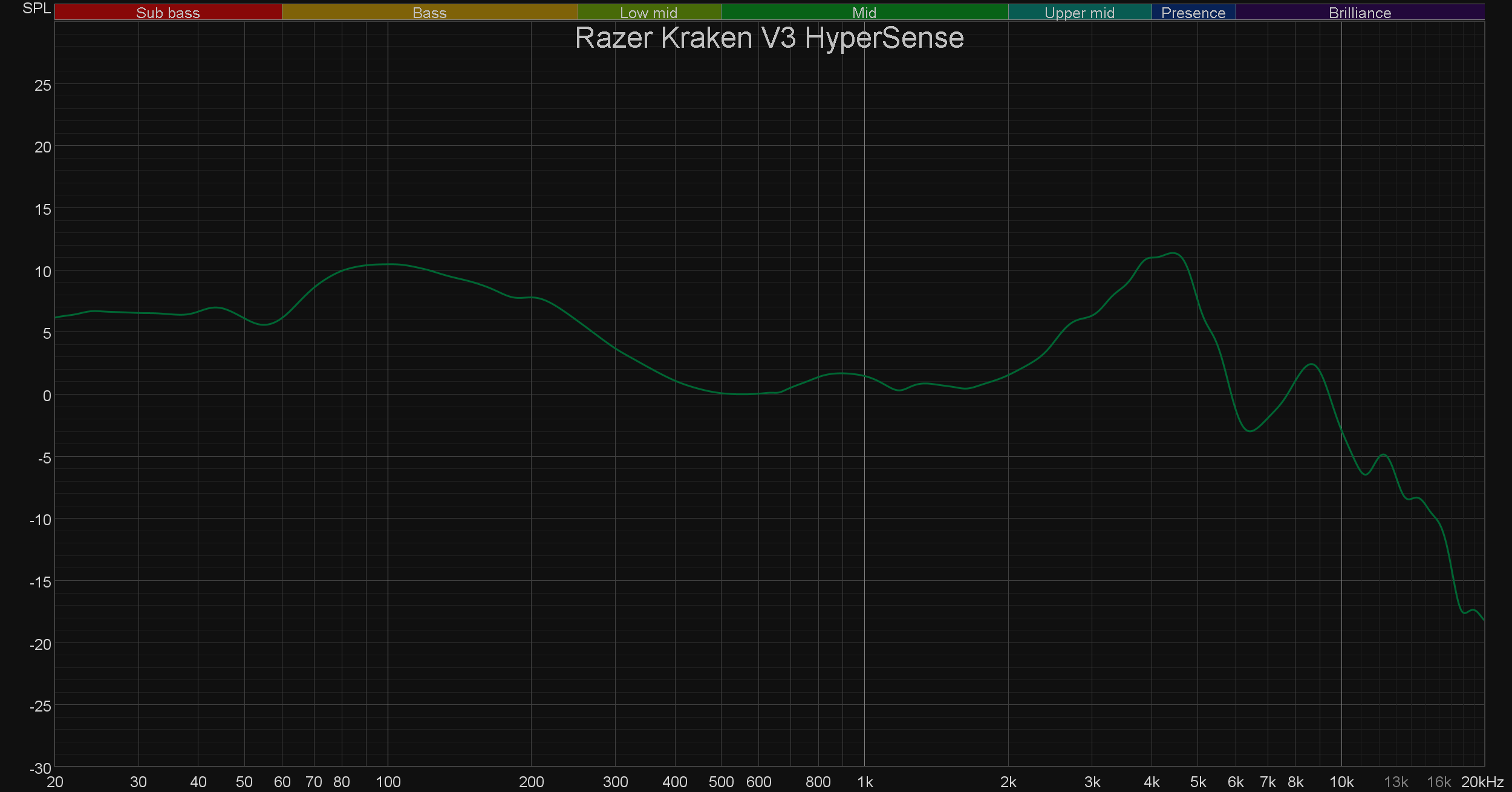 Внутри чашек Kraken V3 HyperSense производителю пришлось разместить еще и вибромотры, тогда как у базовой модели их нет. Соответственно, и звучание довольно заметно изменилось. Для наглядности посмотрим на оба графика отдельно.