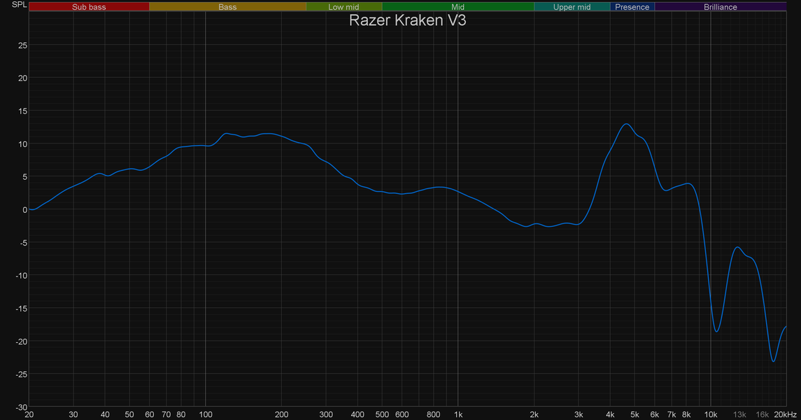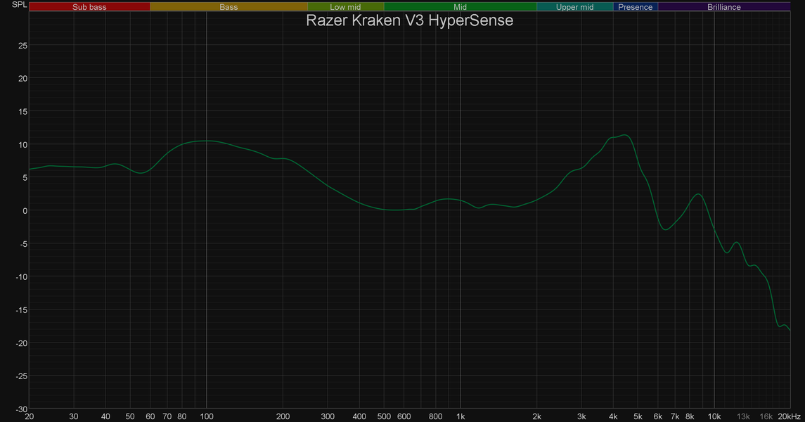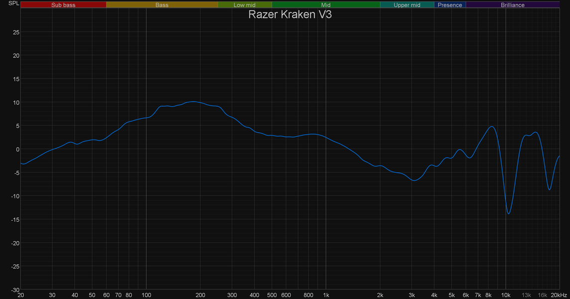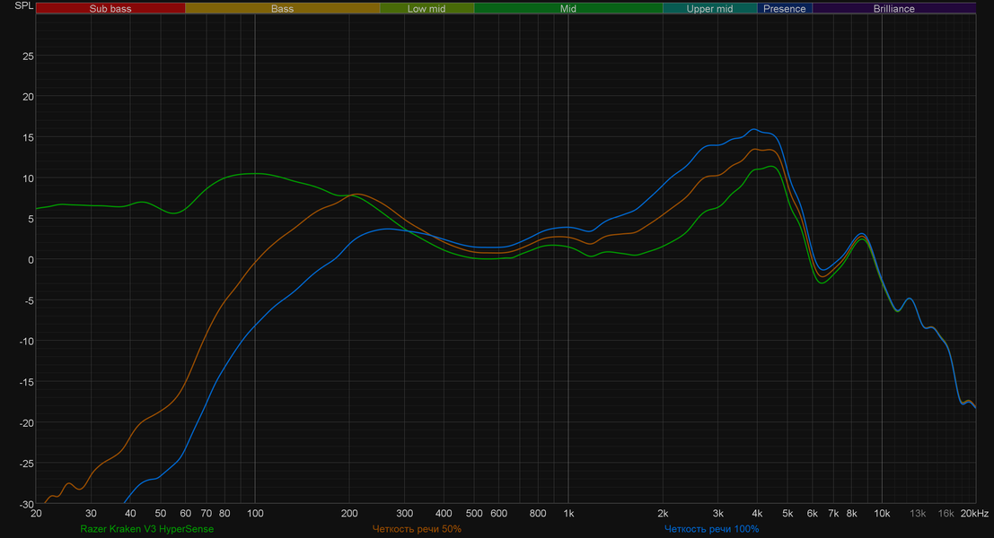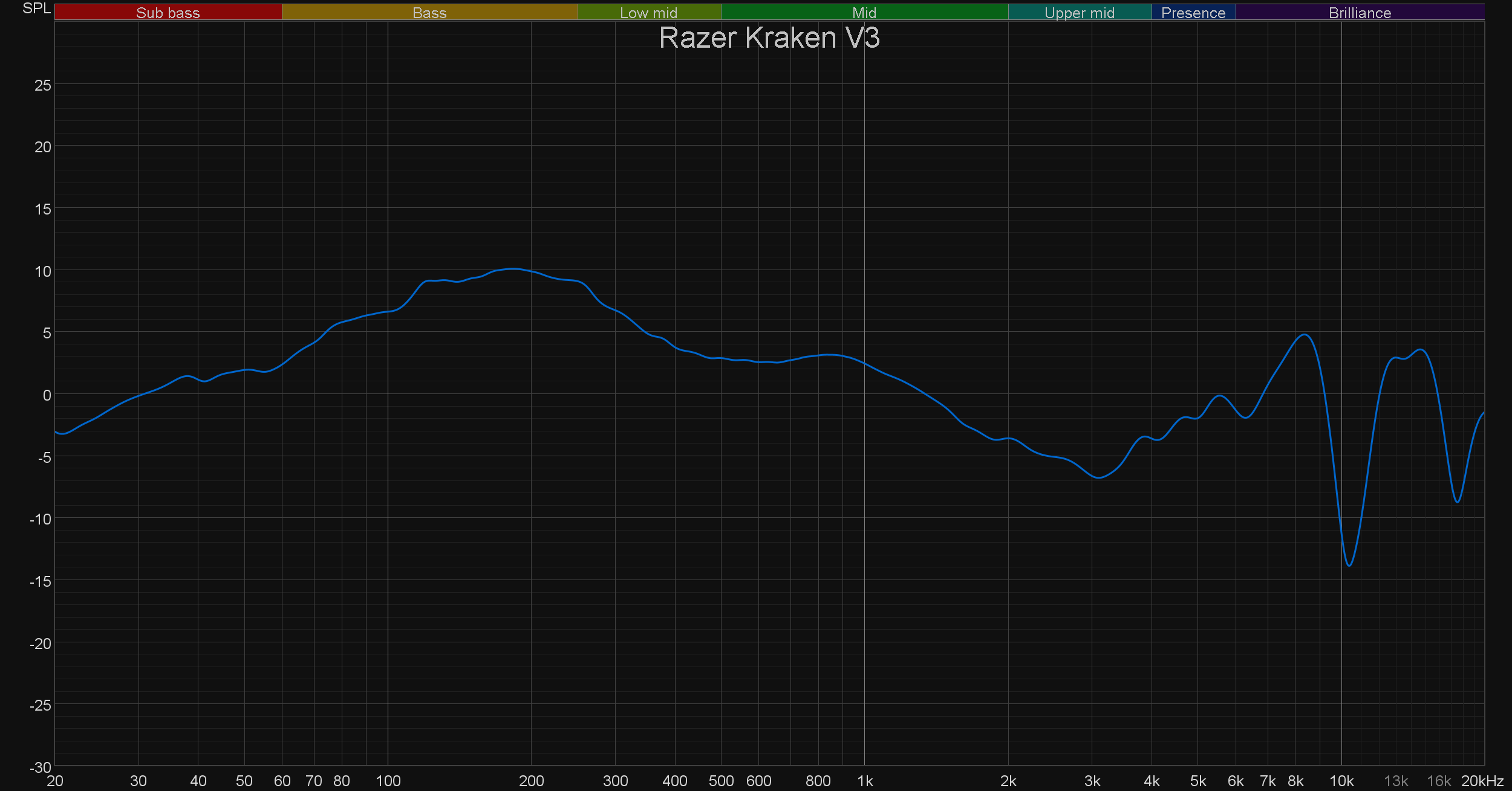 Внутри чашек Kraken V3 HyperSense производителю пришлось разместить еще и вибромотры, тогда как у базовой модели их нет. Соответственно, и звучание довольно заметно изменилось. Для наглядности посмотрим на оба графика отдельно.