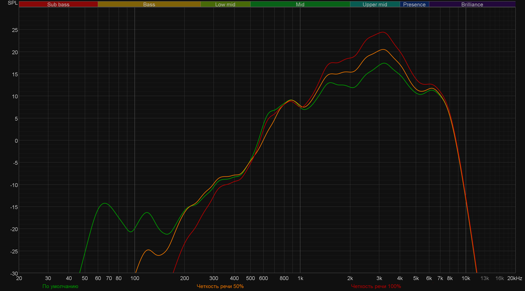 Активация функции «Четкость речи» полностью вырезает низкочастотный диапазон и делает акцент на верхней середине — речь собеседников в таком случае действительно звучит более разборчиво. Во время разного рода онлайн-конференций функция очень пригождается, но перед прослушиванием какого бы то ни было контента ее, конечно же, стоит отключить.