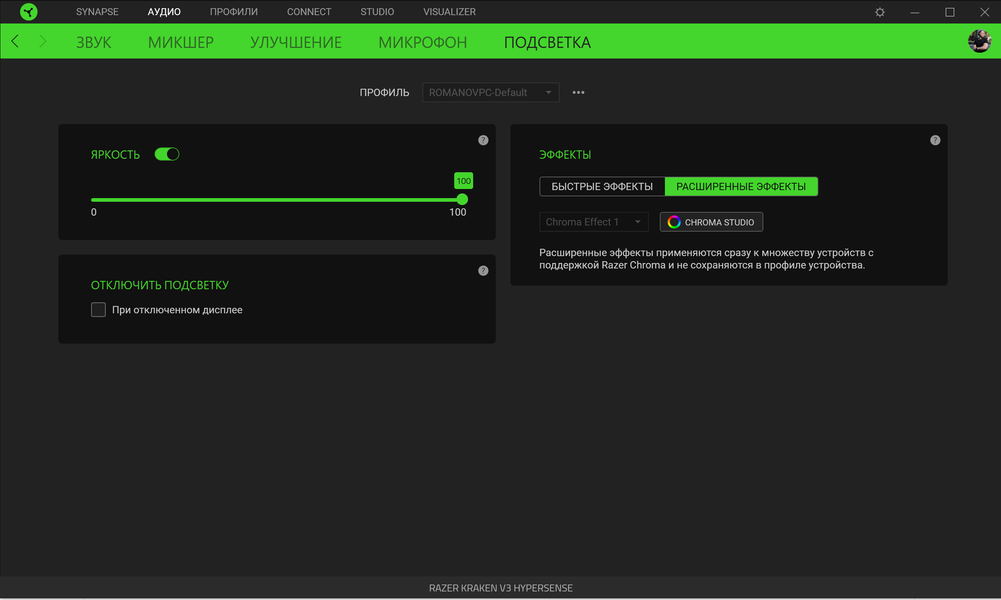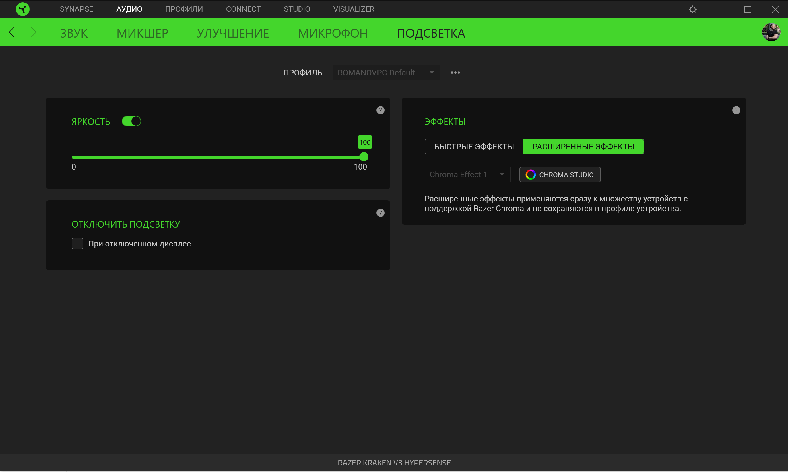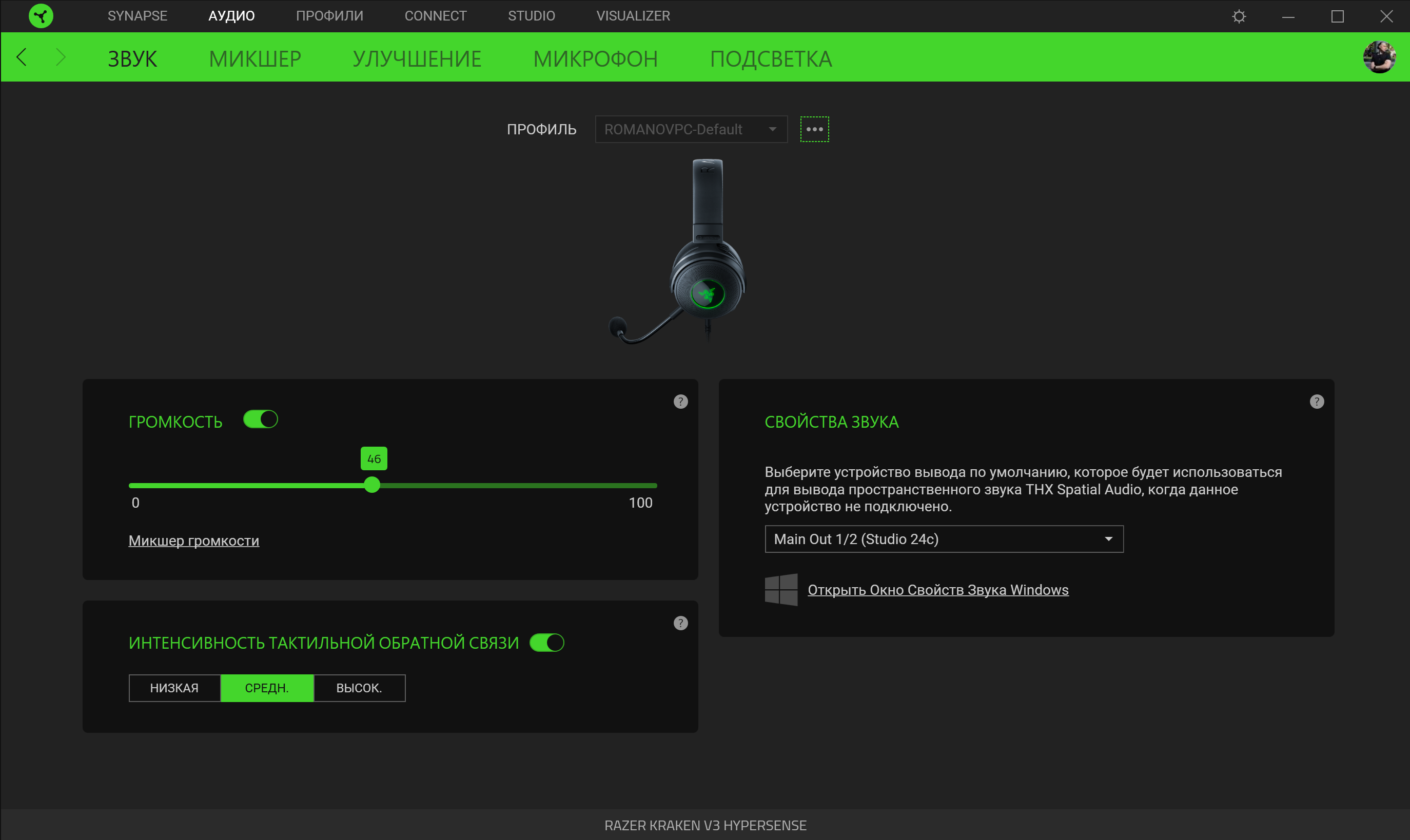 Наушники быстро определяются системой, после чего пользователь получает доступ к внушительному списку различных опций. На первой вкладке можно регулировать громкость звука, а также интенсивность тактильной обратной связи — естественно, только для Kraken V3 HyperSense.