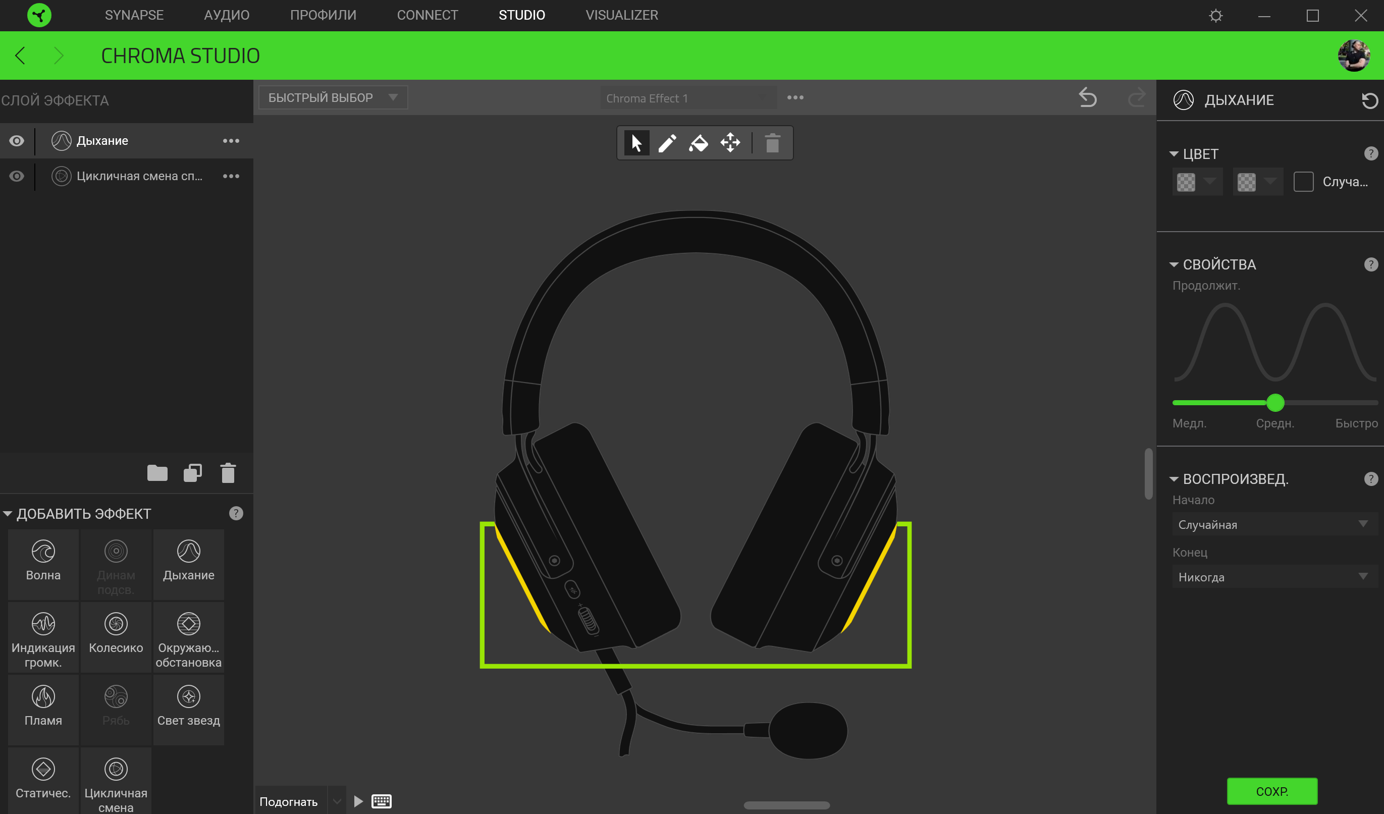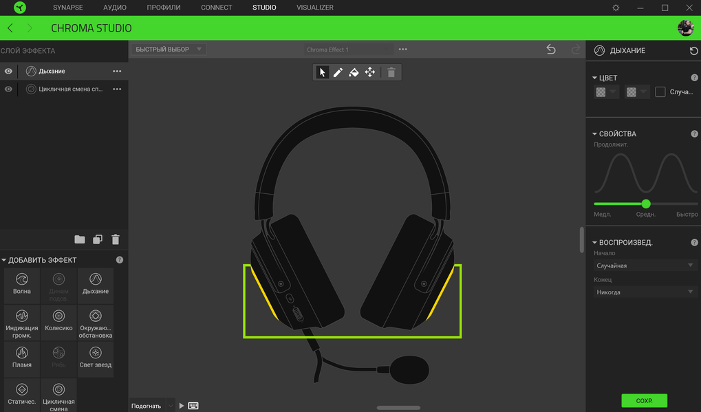 … а вот если перейти в Chroma Studio — можно настроить вообще все: от режимов мерцания до цветов, плюс совместную работу с другими поддерживаемыми устройствами, коих уже свыше 500 (более чем 50 производителей). Ну и, естественно, есть возможность создания профилей под конкретные игры.