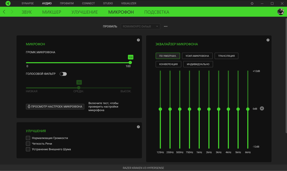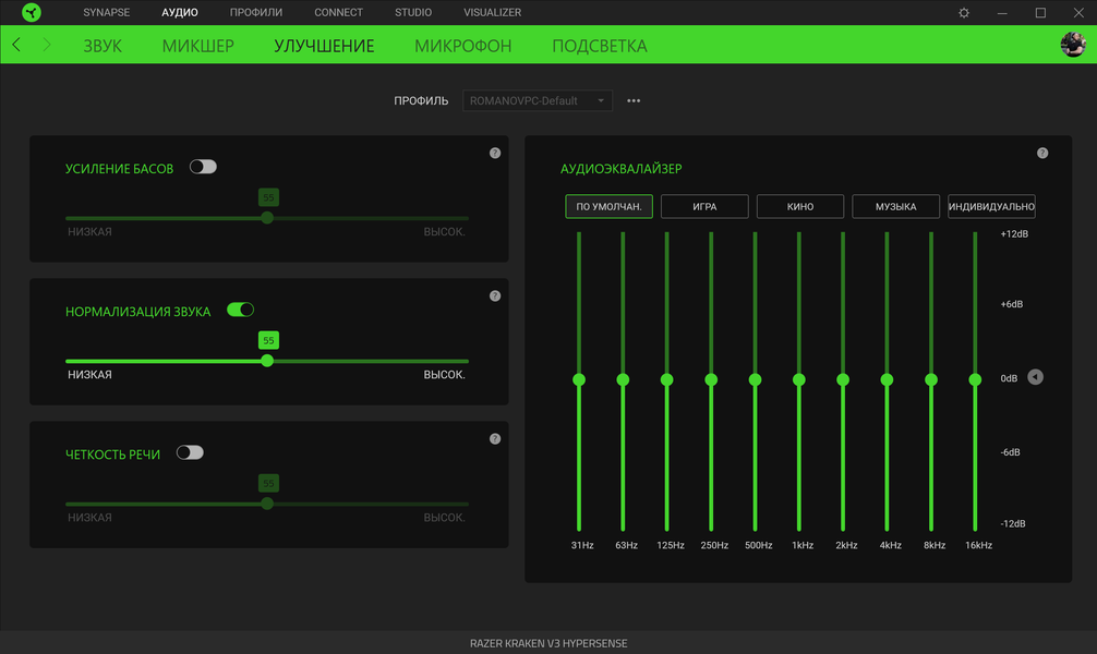 Осталось посмотреть на работу различных «улучшайзеров» и эквалайзера в фирменном ПО. Тут больших отличий нет, потому для примера снова возьмем только одну из тестируемых гарнитур — Kraken V3 HyperSense. Усиление баса делает ровно то, что от него ожидаешь — усиливает бас. Не слишком сильно, но заметно — как раз для более впечатляющего звучания фильмов и игр или какого-нибудь хип-хопа.