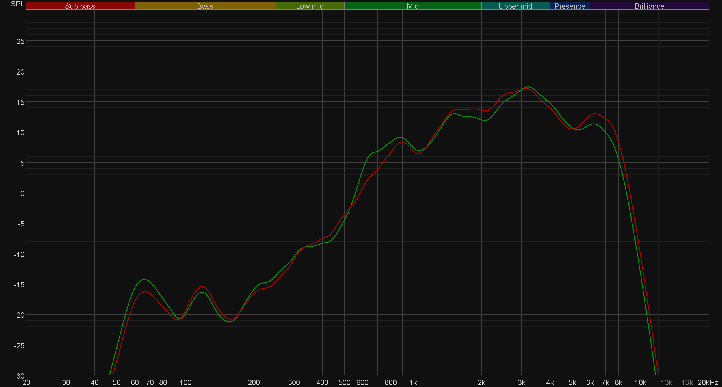 Графики АЧХ показаны на фоне целевой кривой, предоставленной производителем используемого стенда. Она является адаптированным под конкретное устройство аналогом так называемой «кривой Хармана», созданной командой Harman International под руководством доктора Шона Олива. Люди неодинаково воспринимают звук разной частоты, поэтому даже самые точные измерения могут не соответствовать реальному пользовательскому опыту. Для компенсации этих различий и используется целевая АЧХ. Близкое к ней звучание оценивалось сотнями участников экспериментов как нейтральное, сбалансированное, естественное и так далее. Скомпенсируем полученный графики АЧХ в соответствии с целевой кривой.