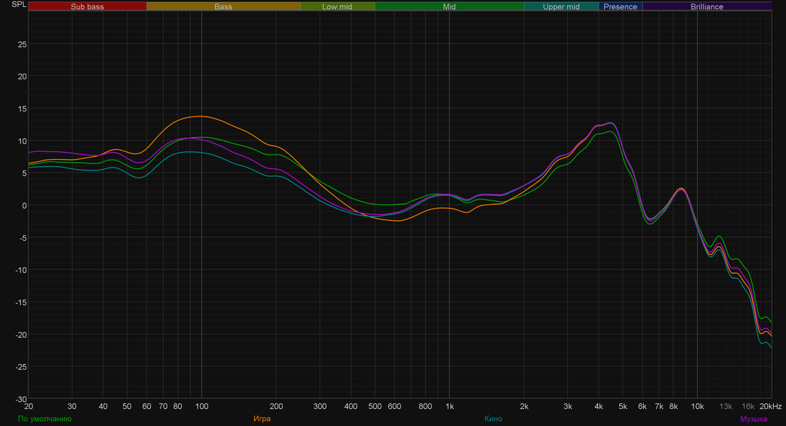 Встроенный в приложение эквалайзер работает, но крайне деликатно — серьезно повлиять на частотный баланс он не способен. Для примера посмотрим на АЧХ при активации предустановленных профилей.