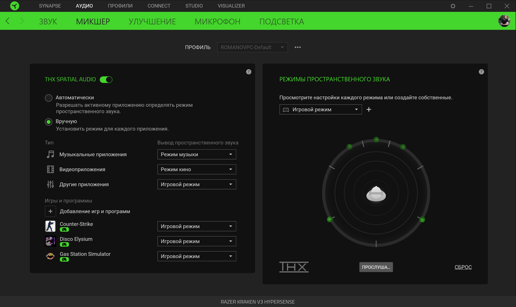 Технология THX Spatial Audio позволяет достичь «объемного звука» в наушниках, оборудованных всего парой динамиков, при этом работать она может не только с устройствами Razer — в меню справа можно выбрать, какое устройство будет использоваться, если гарнитура отключена. Сразу отметим, что для работы THX Spatial Audio потребуется установка отдельного приложения — система сама предложит сделать это. При этом поддерживает оно только 64-разрядную версию Windows 10.
