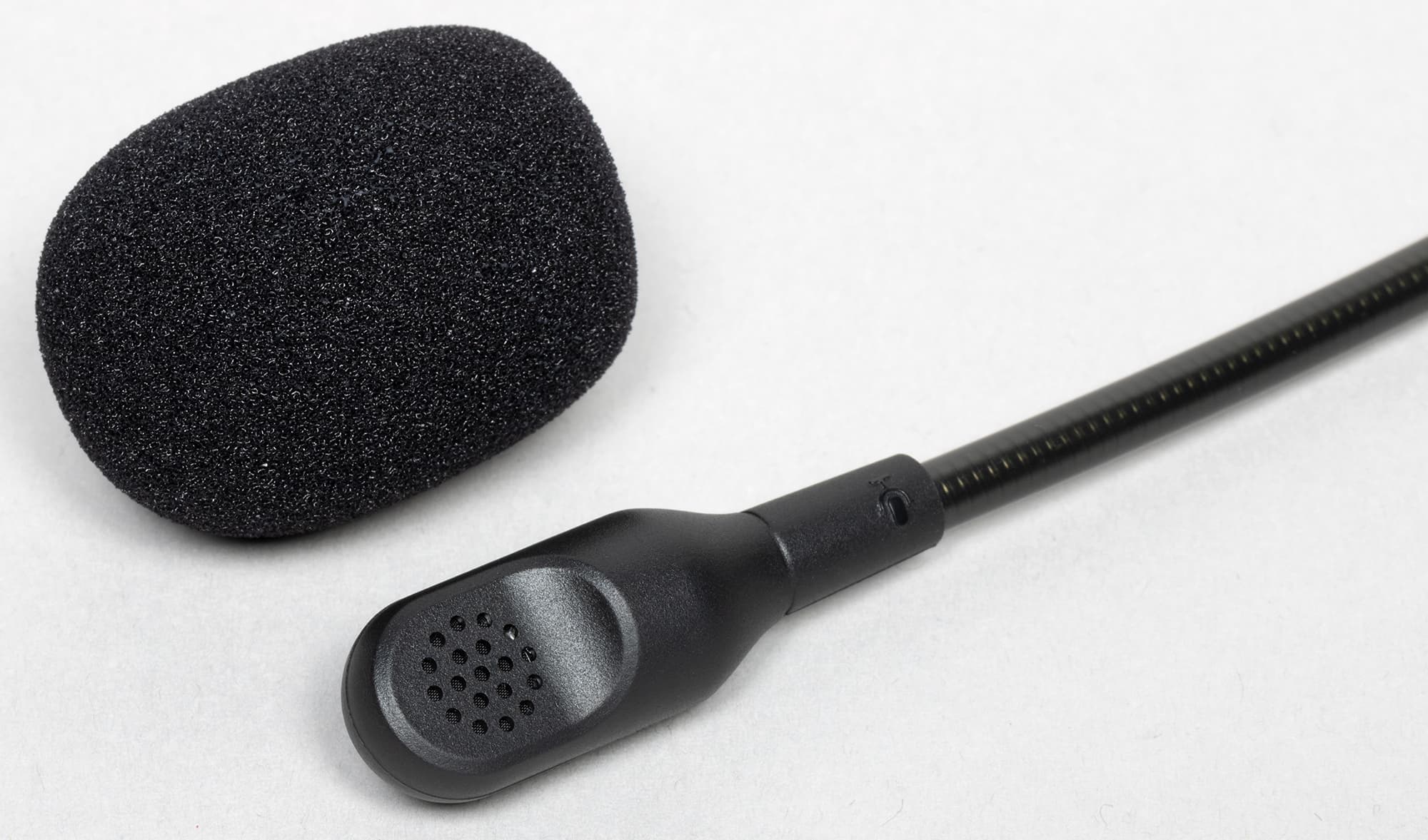 Микрофон съемный, подключение осуществляется через миниджек, гибкая «гусиная ножка» длиной 10 см позволяет удобным образом разместить его напротив рта при использовании гарнитуры.